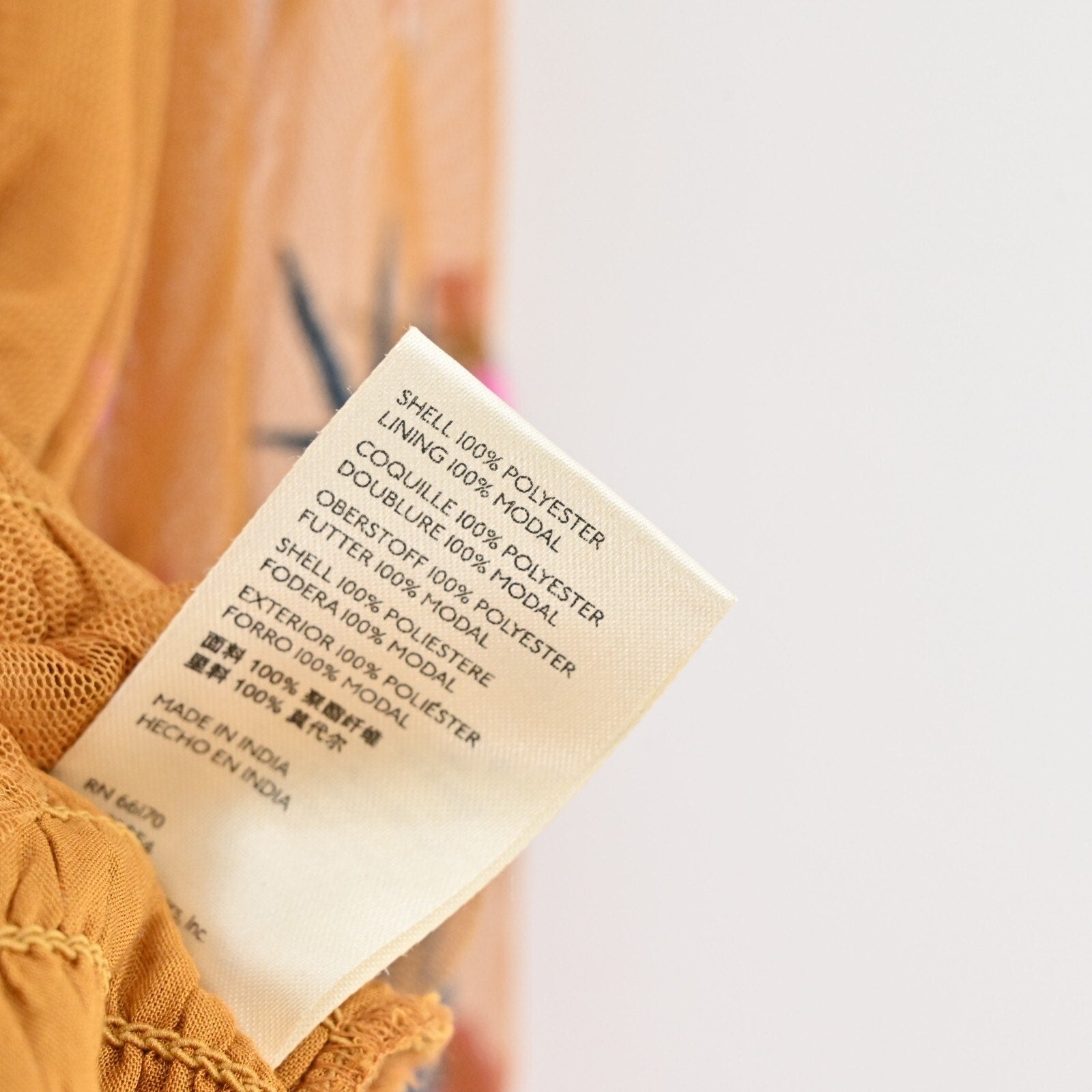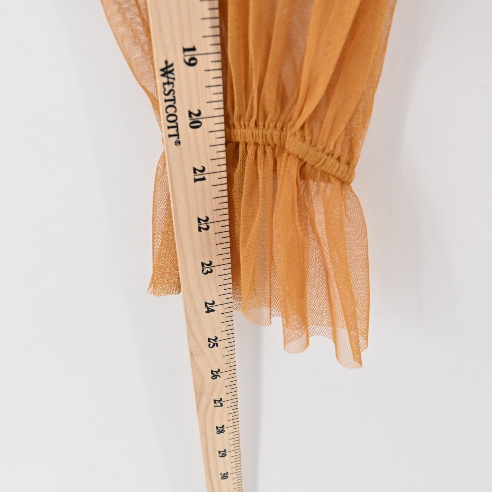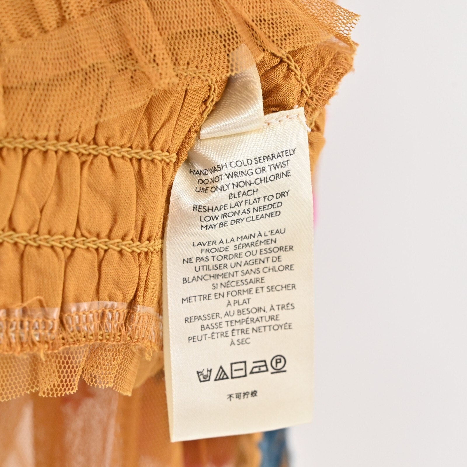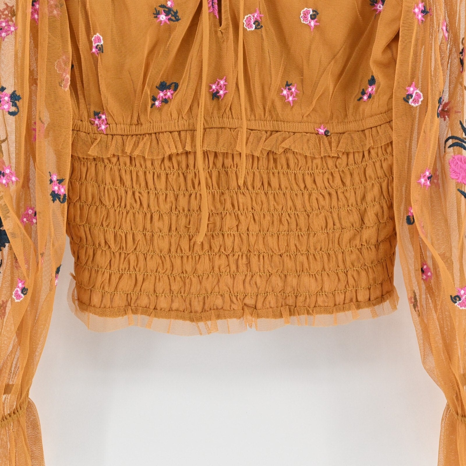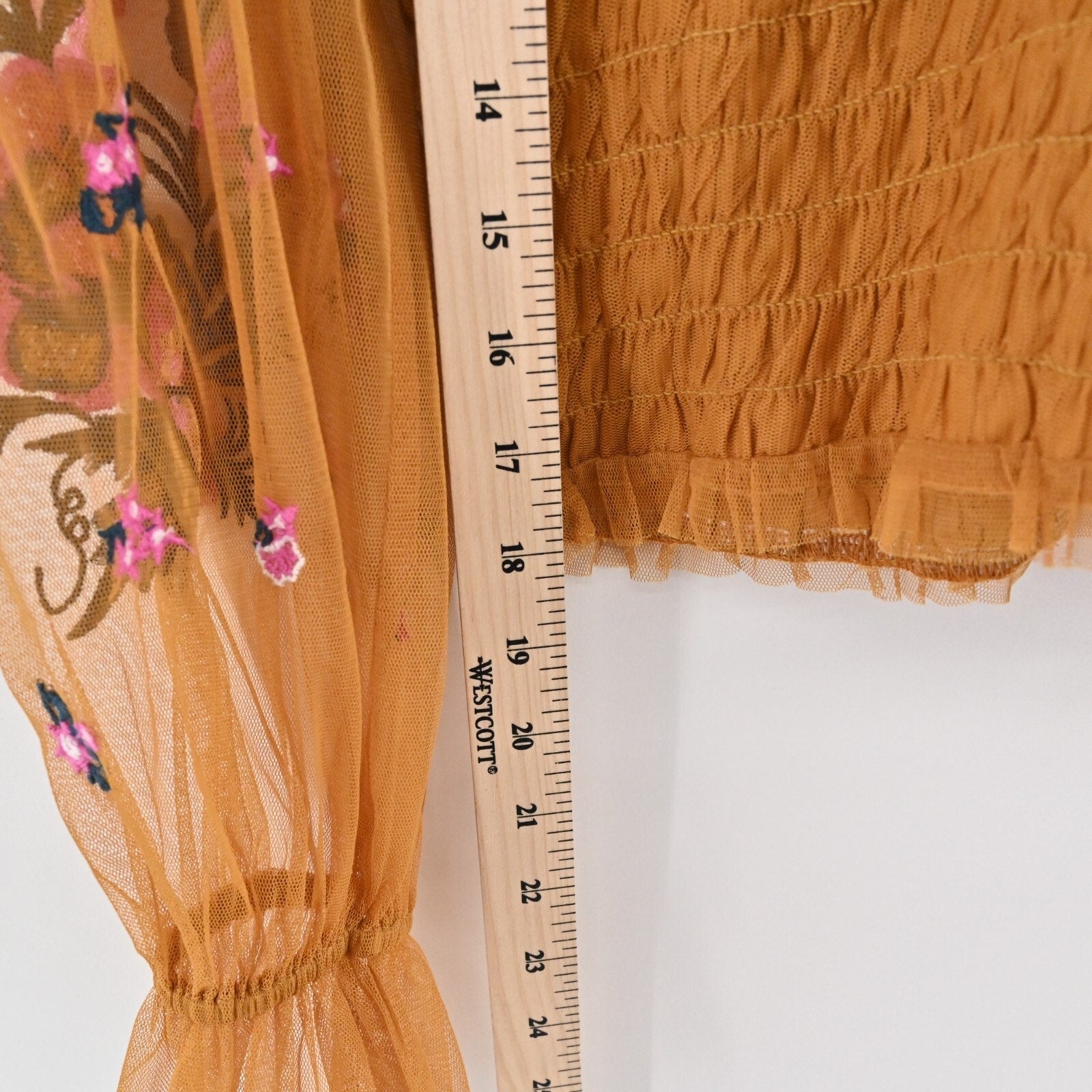 ANTHROPOLOGIE Floral Embroidered Top Womens Size XS Smocked Tulle Brown Blouse