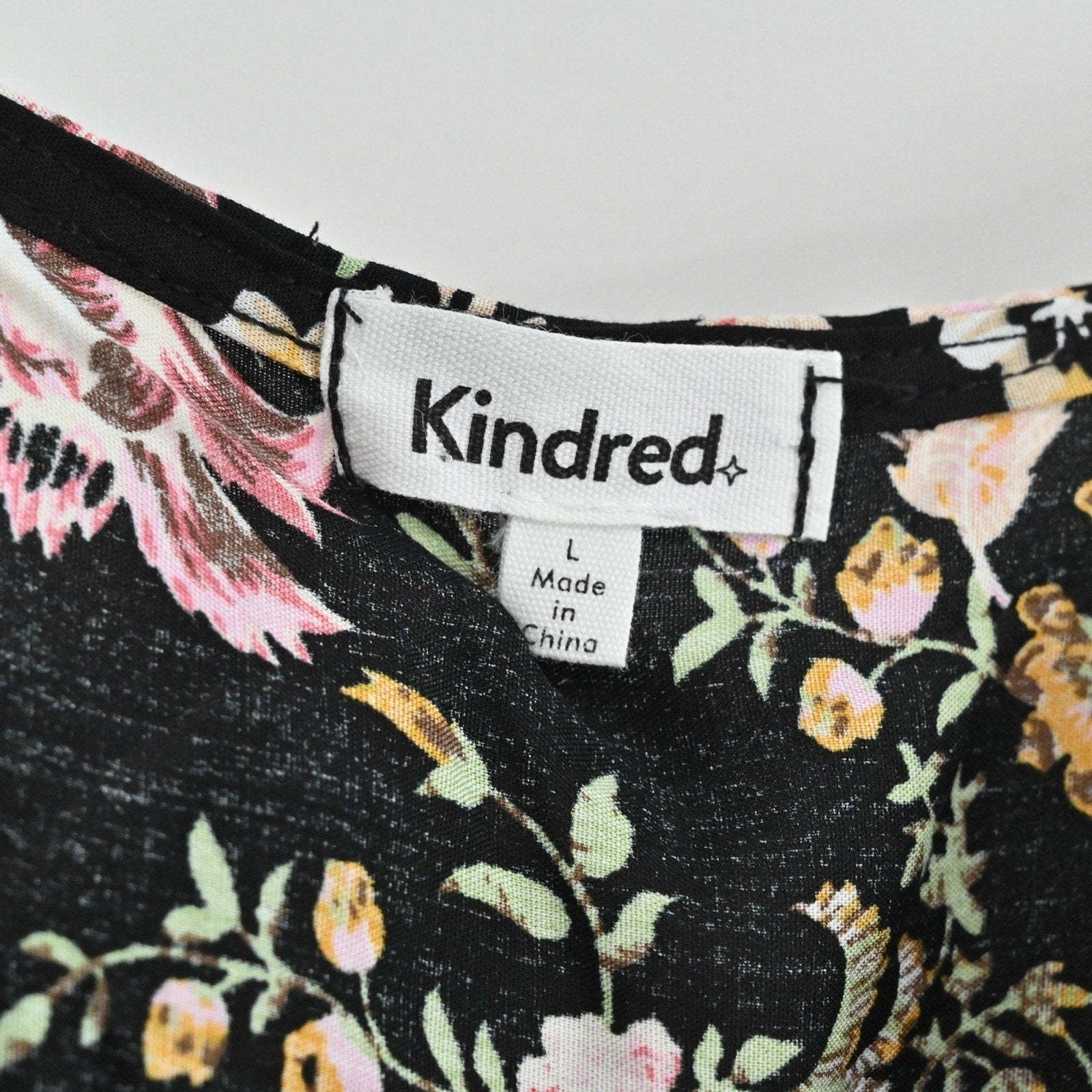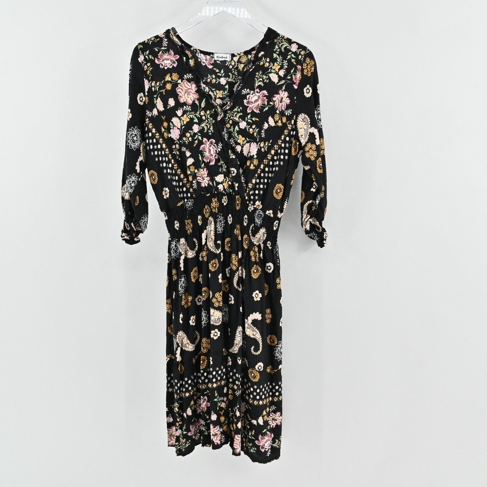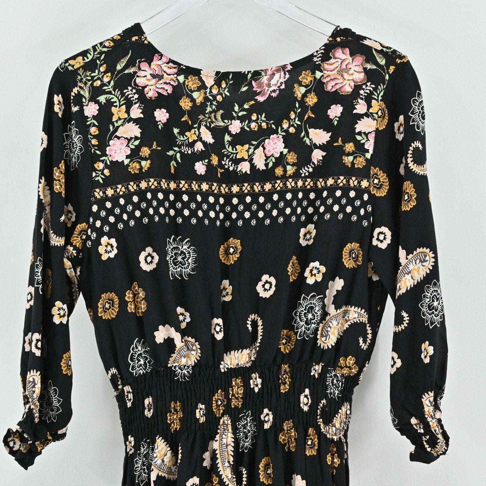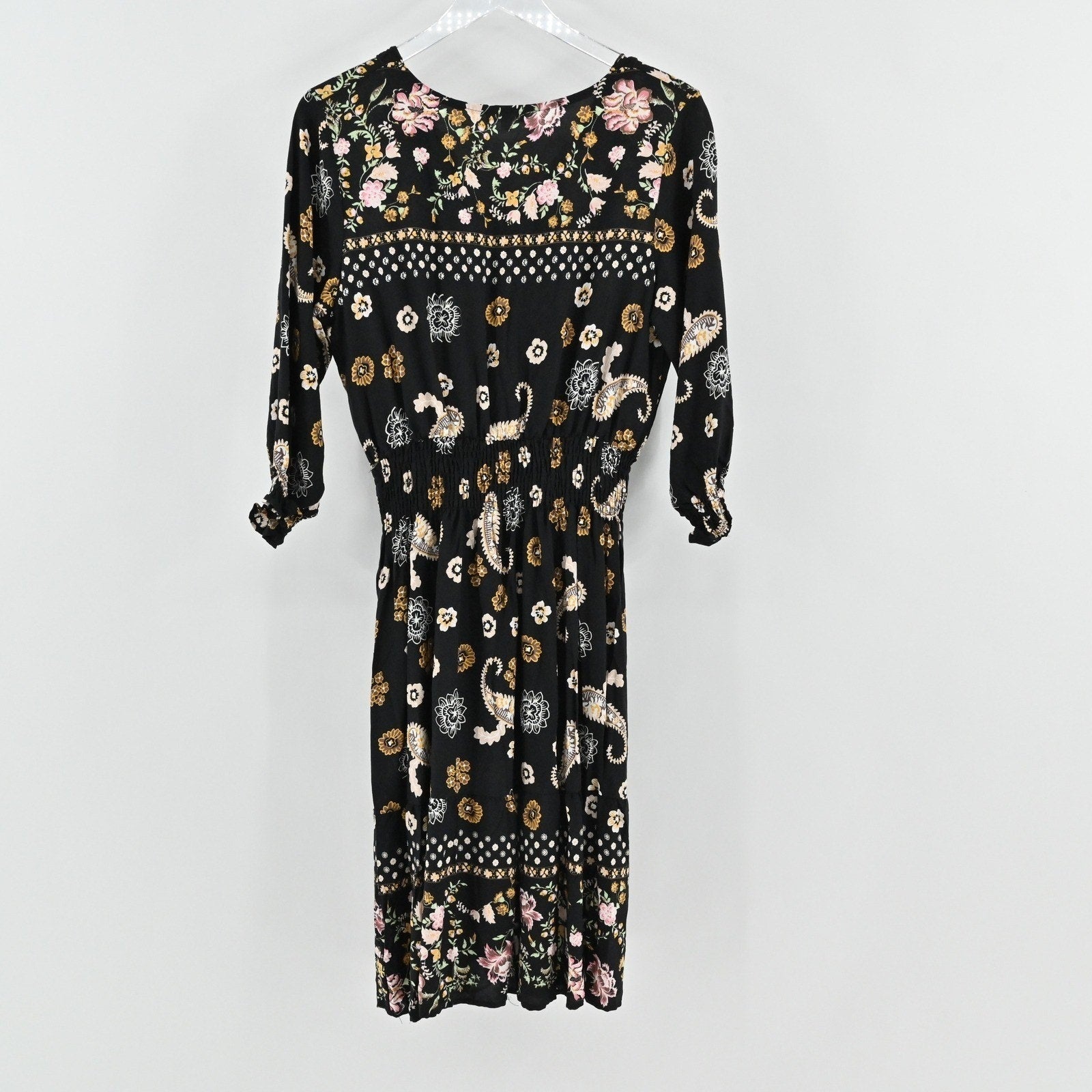 Anthropologie Kindred Floral Paisley Dress Size L Bohemian Smocked Waist Black