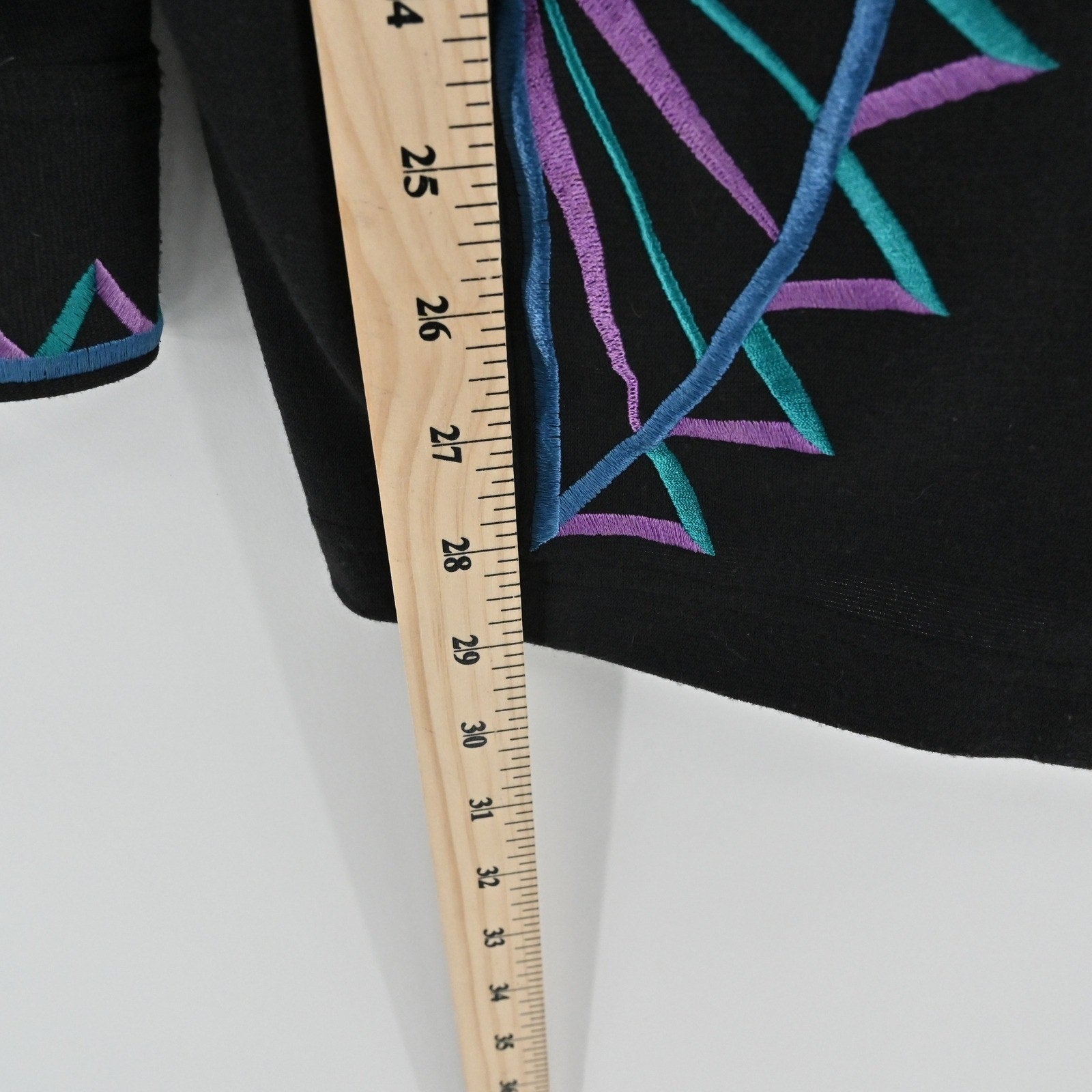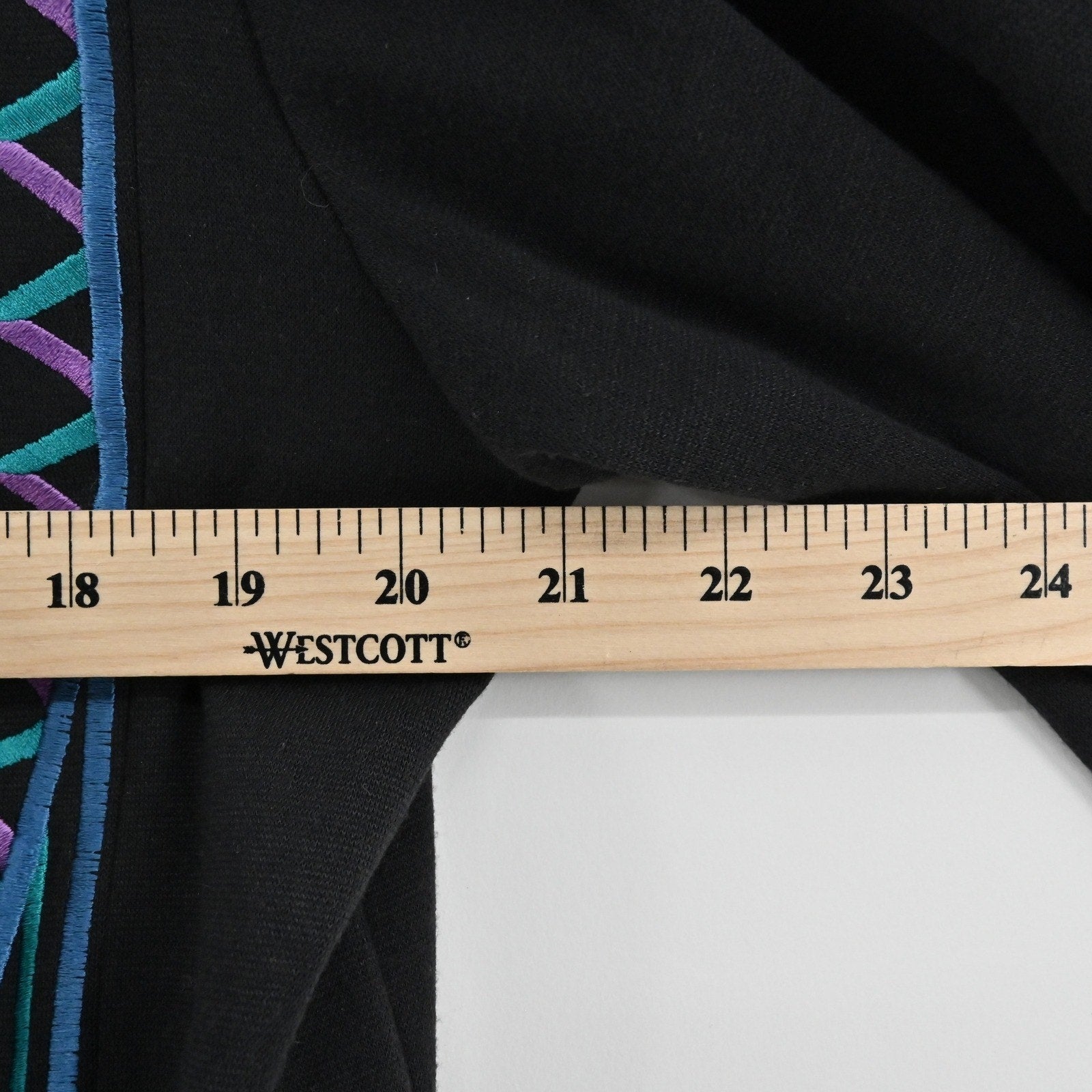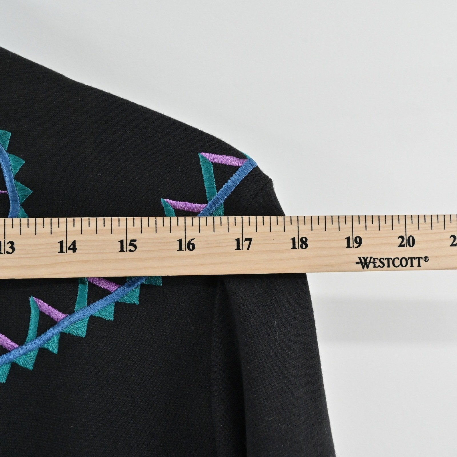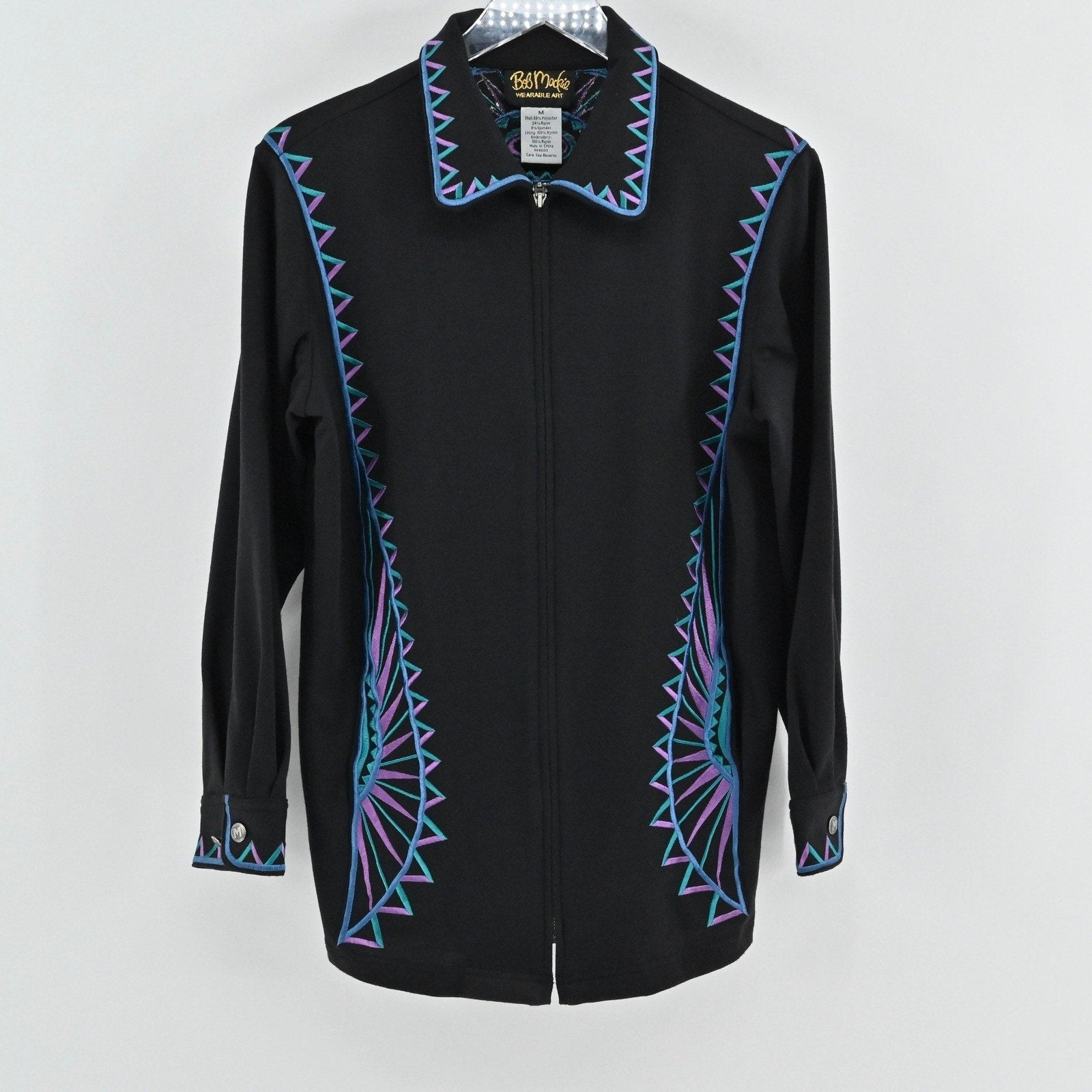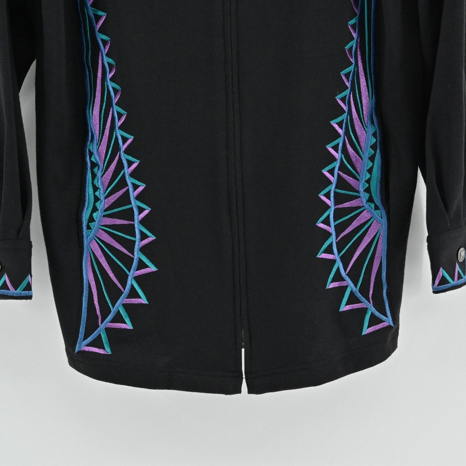 Style Profile: Artwear Embroidered Jacket BobMackie Wearable Art Black Teal Purple Southwestern Geometric Statement Boho Retro 1990s Athleisure AvantGarde Whimsigoth Artistic Couture Wearable Sculpture Vibrant Abstract
