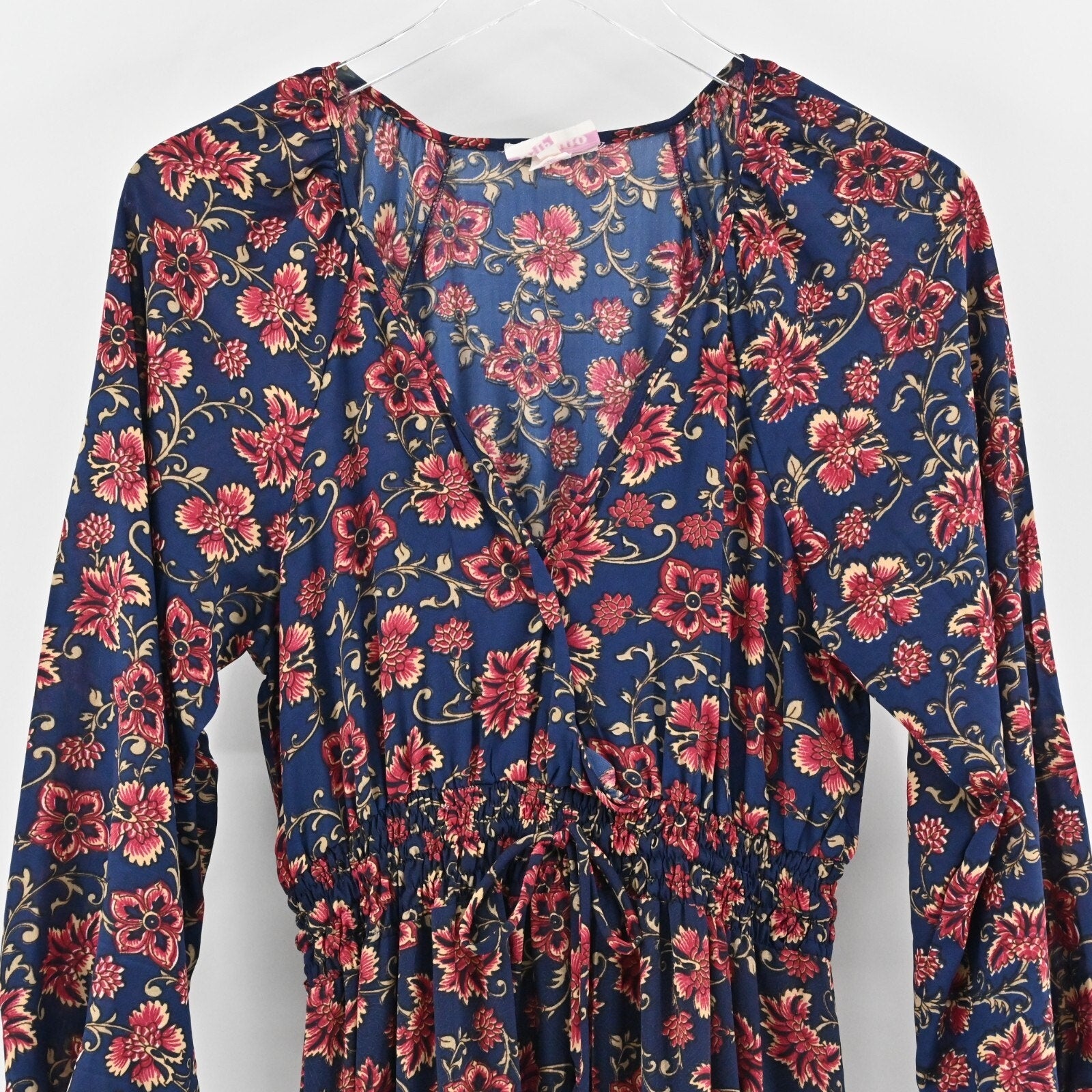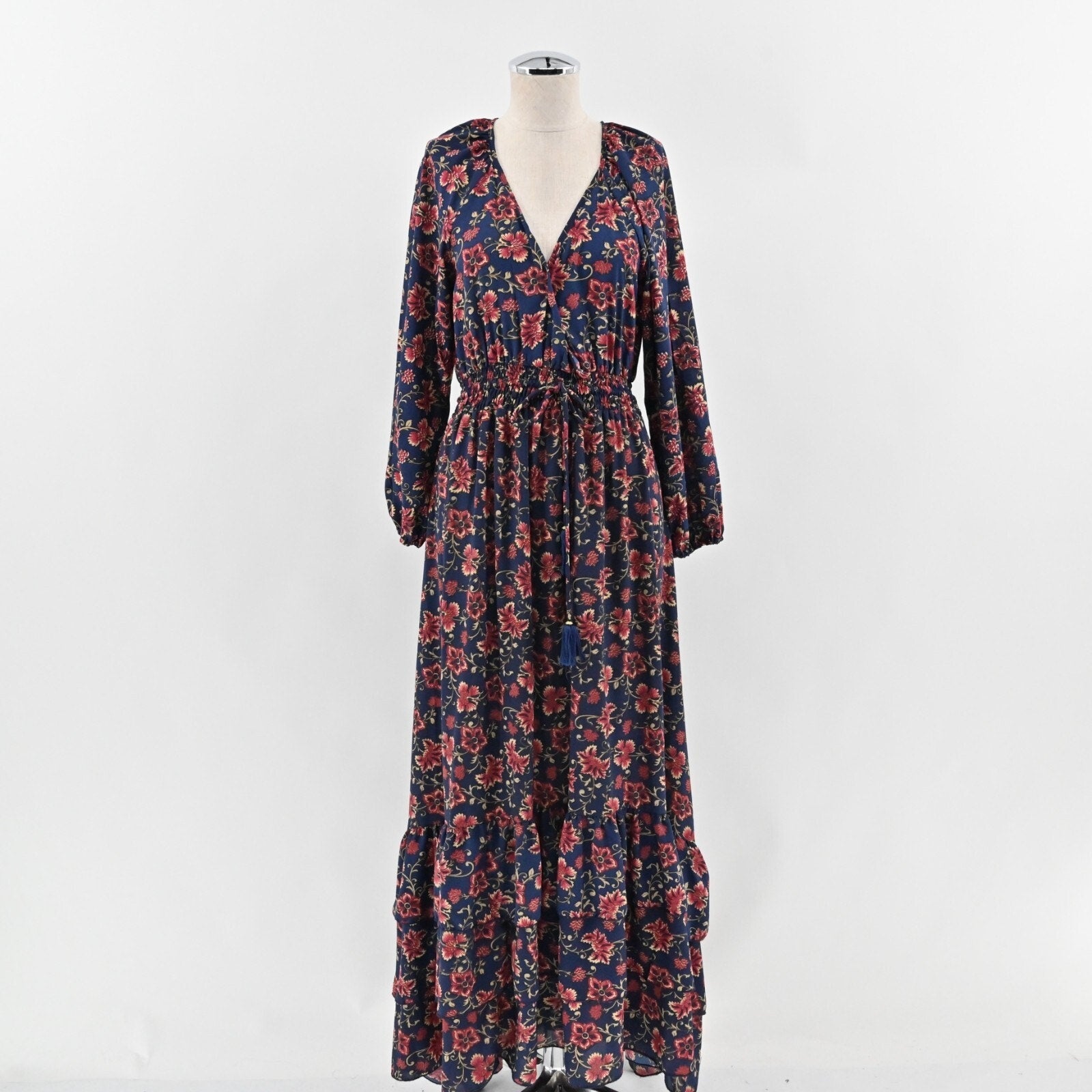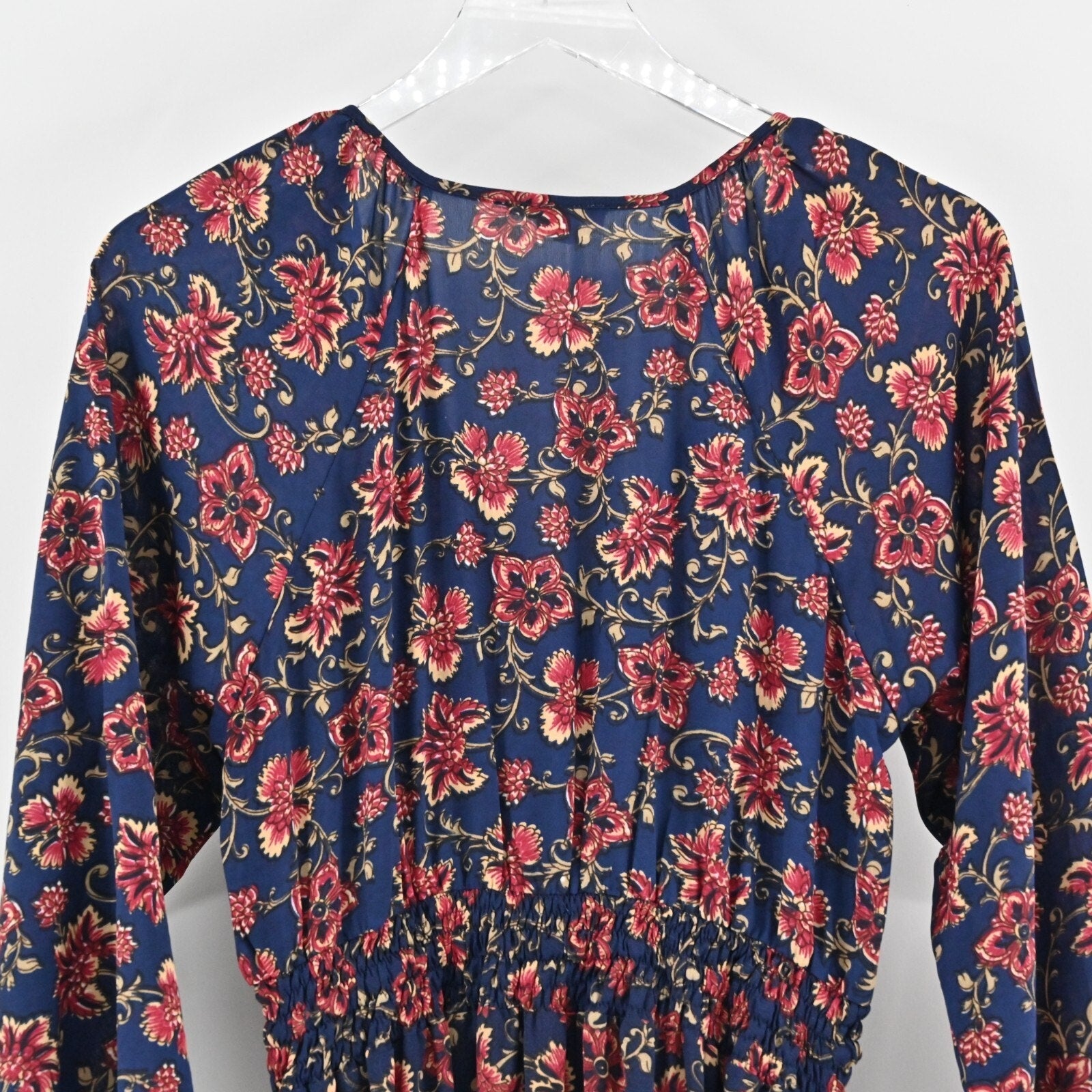 BOEMO Dress Size LP Navy Red Long Sleeve VNeck Tie Waist Floral Print Boho Maxi