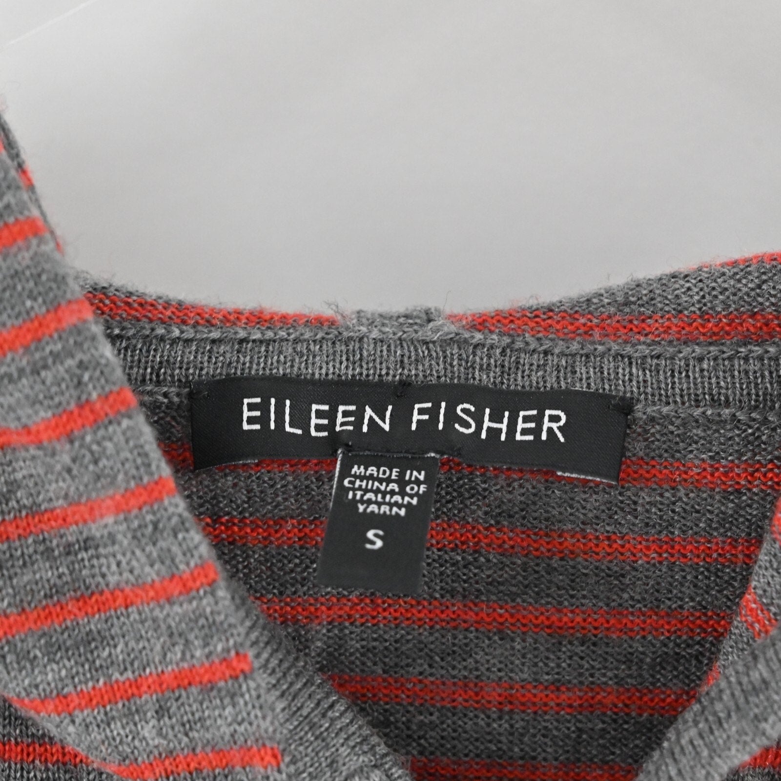Eileen Fisher Womens Merino Wool Sweater Small Gray Red Striped Hoodie Pullover