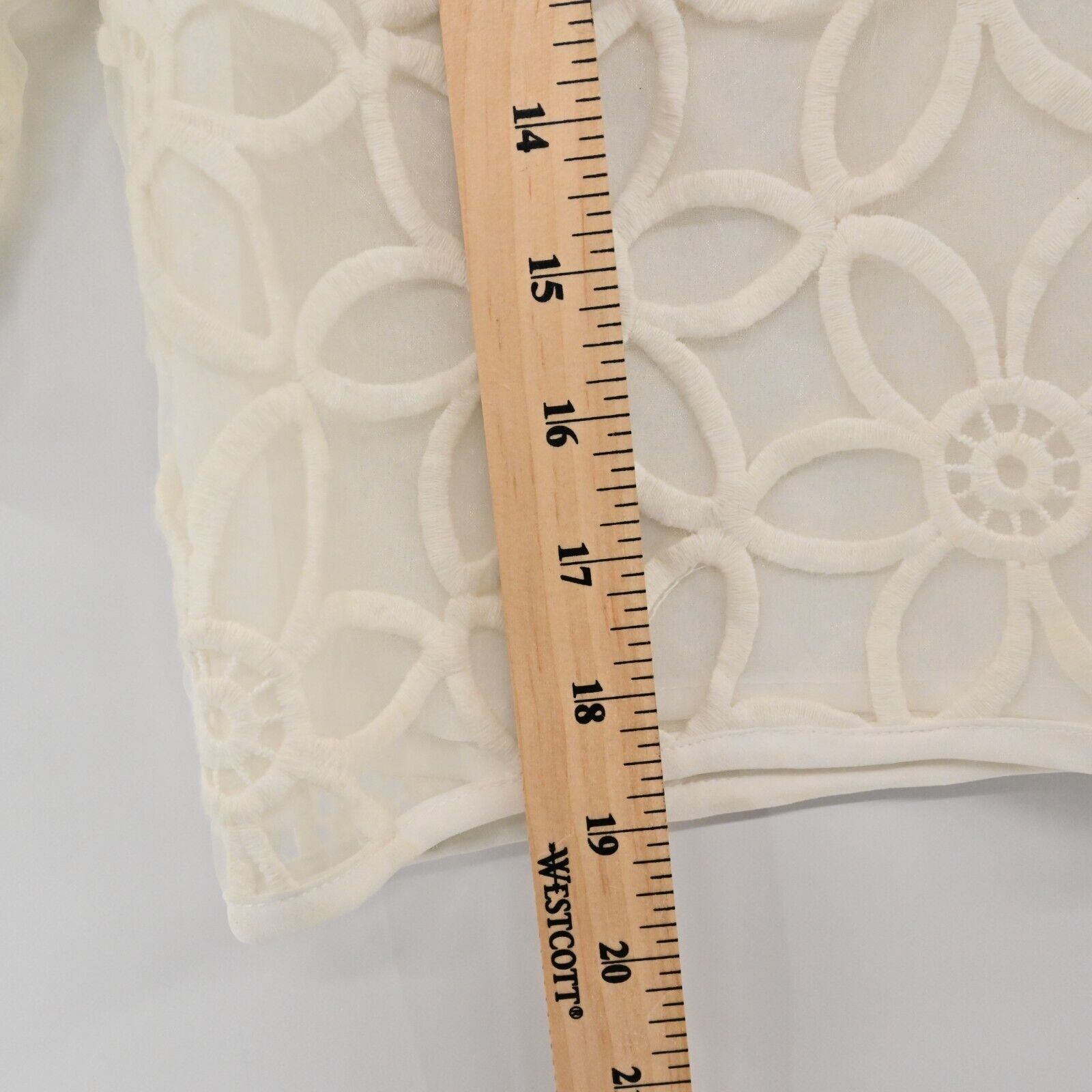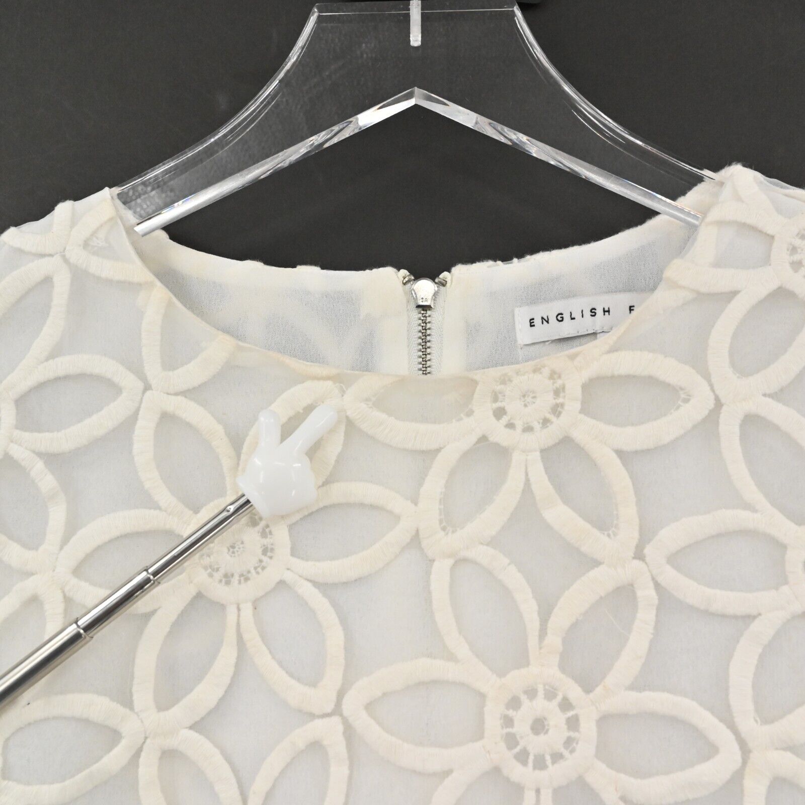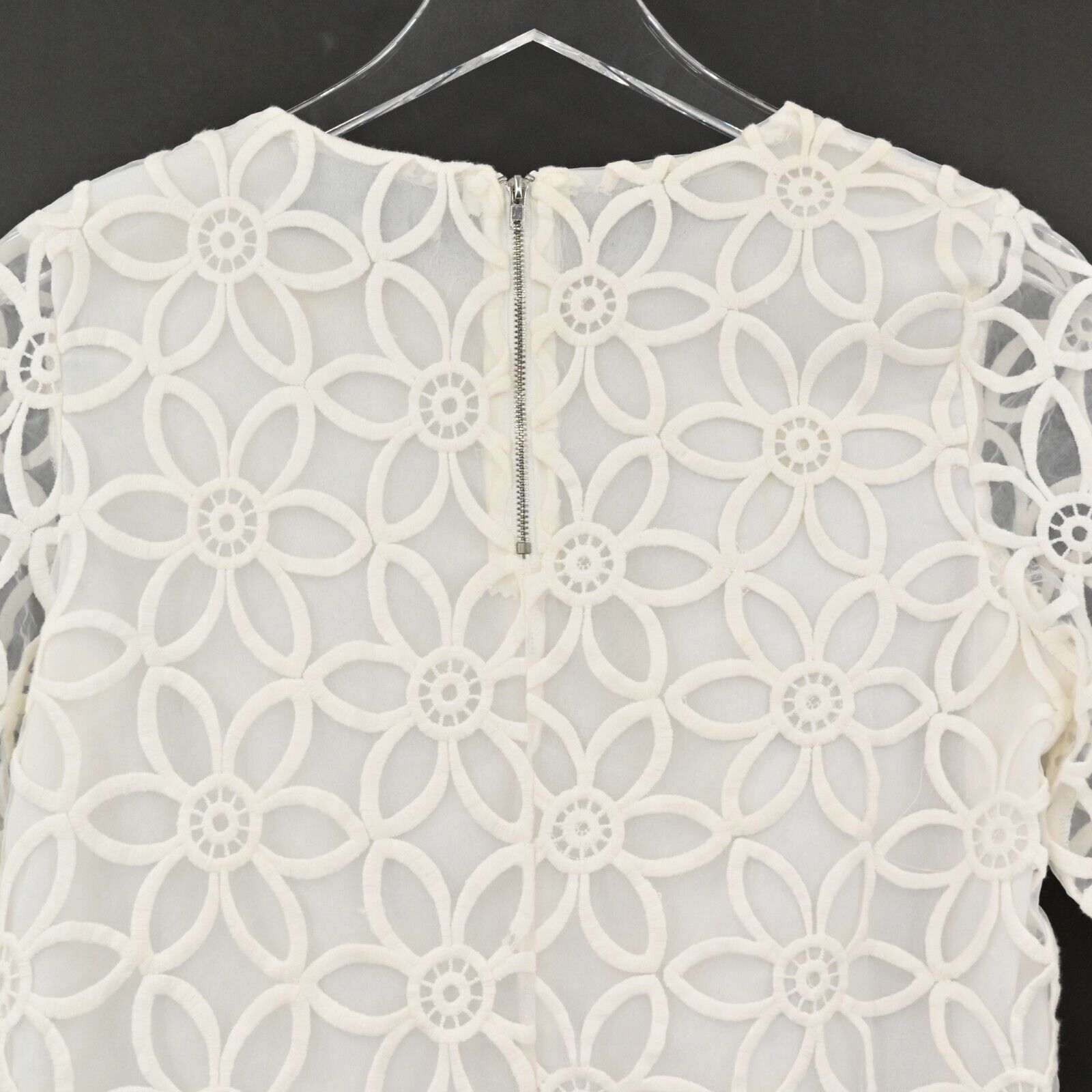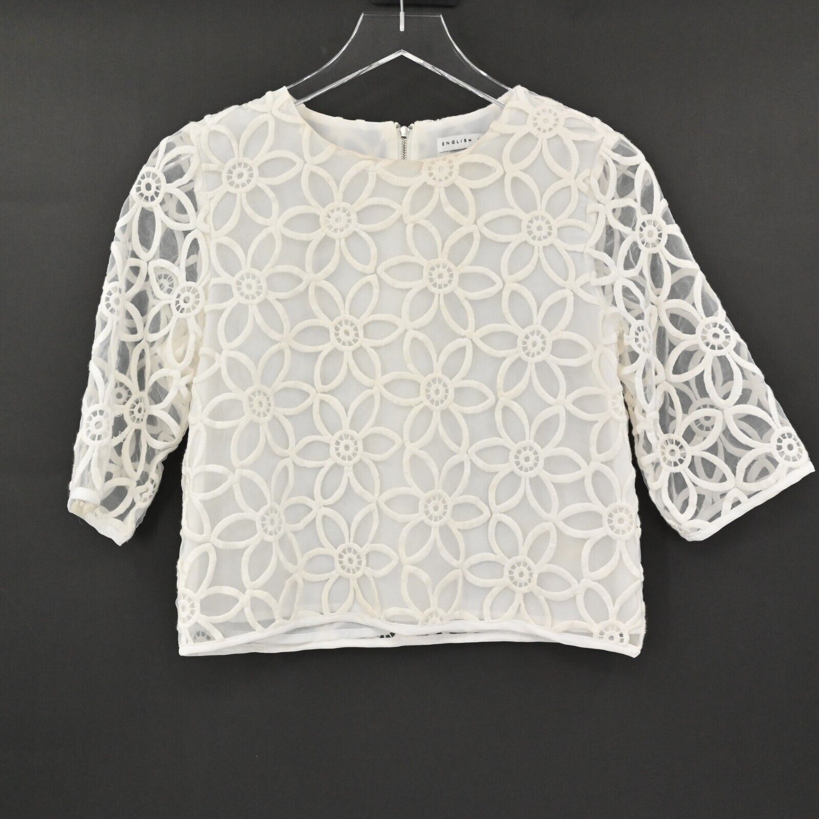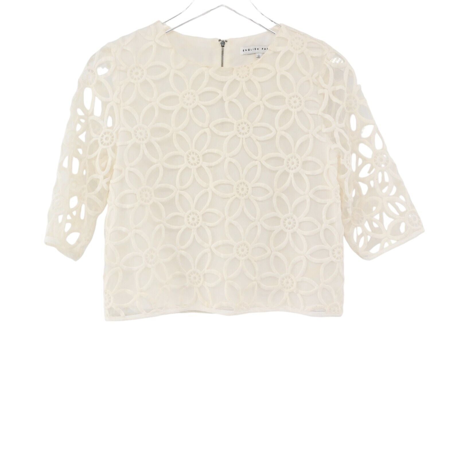 ENGLISH FACTORY Top Women's Size Small Sheer Sleeve Flower Print Cropped Blouse Lined Zip Back Half Sleeves Spring Summer Vacation Cruise Resort Preppy Chic Feminine Flirty Girly Coquette Unique Bride Bridal Party White Boxy Crop
