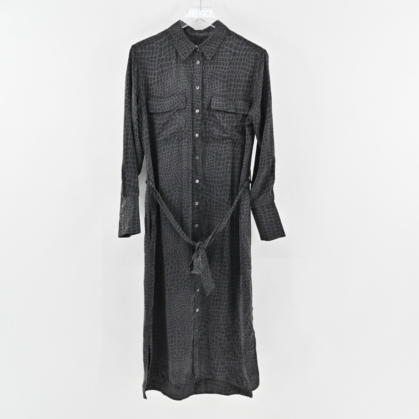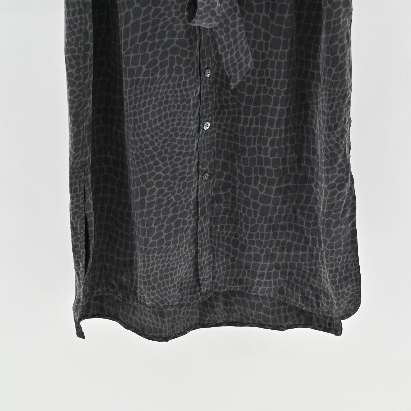 Style Profile: Lightweight Long Sleeve Vacation Travel Fall Winter Casual Chic Luxe Belt Tie Collar Comfort Femme Shirt Dress Belted Midi Button Front Collared Pocket Detail Charcoal Grey Animal Print Textured Fabric Modern Versatile Workwear Classic Flattering Silhouette Transitional Piece