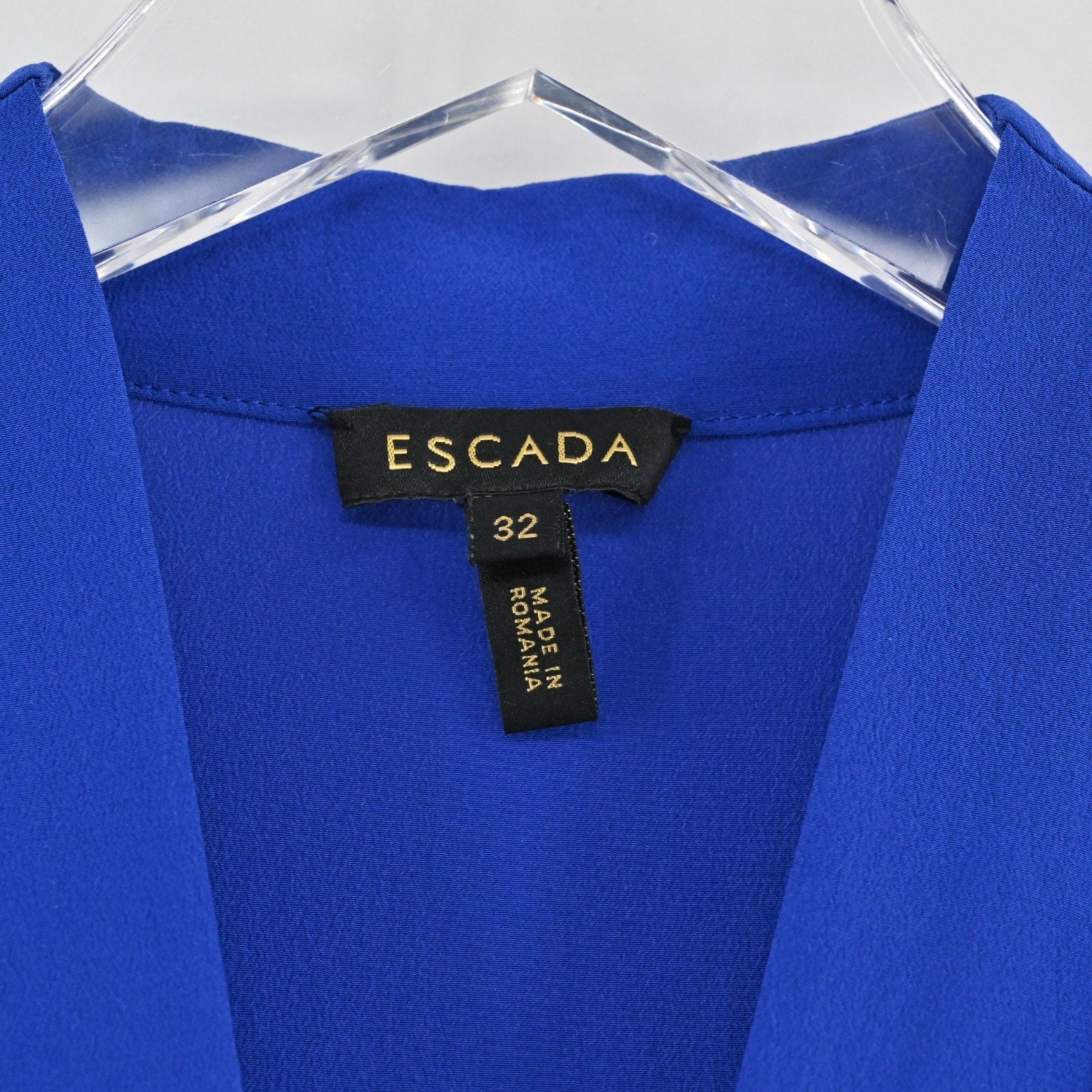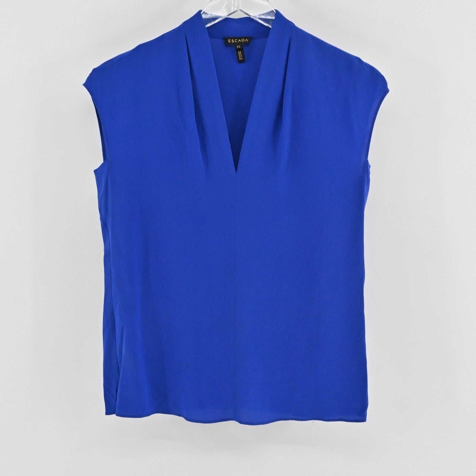 Escada Womens Silk Royal Blue Top Size 32 Sleeveless Pleated VNeck Blouse Siren