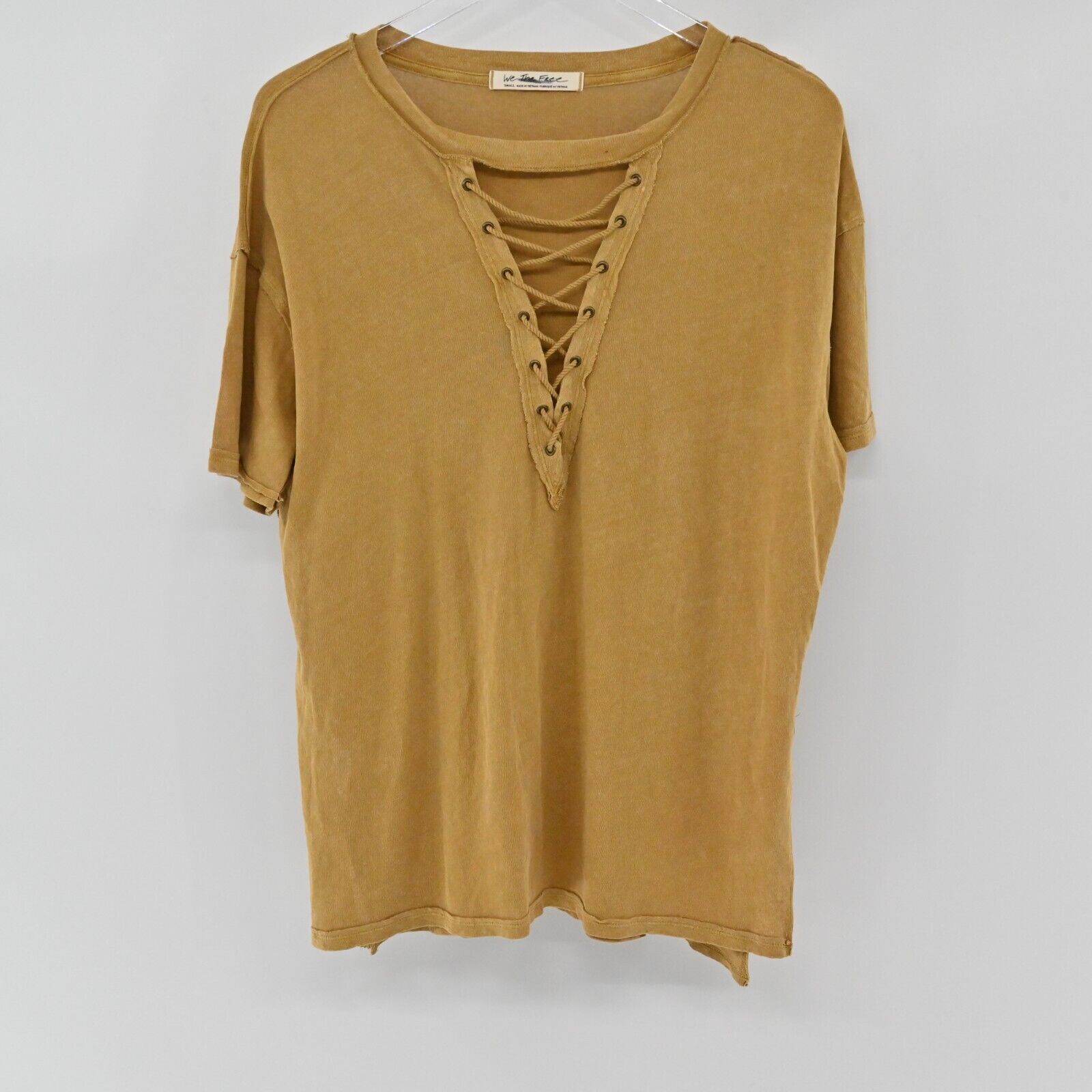 FREE PEOPLE Top Women's Size Small Azalea Lace Up Short Sleeve Shirt Mustard Bohemian We The Free Side Slit Detail Relaxed Oversized Fit Comfy Breathable Lightweight Boho BohoChic Fall Vacation Casual