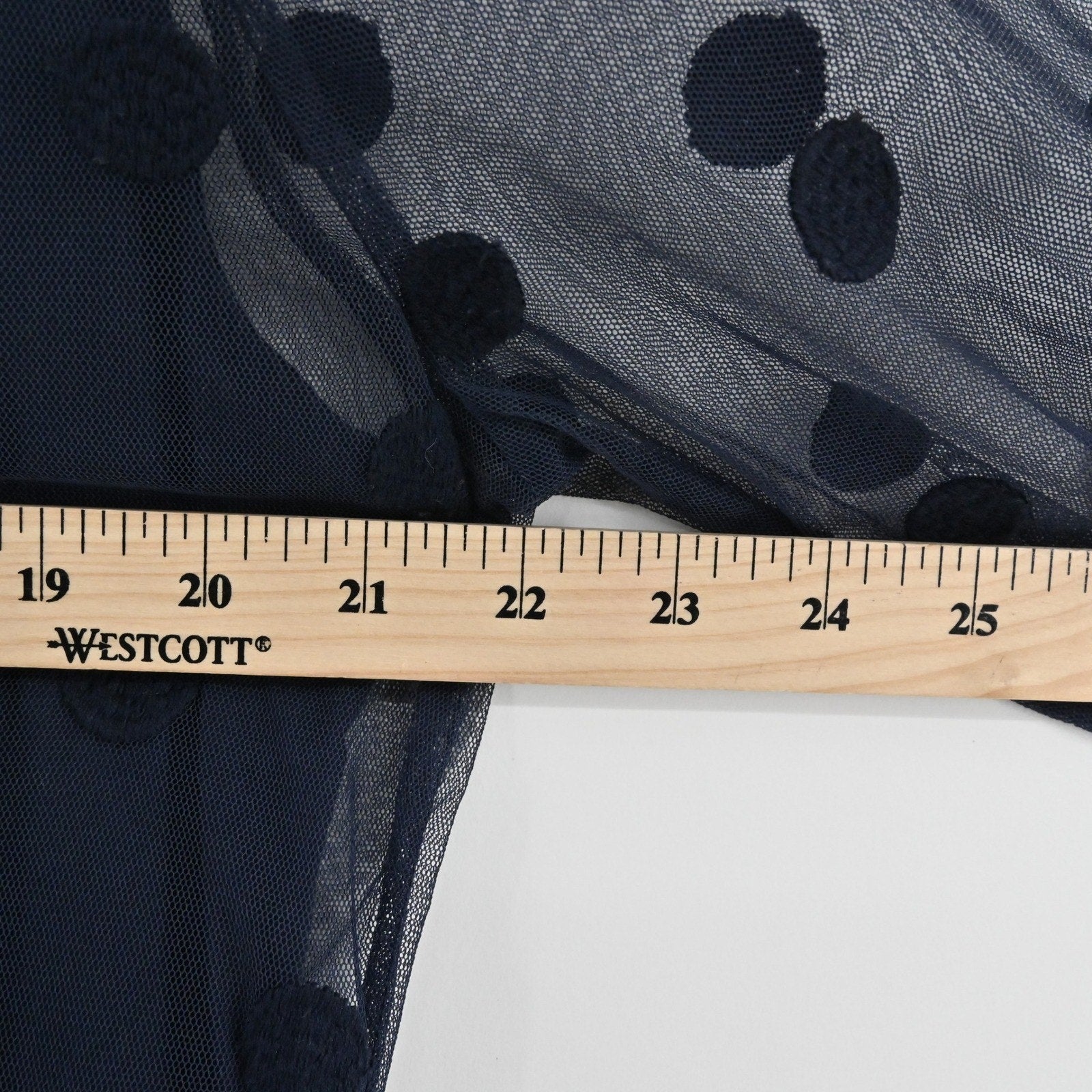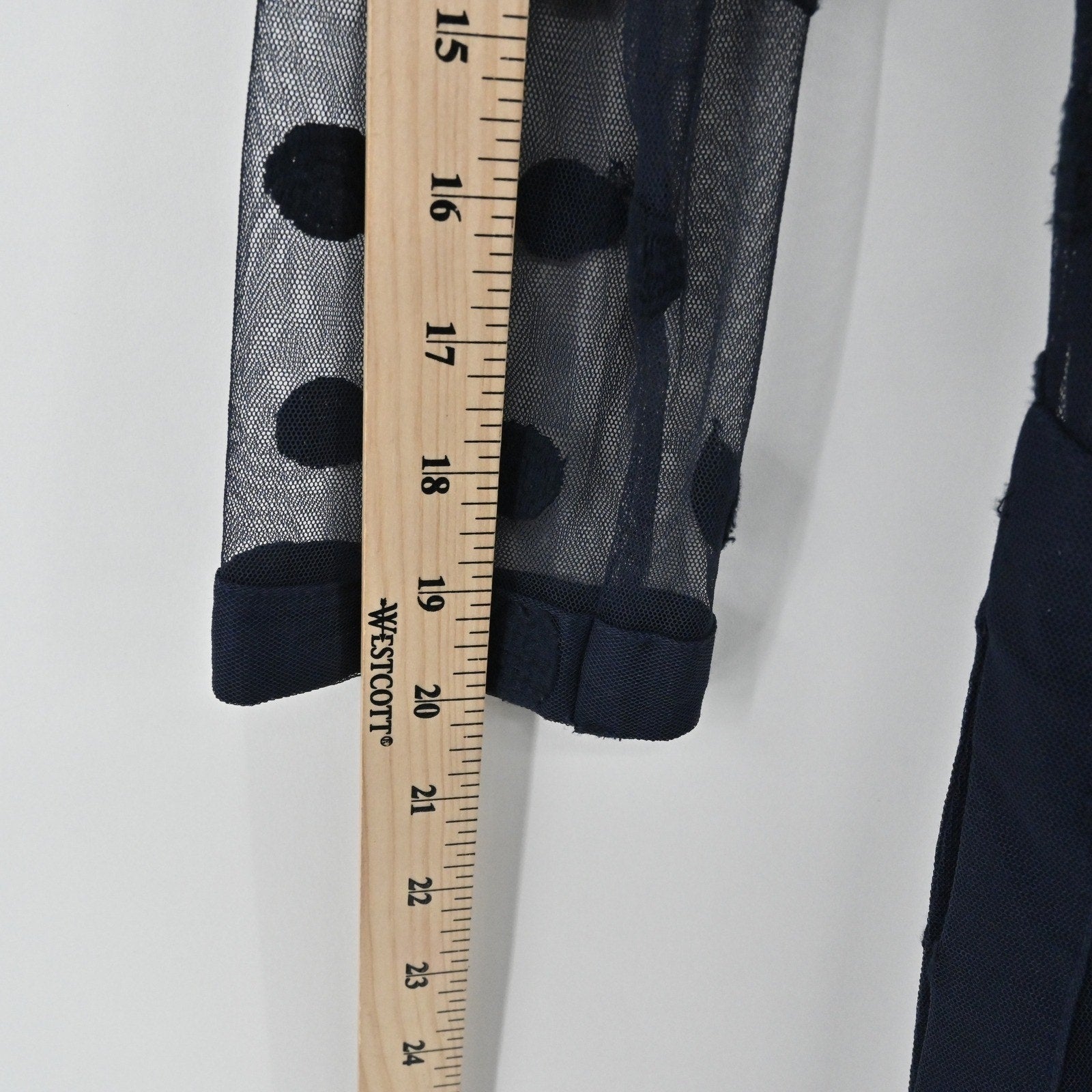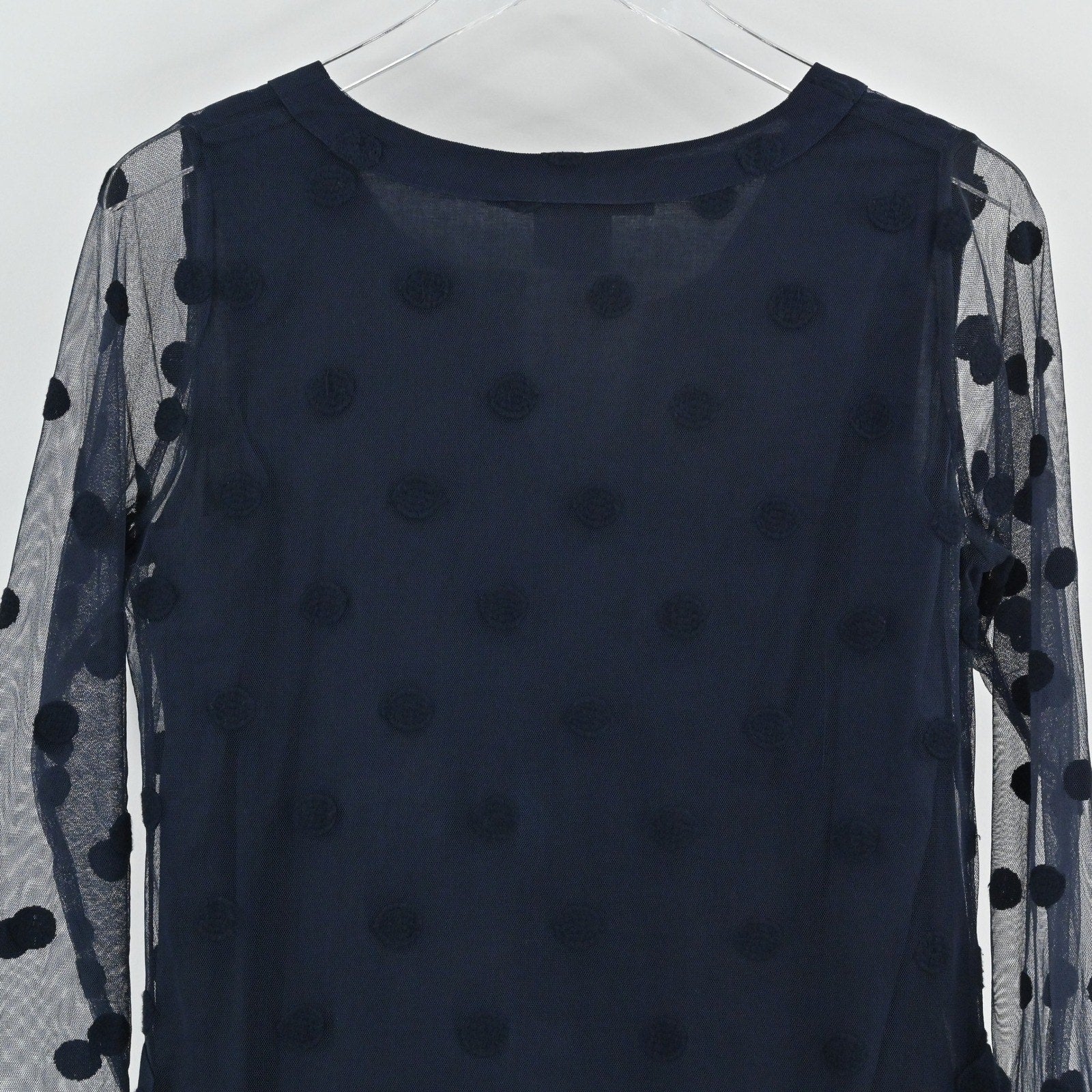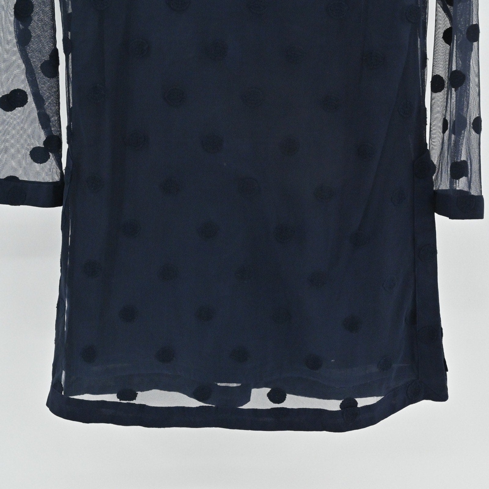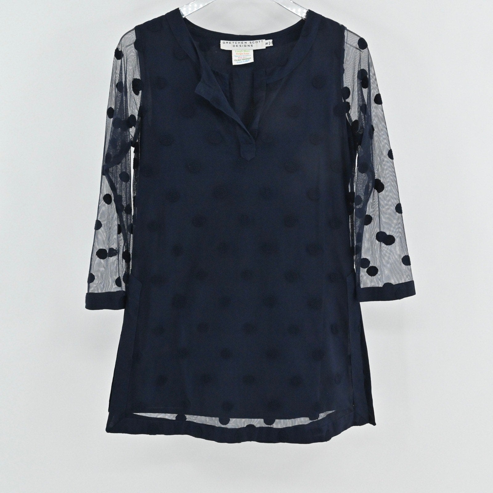 Gretchen Scott Womens Tunic Top Size S Navy Blue Polka Dot Mesh Overlay Delicate