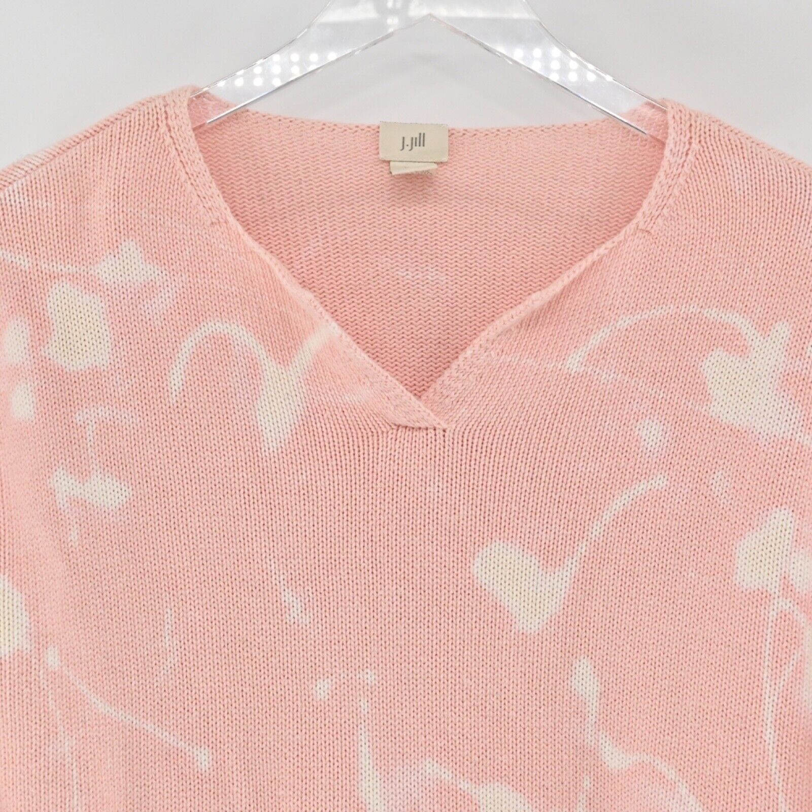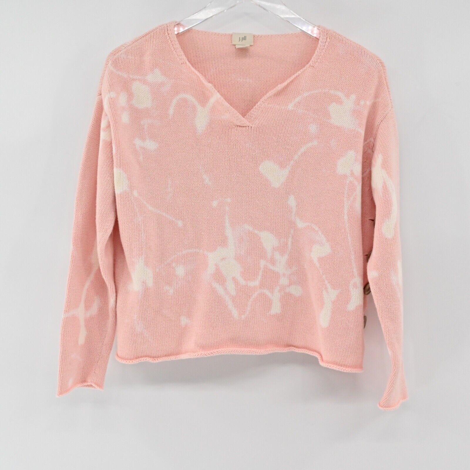 J. JILL Sweater Women's Size XS Petite Pink White Bleach Splatter 100% Cotton Cross V-neck Side Button Pullover Bohemian Boho Grunge