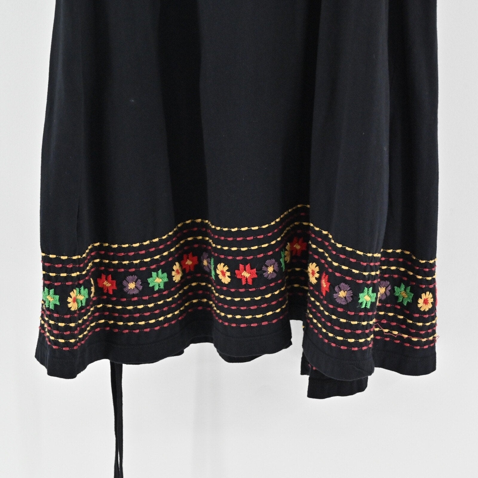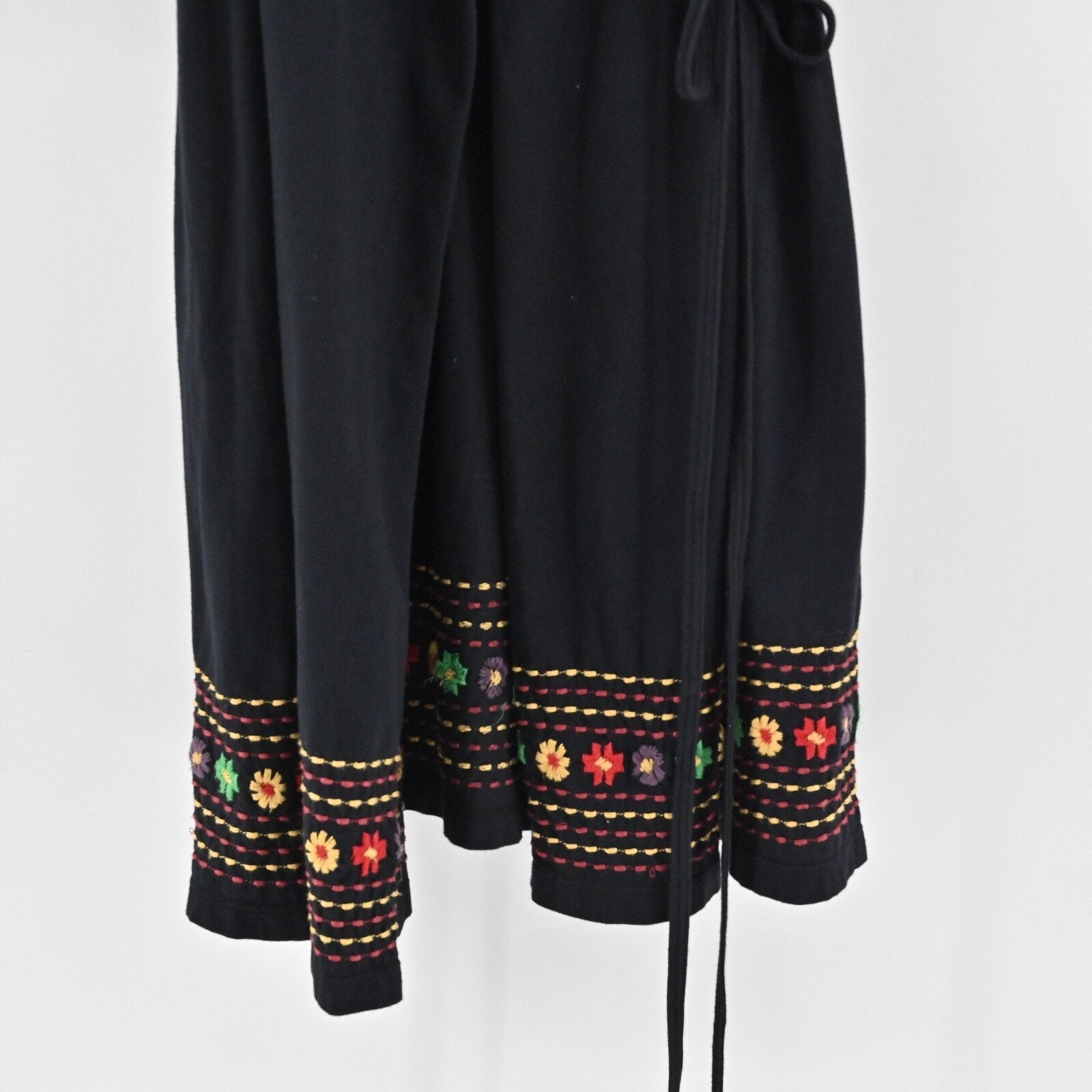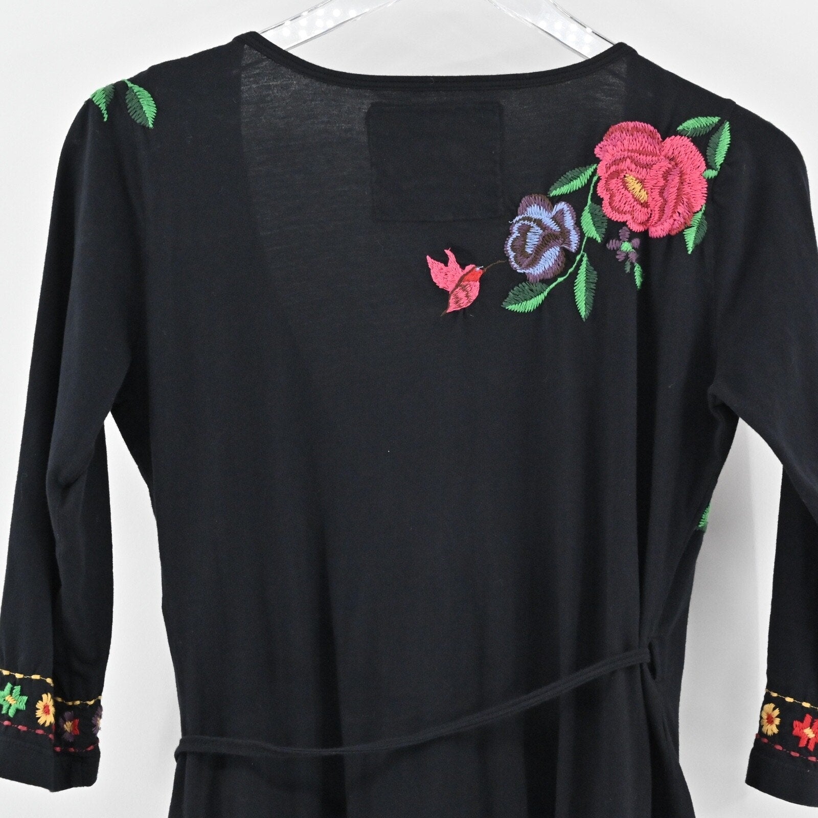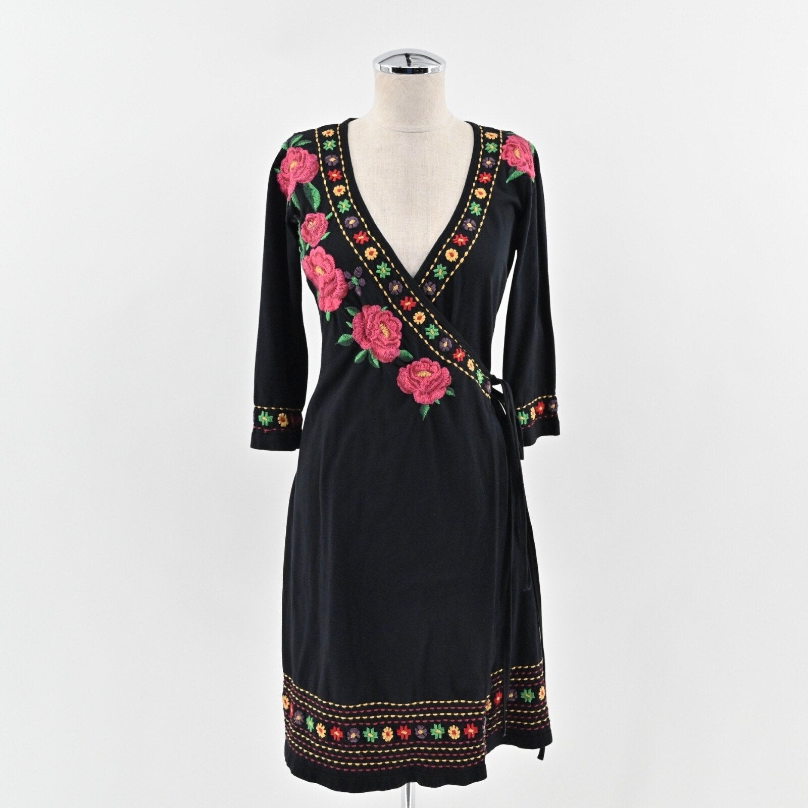 JOHNNY WAS Embroidered Wrap Dress Size S Black Floral Cotton V Neck 3/4 Sleeve