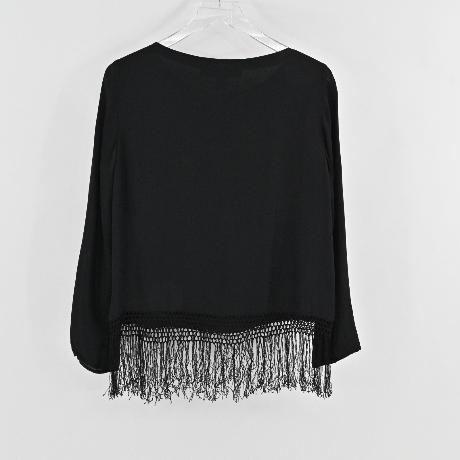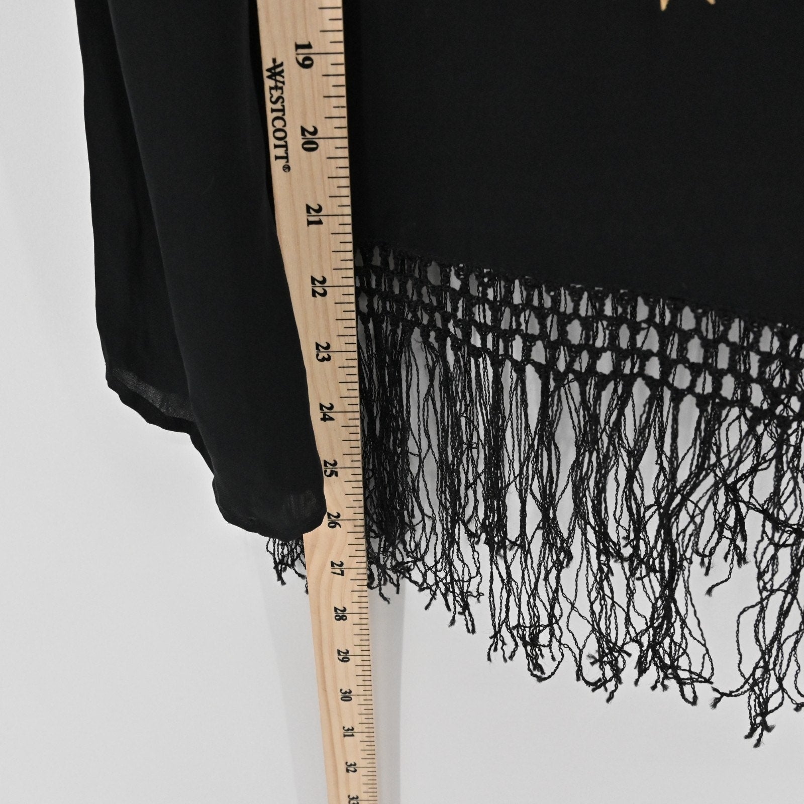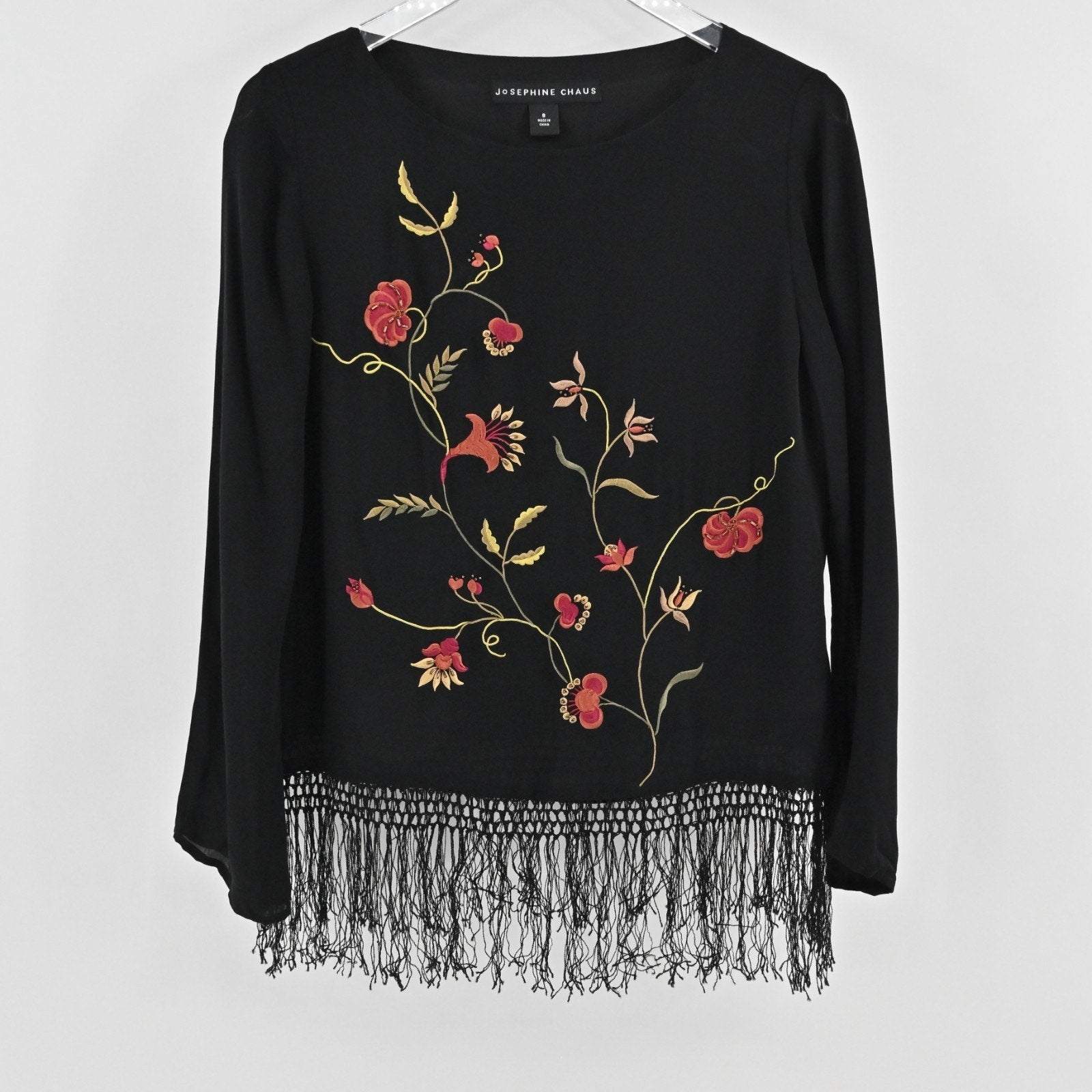 Josephine Chaus Womens Silk Top Size 8 Black Floral Embroidered Fringe Trim Boho
