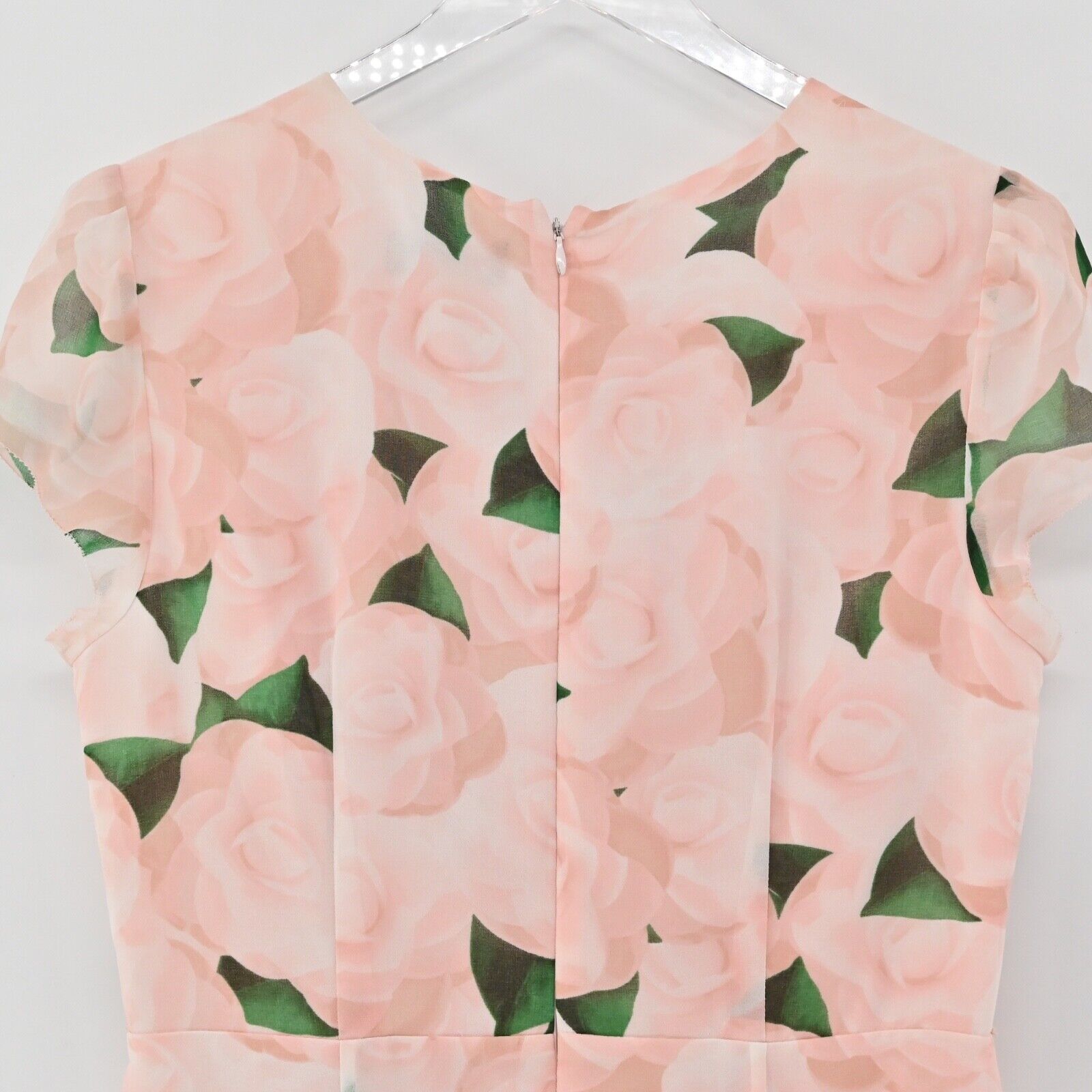 KARL LAGERFELD PARIS Dress Women's Size 8 Pink Floral Chiffon V-neck Short Ruffle Flutter Sleeve Faux Wrap Concealed Back Zipper Hook & Eye Closure Lined Retro Preppy Garden Party Wedding