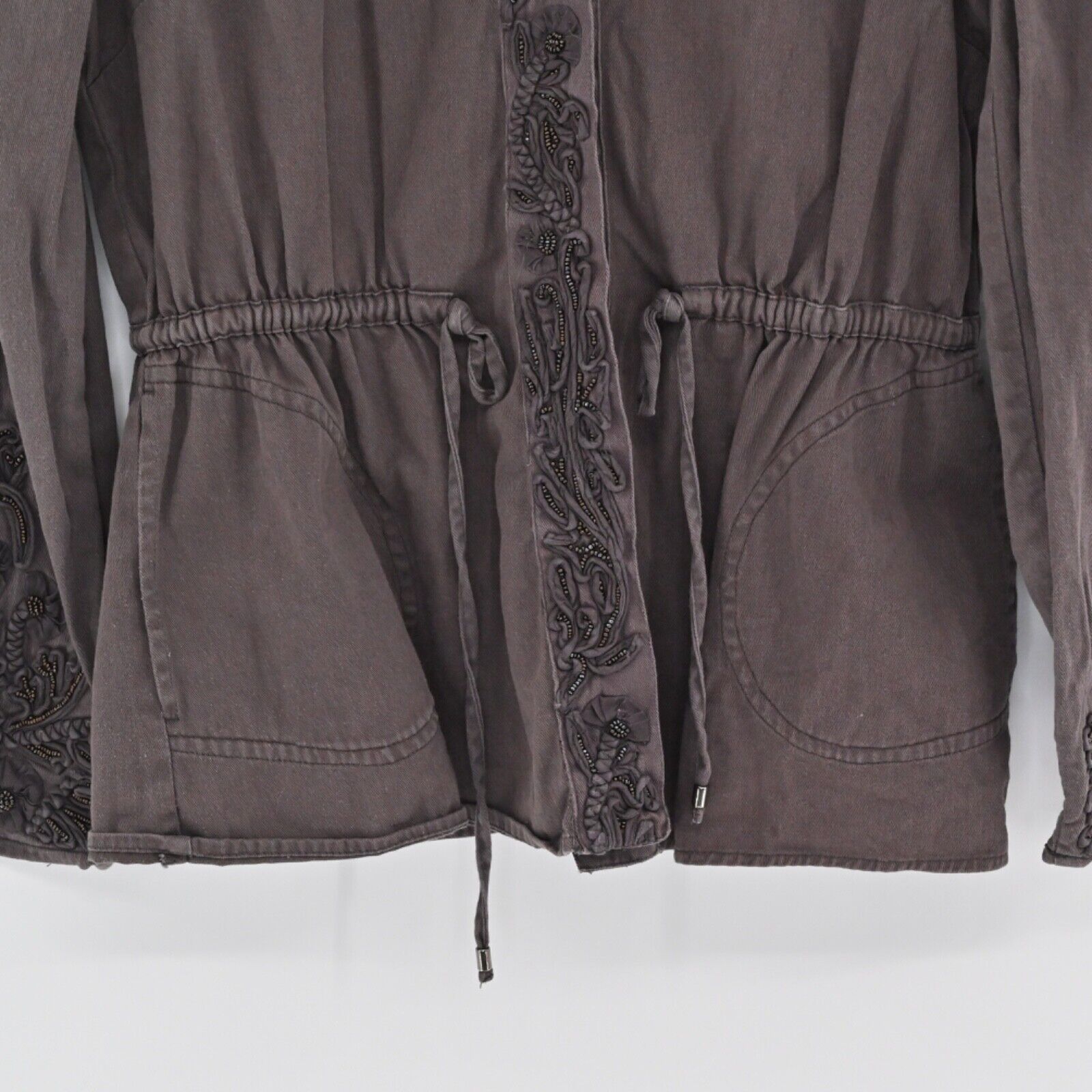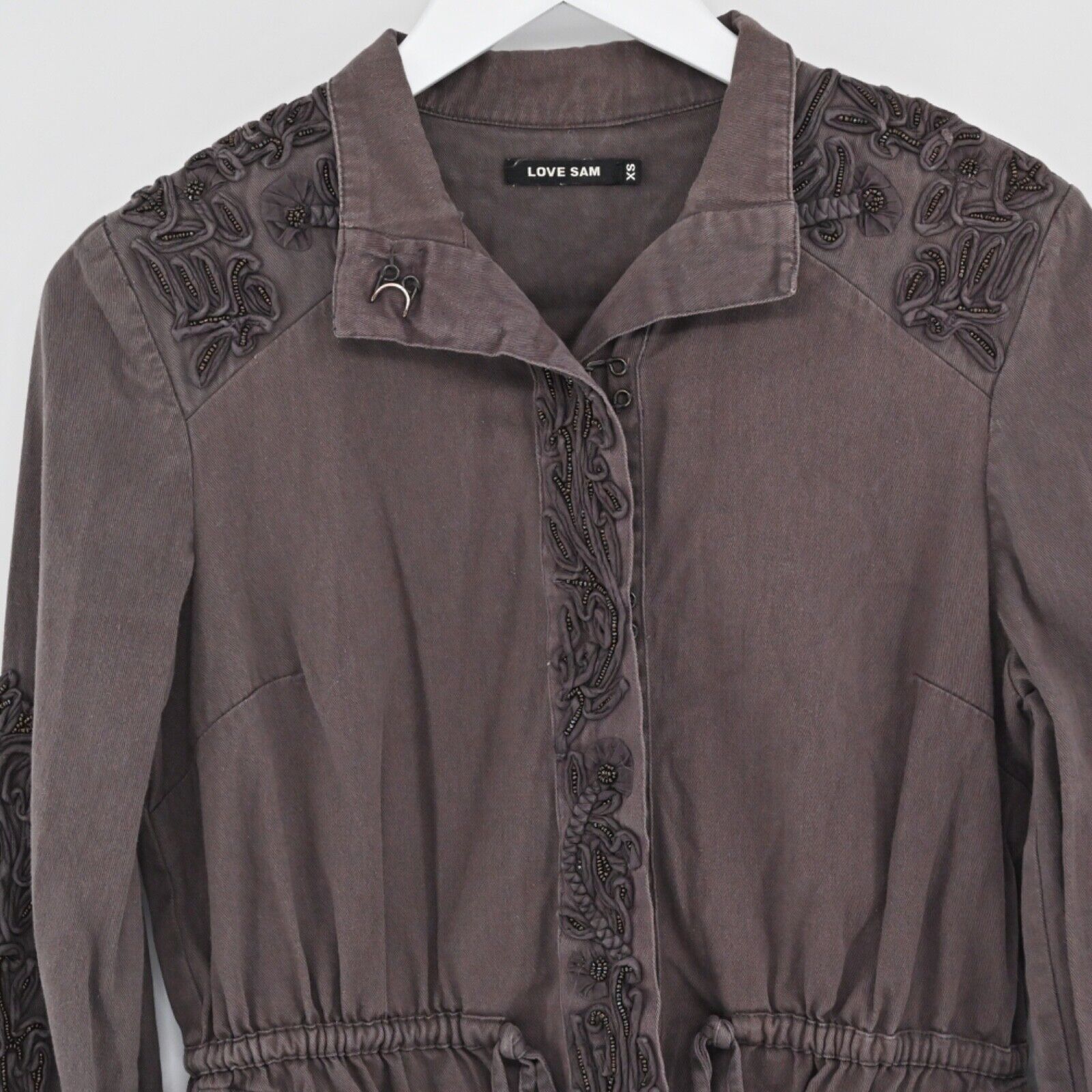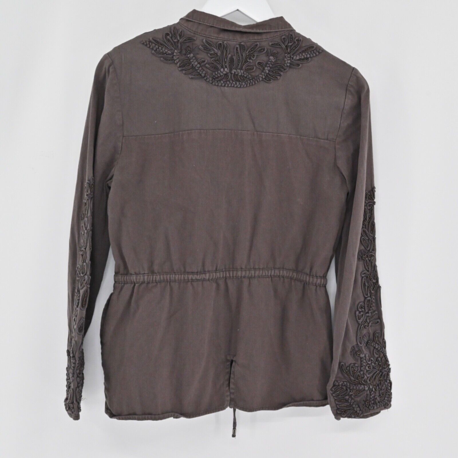 LOVE SAM ANTHROPOLOGIE Women's Size XS Travis Military Jacket Brown Embellished Beaded 100% Cotton Retro Utility Hipster Bohemian Boho Western