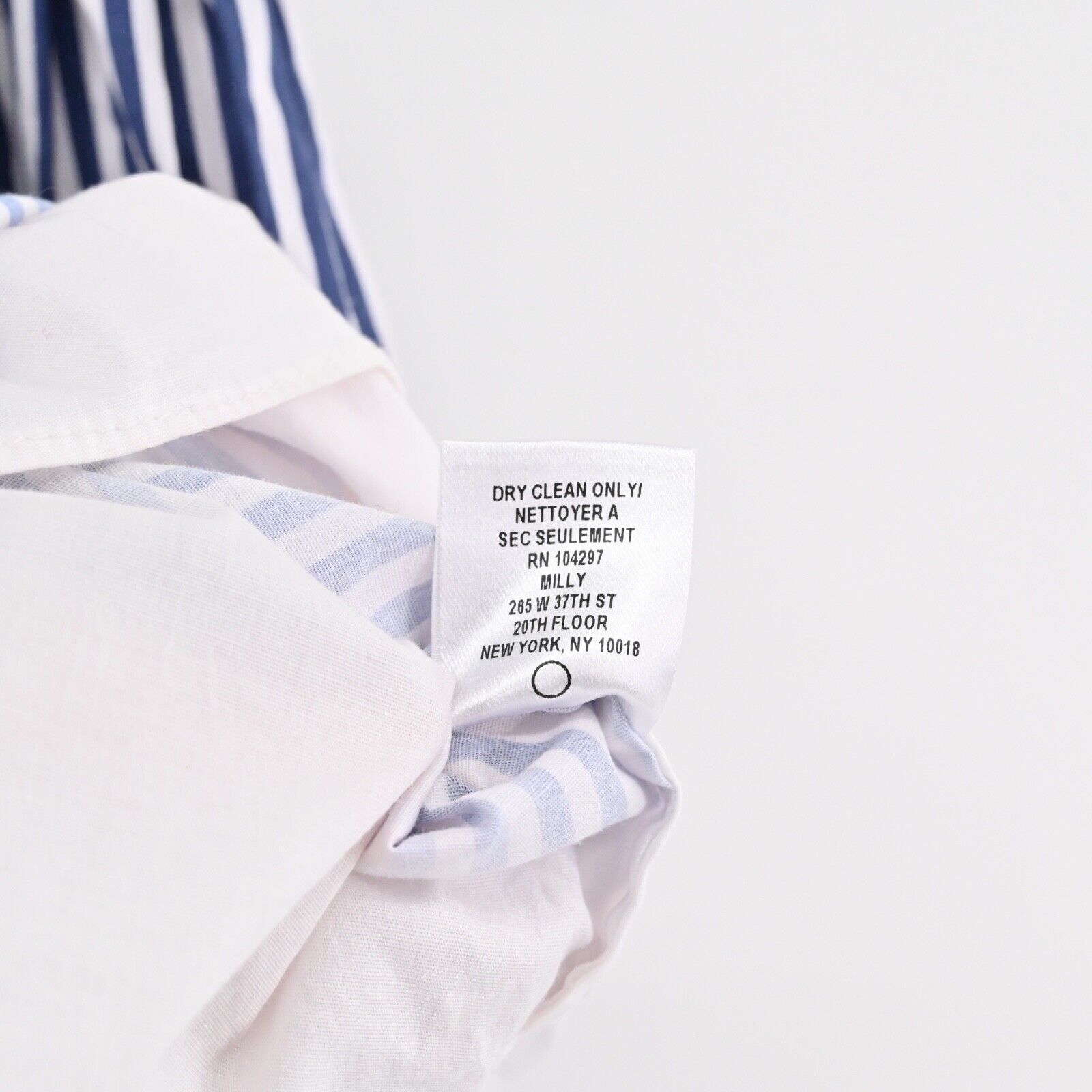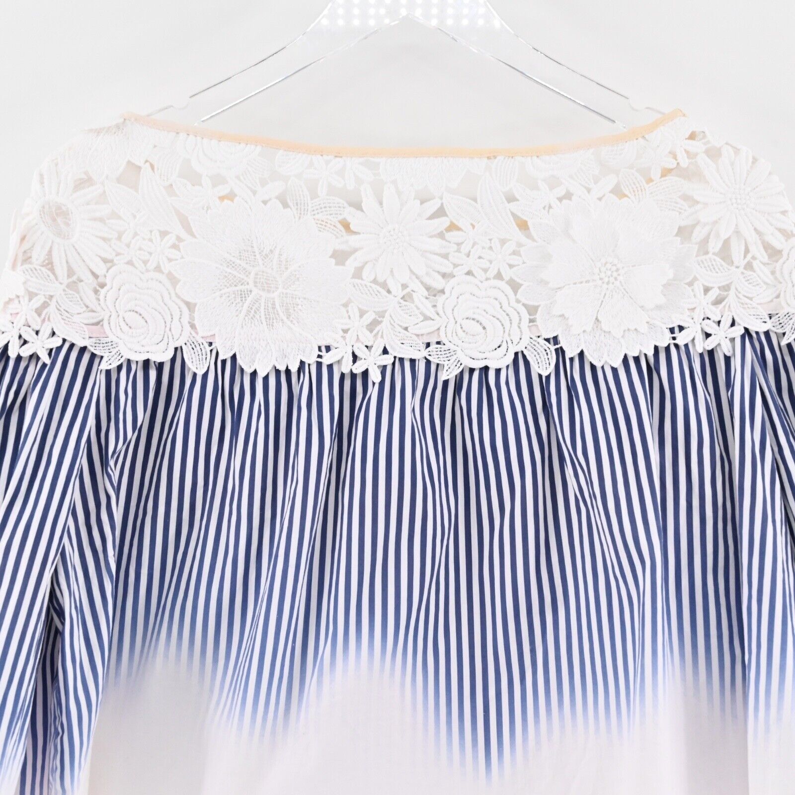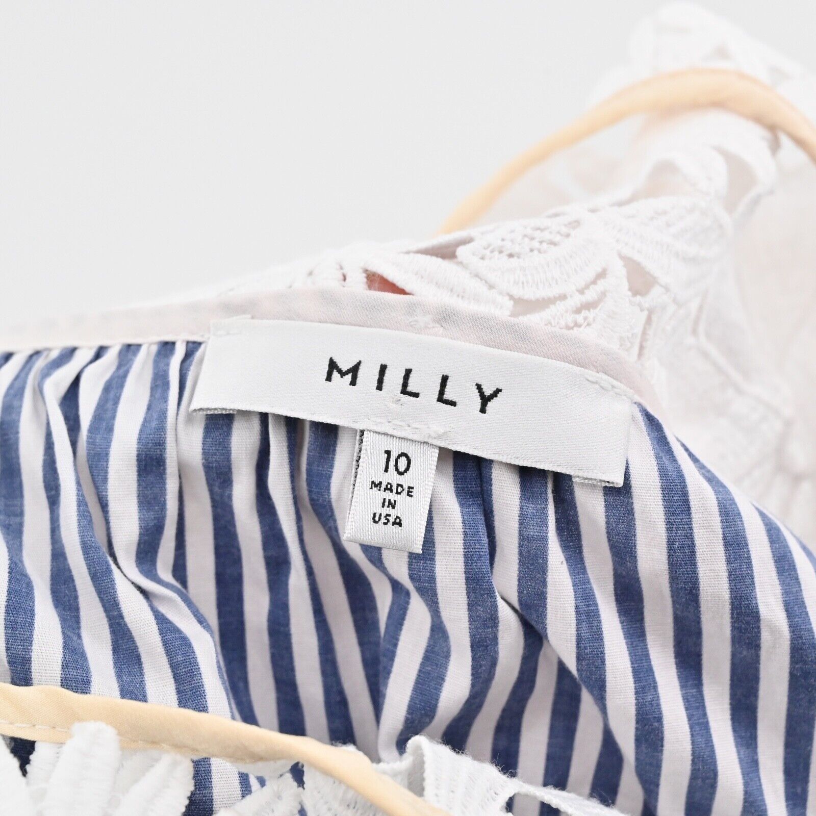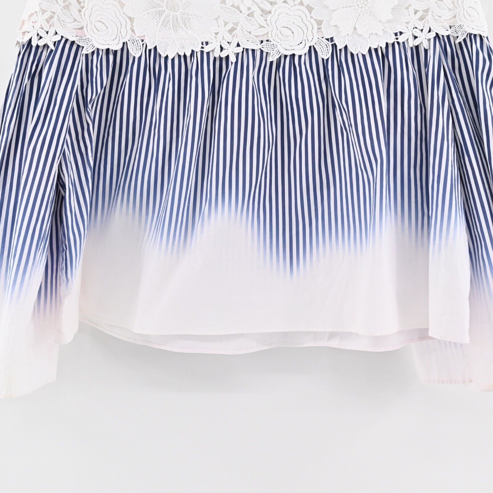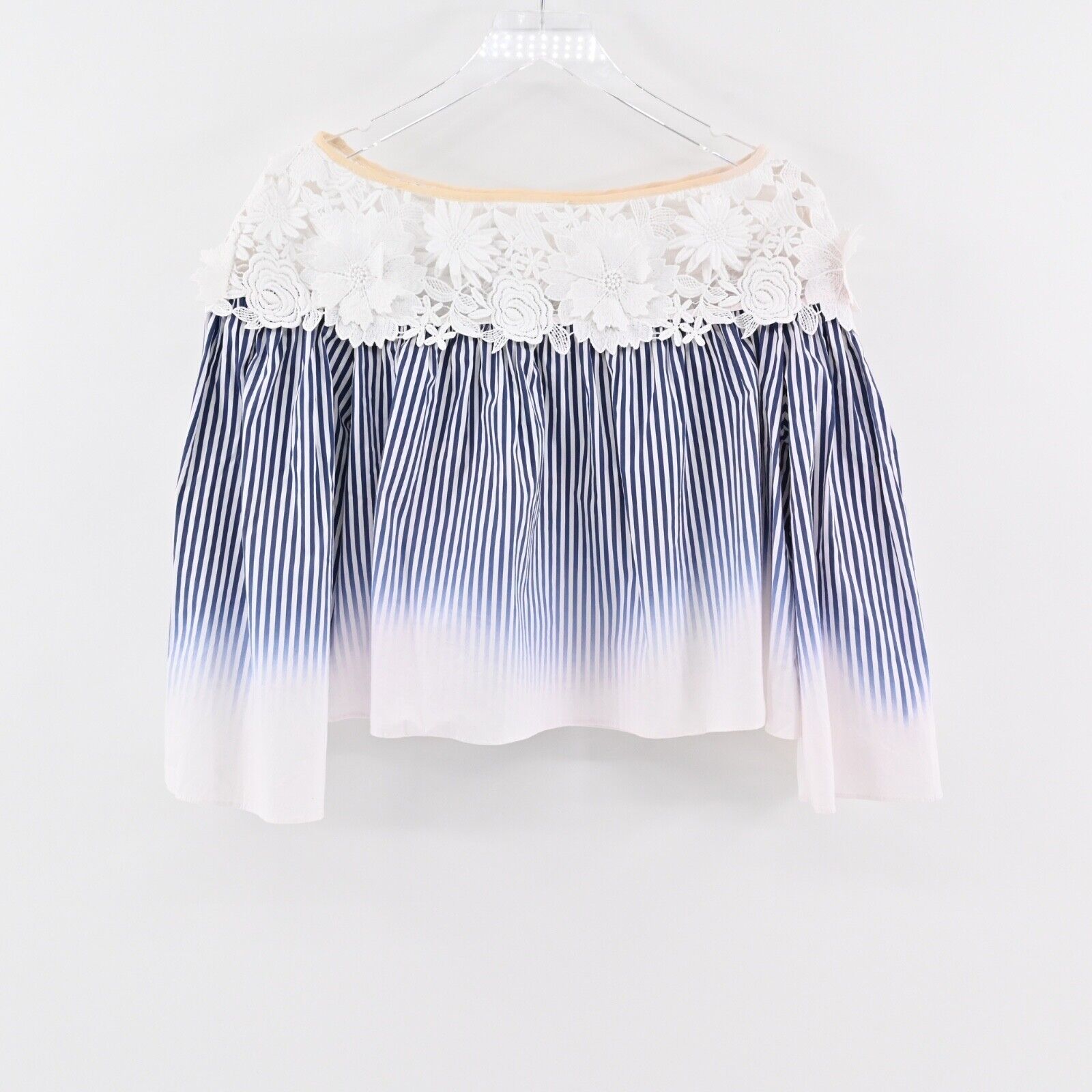 MILLY Top Womens Sz 10 Blue Stripe Lace Cotton Off The Shoulder Bell Sleeve USA