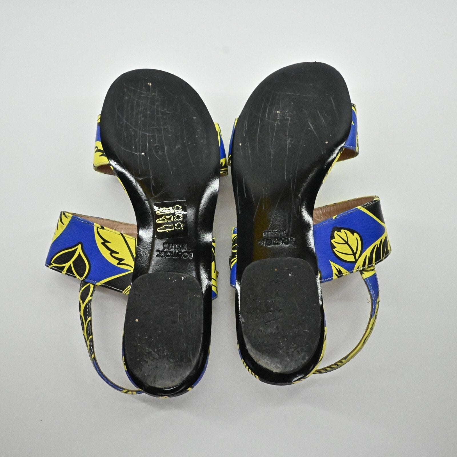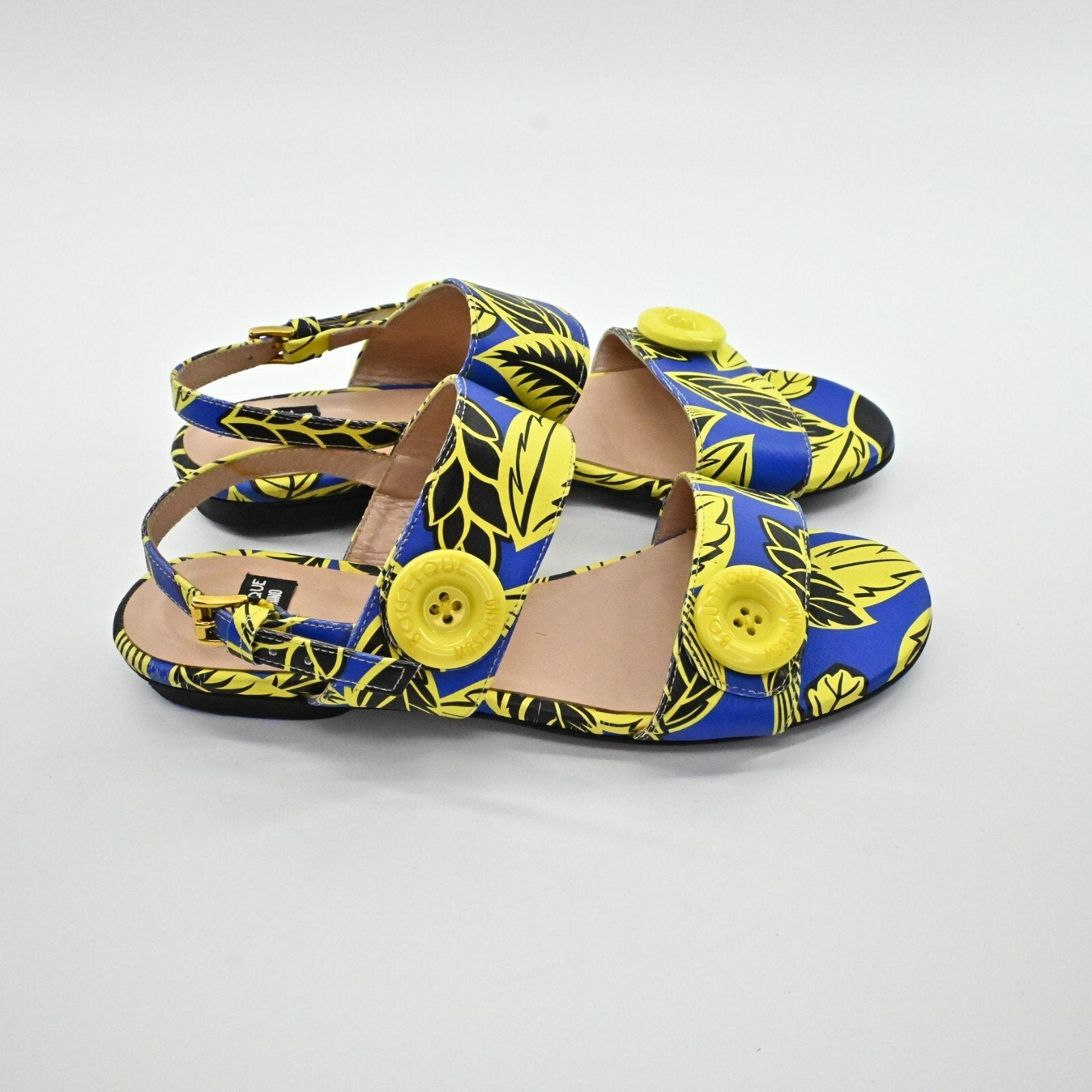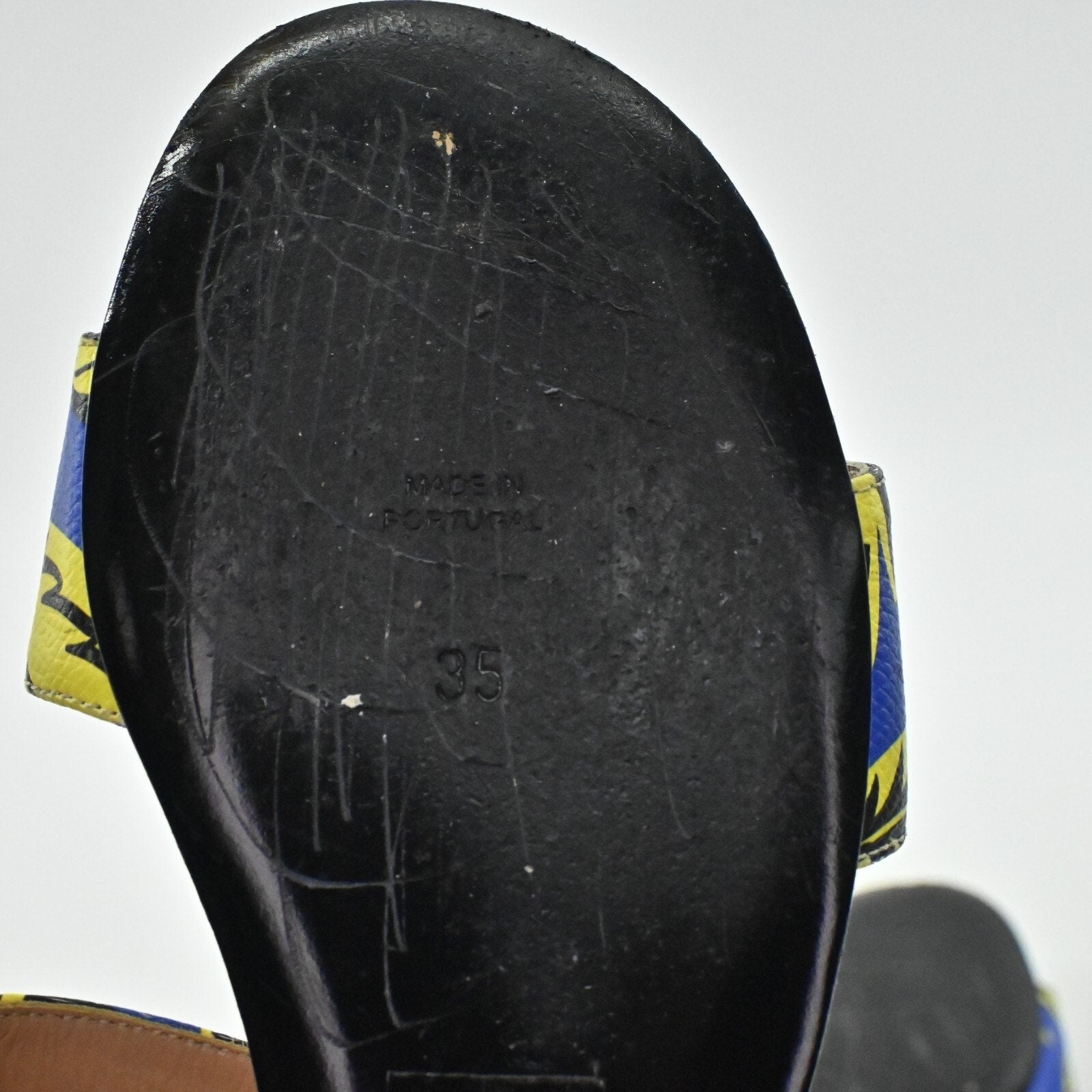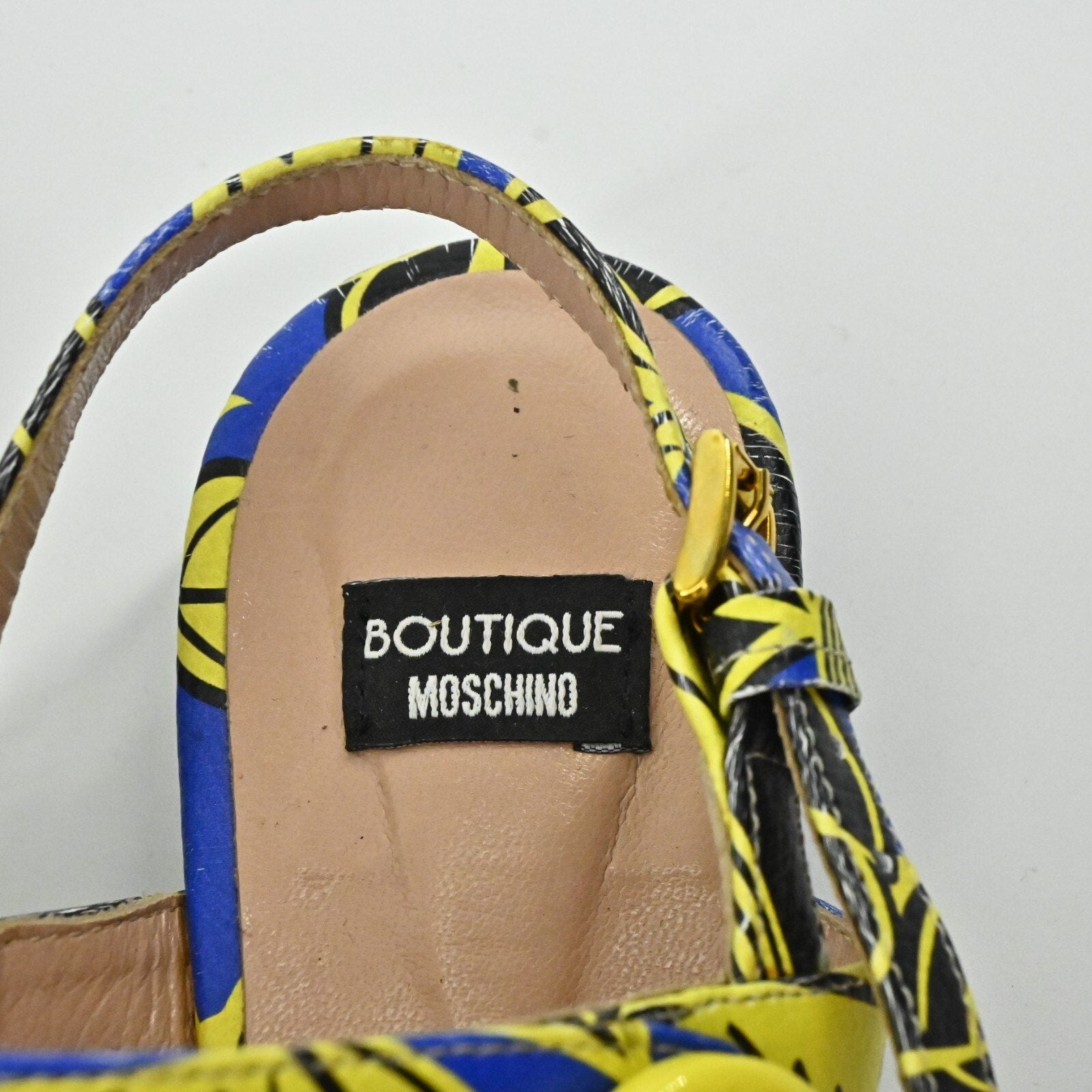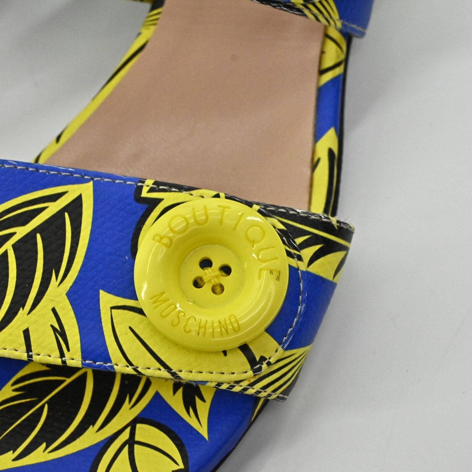 MOSCHINO Sandals Womens Size 35 Boutique Blue Yellow Leaf Print Strappy Shoe
