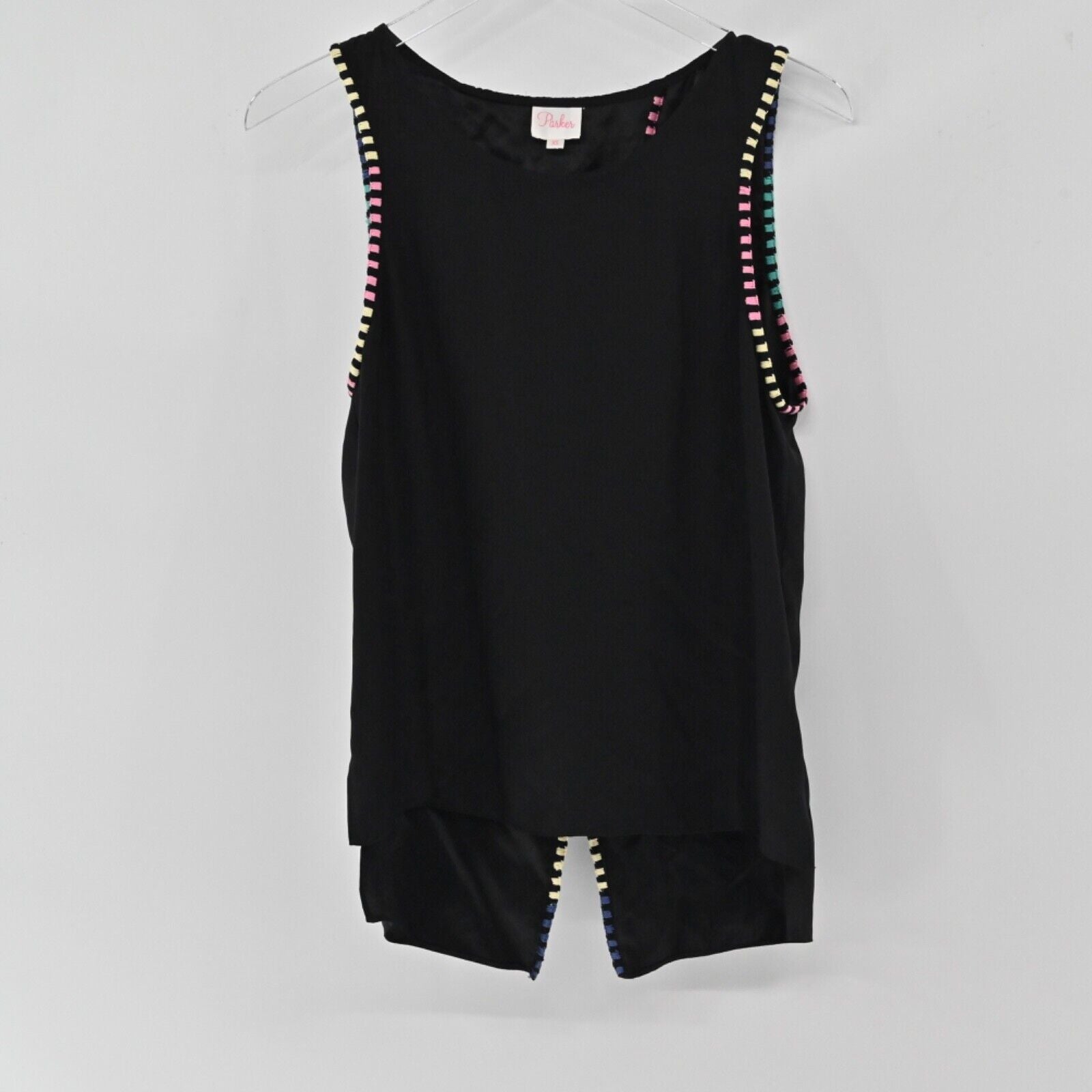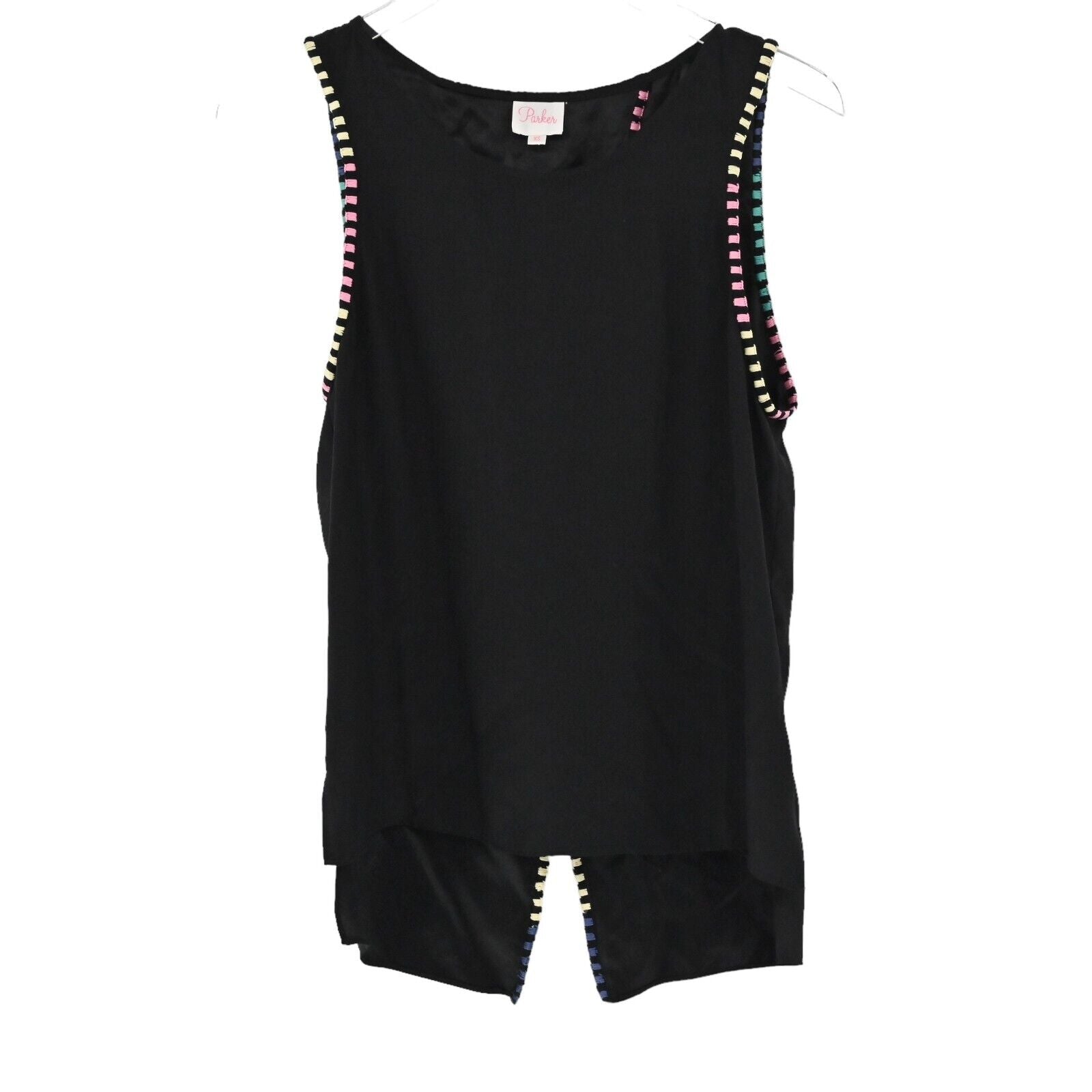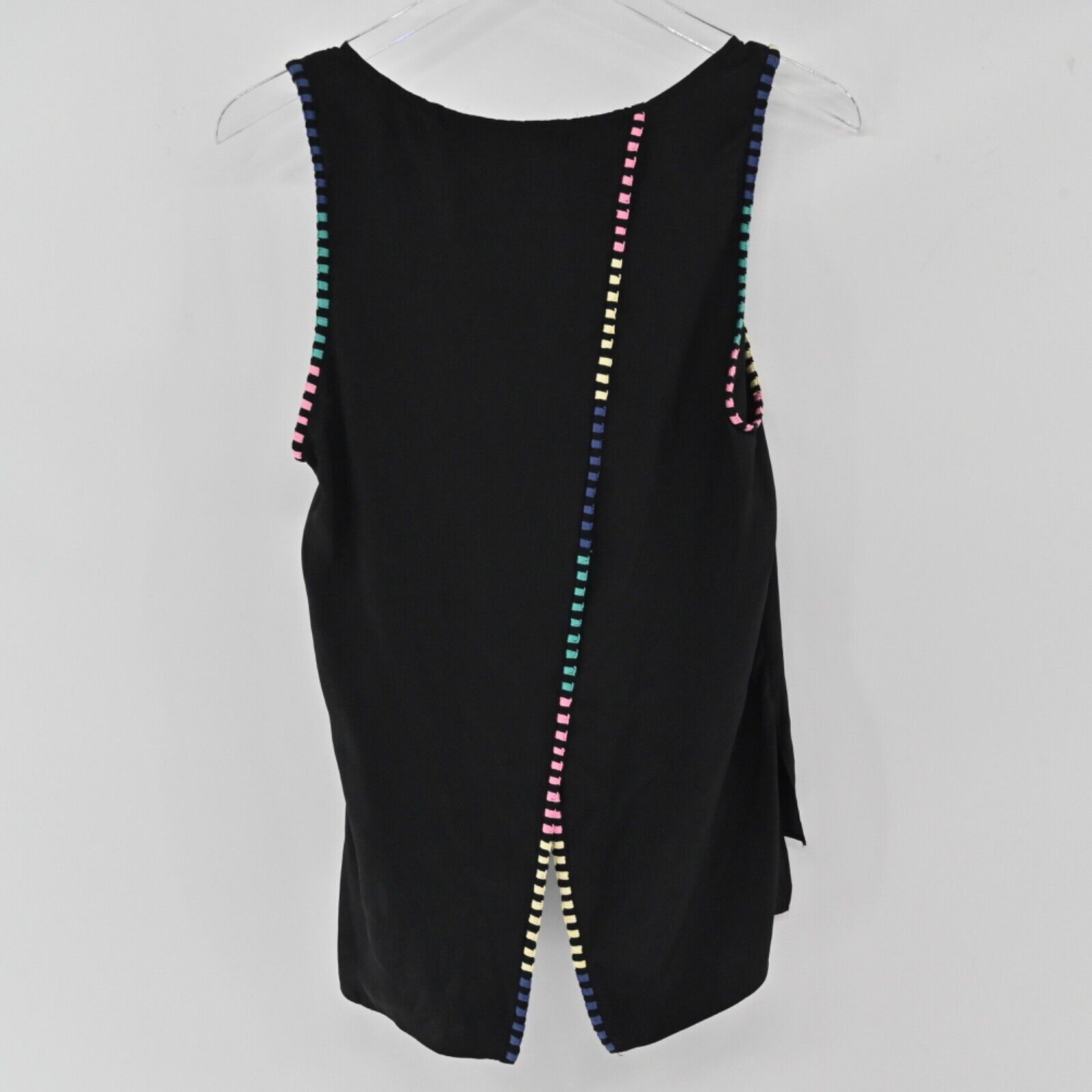 PARKER Top Womens Size XS Black Rainbow Embroidered Stripe Silk Split Back Tank
