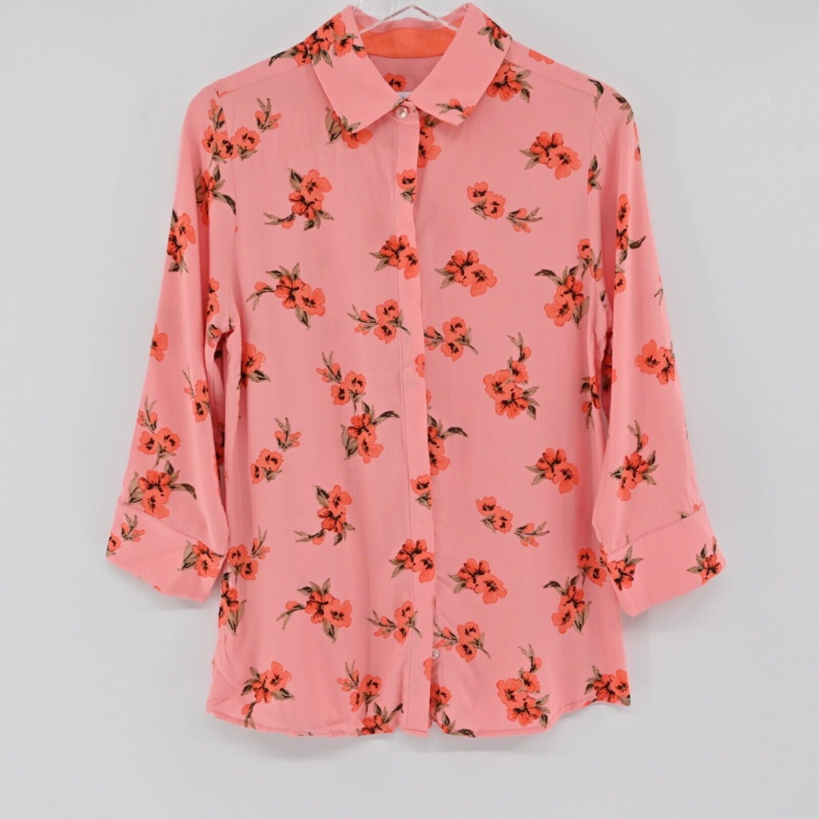 PERLAVERA Top Womens Size S Pink Floral 3/4 Sleeve Button Up Preppy Boho Office