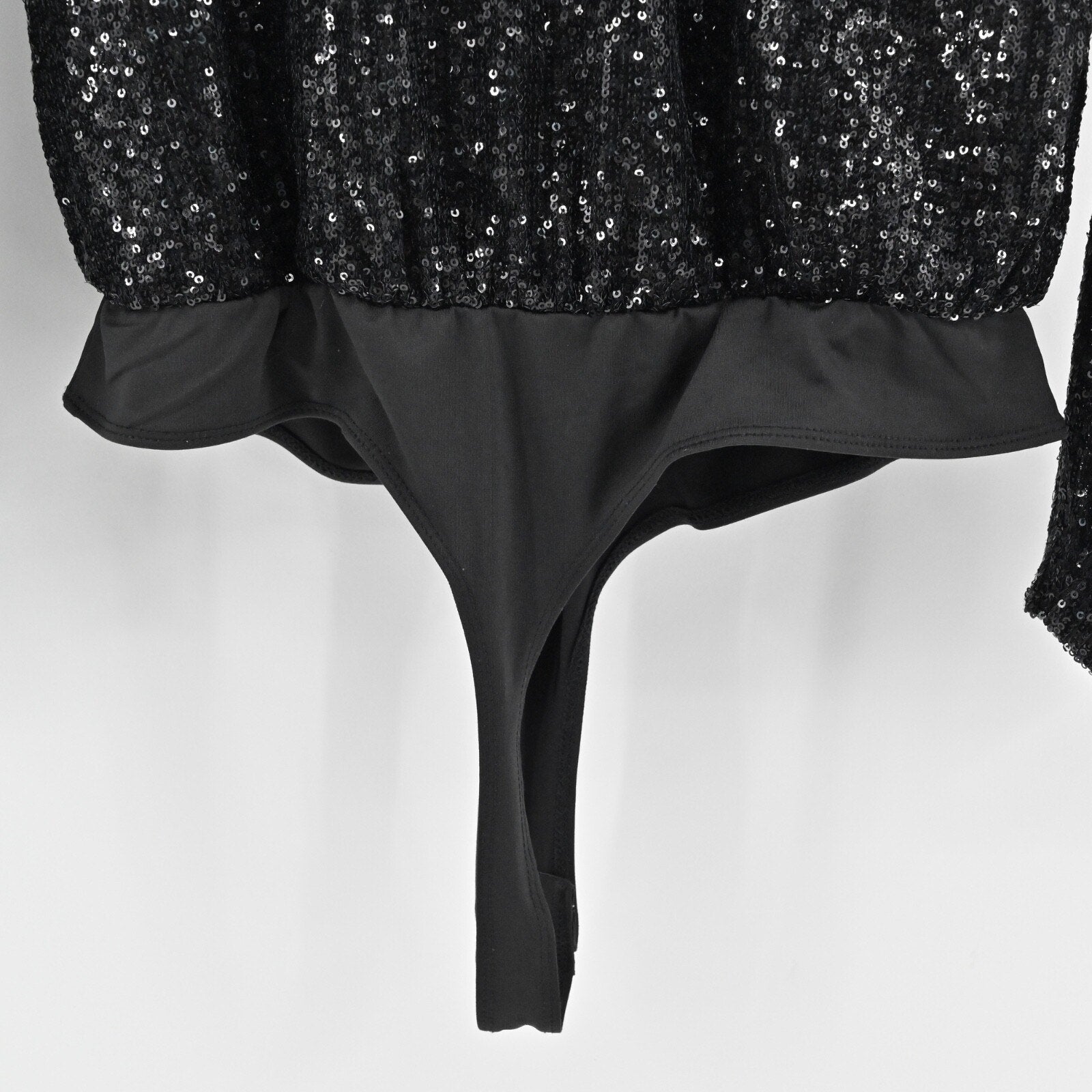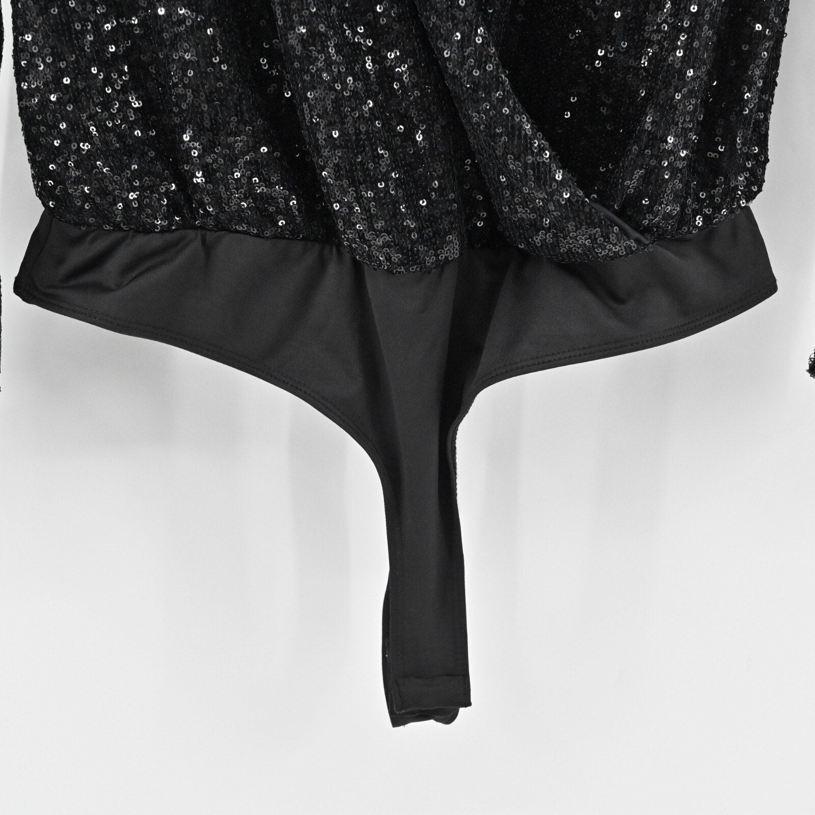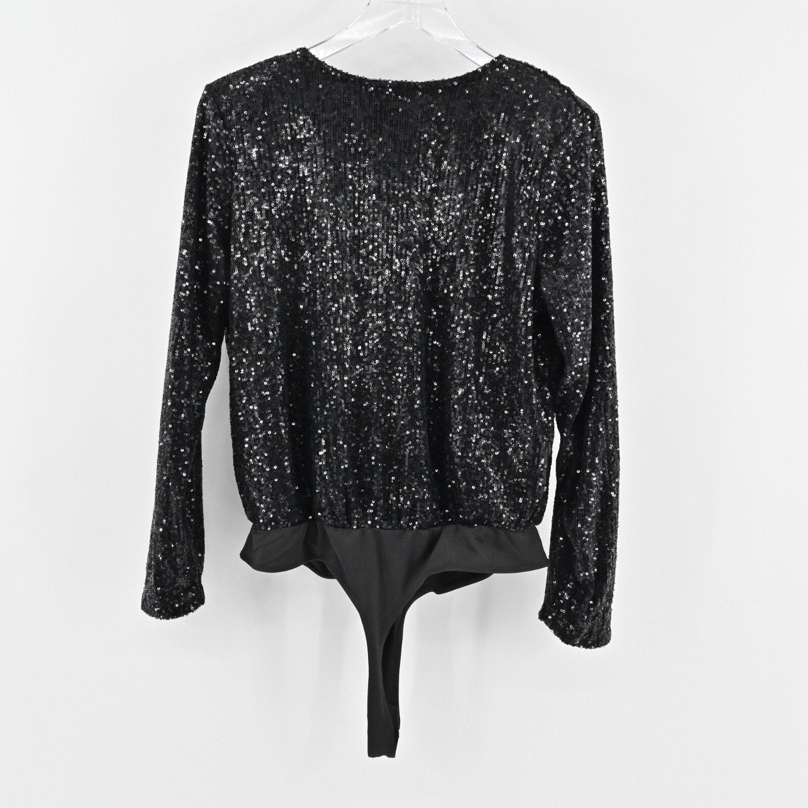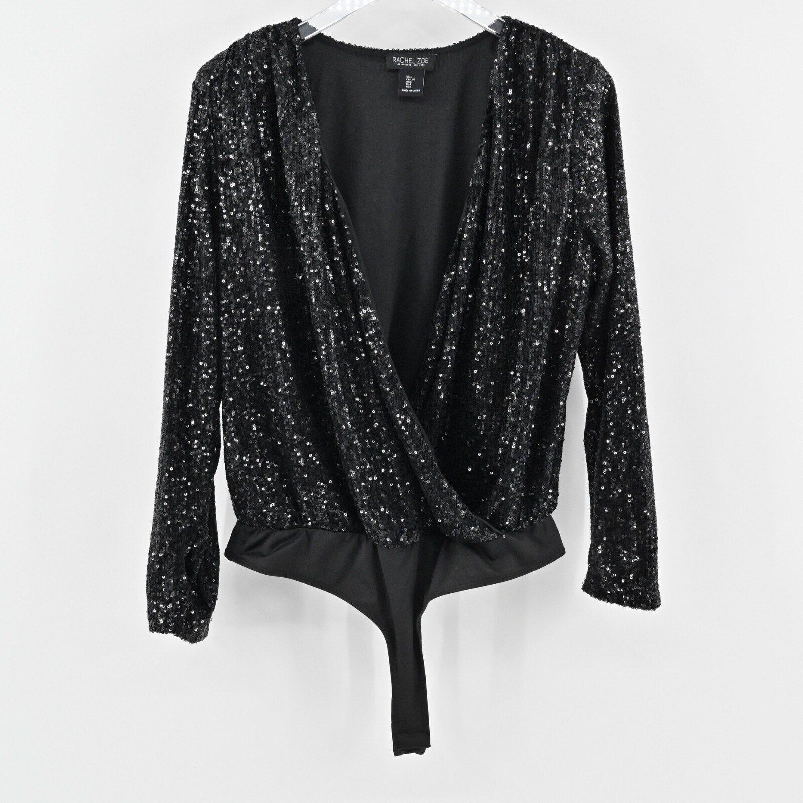 RACHEL ZOE Womens Sequin Bodysuit Size L Black V Neck Long Sleeve Glam Wrap Top