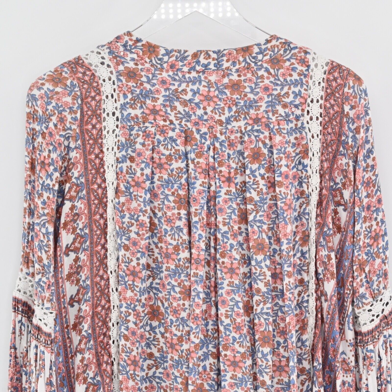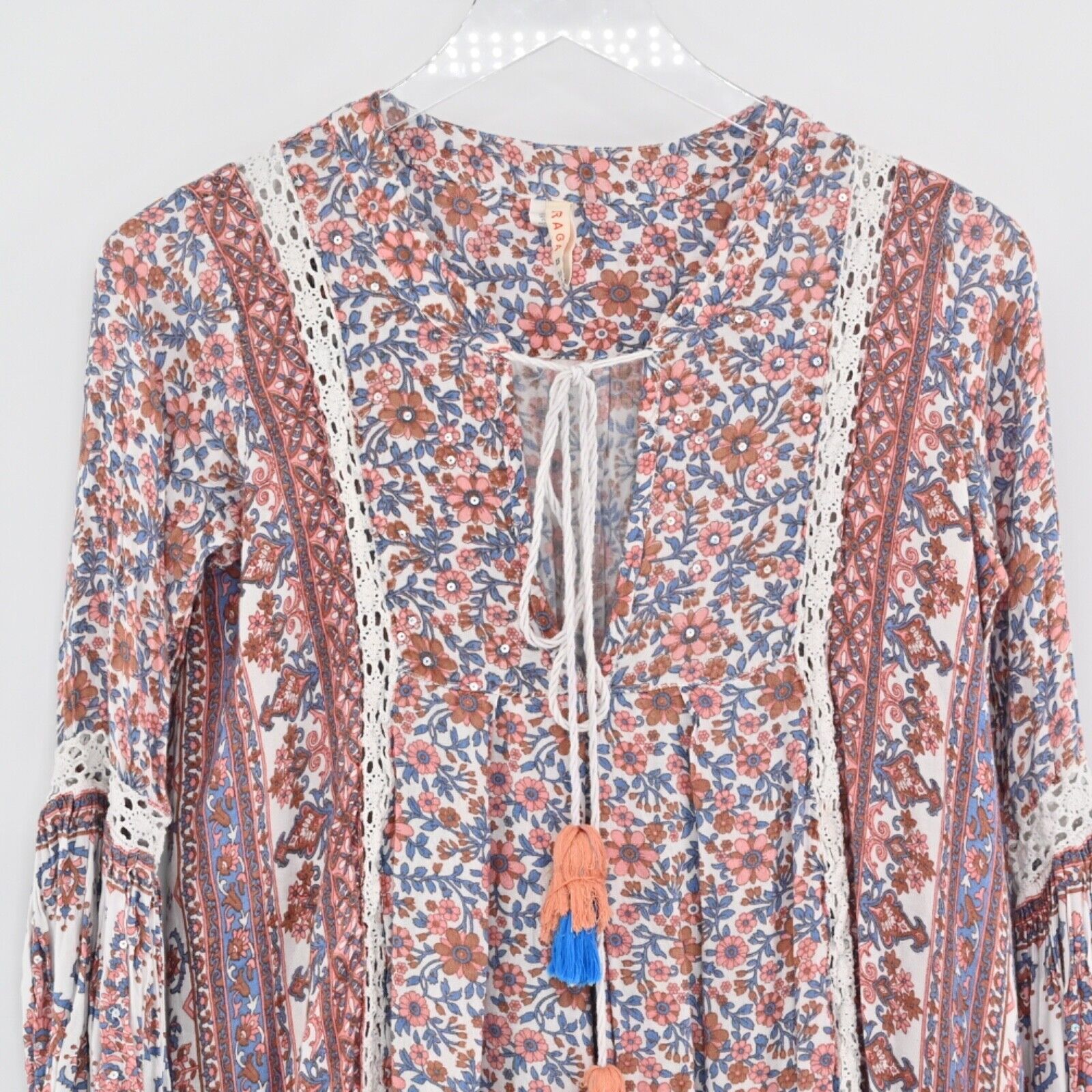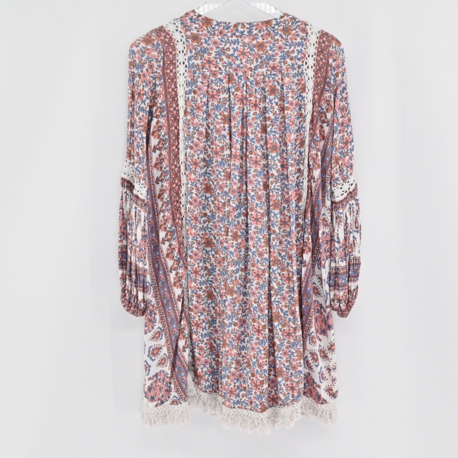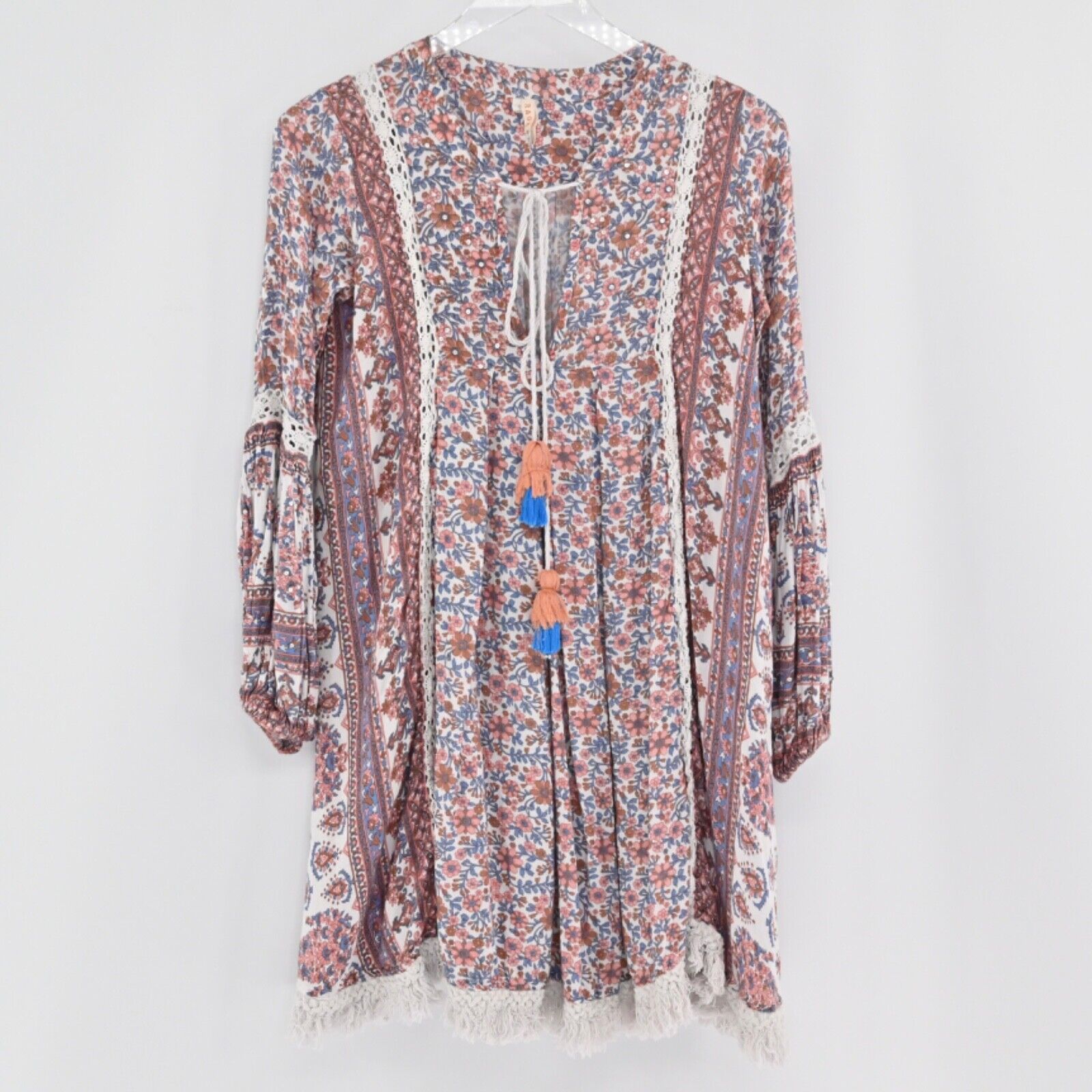 RAGA Women's Size XS Samaira Mini Swing Dress Floral Print Tassel Tie Fringe Trim Bohemian Boho Cottagecore Western Beach Vacation Retro Hippie