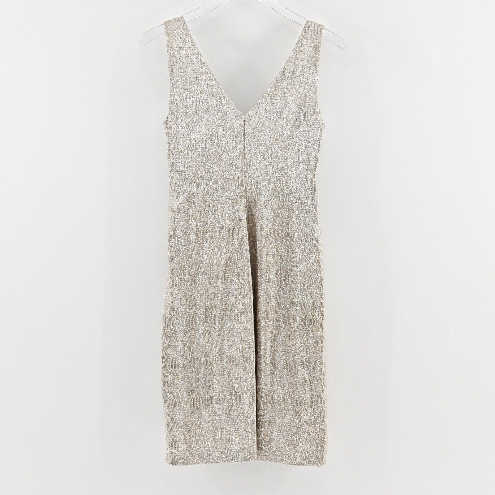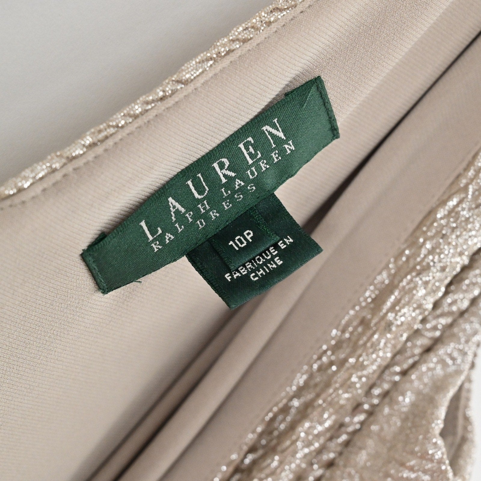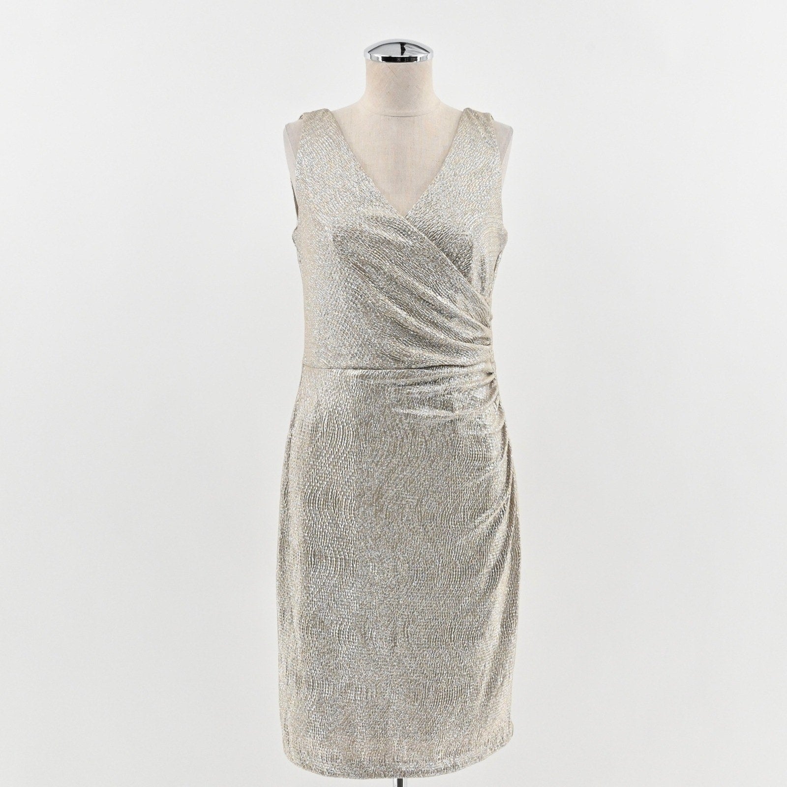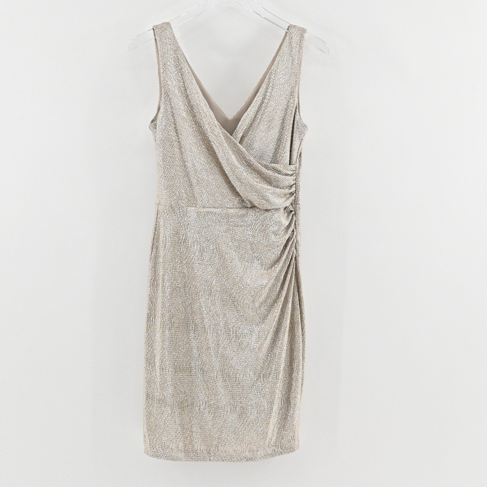 Ralph Lauren Metallic Faux Wrap Dress Size 10P Gold Sleeveless Sheath Cocktail