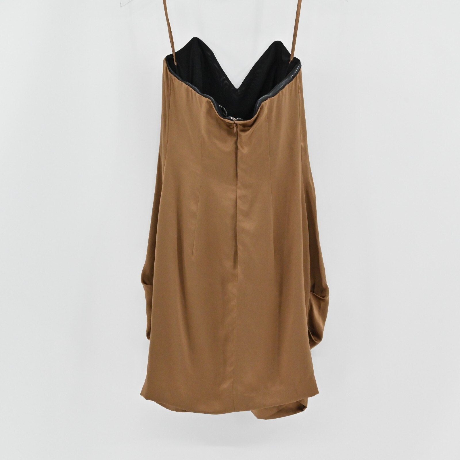 REISS Bronze Silk Dress Sz 6 Gold Strapless Bustier Twist Front Mini Party Retro