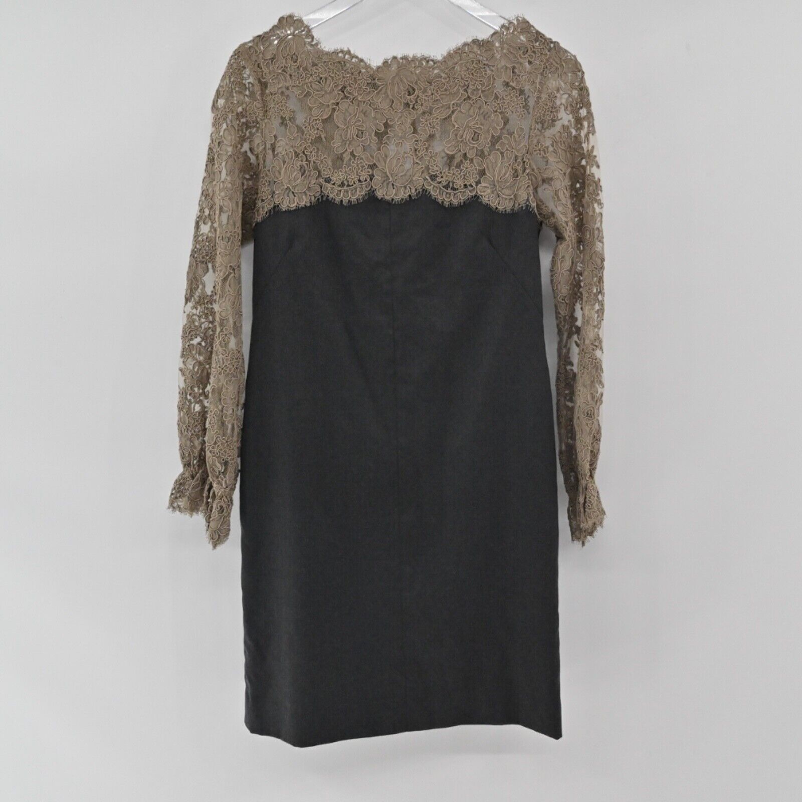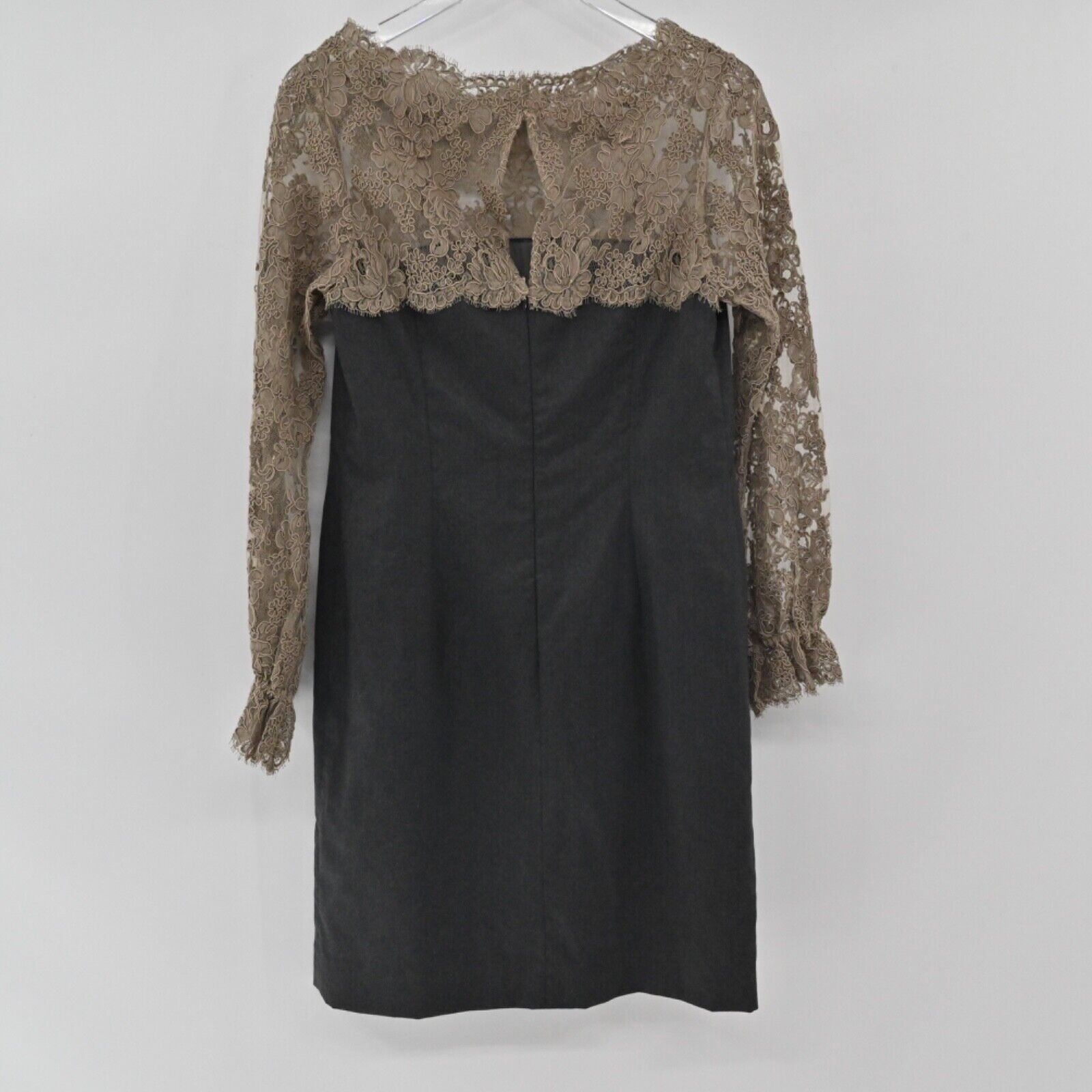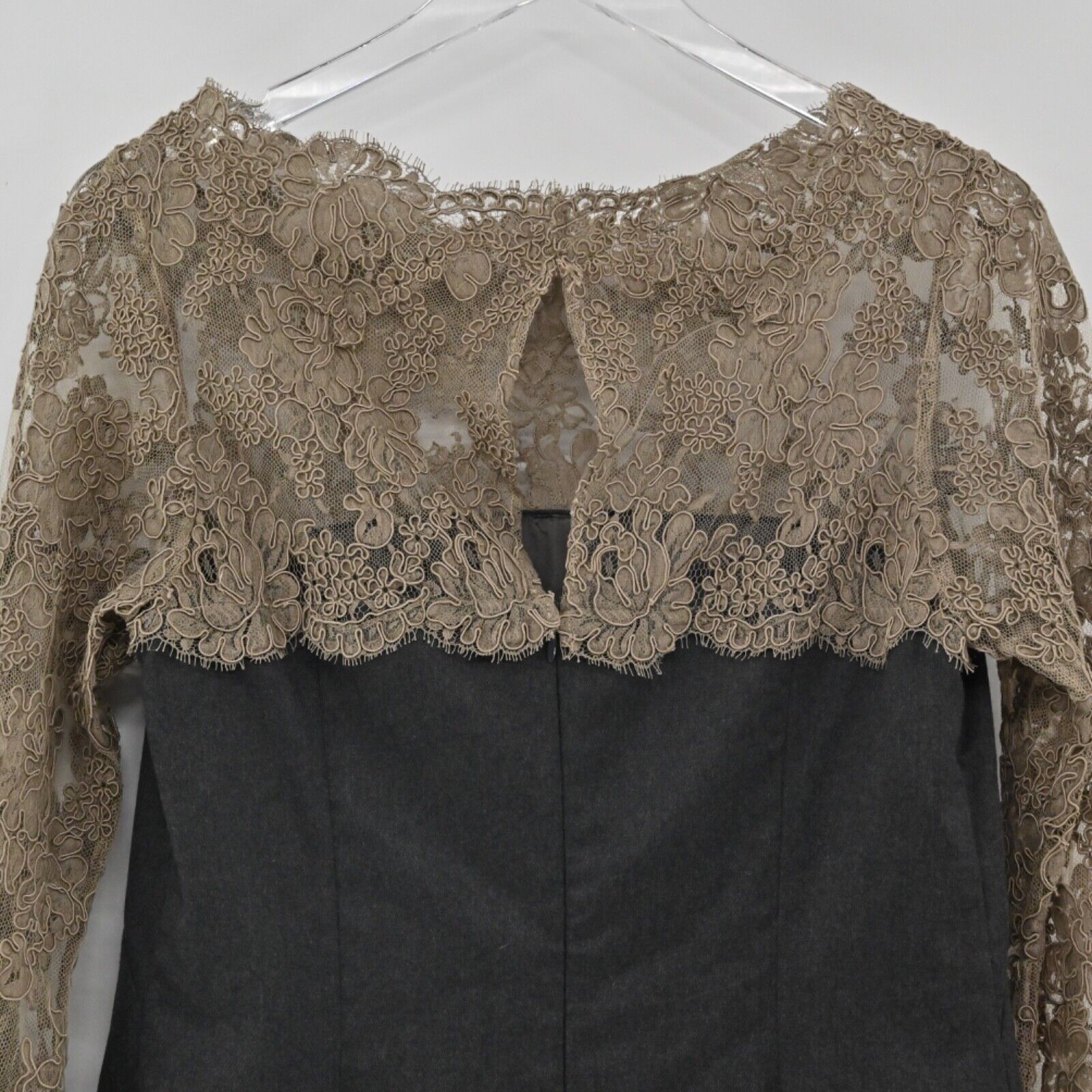 SHANNON MCLEAN Dress Women's Size Small Charcoal Black With Taupe Brown Embroidered Floral Sheer Lace Boat Neck Long Bell Sleeves Sheath Concealed Zipper Keyhole Hook & Eye Closure Lined Retro Victorian Cocktail Party Wedding