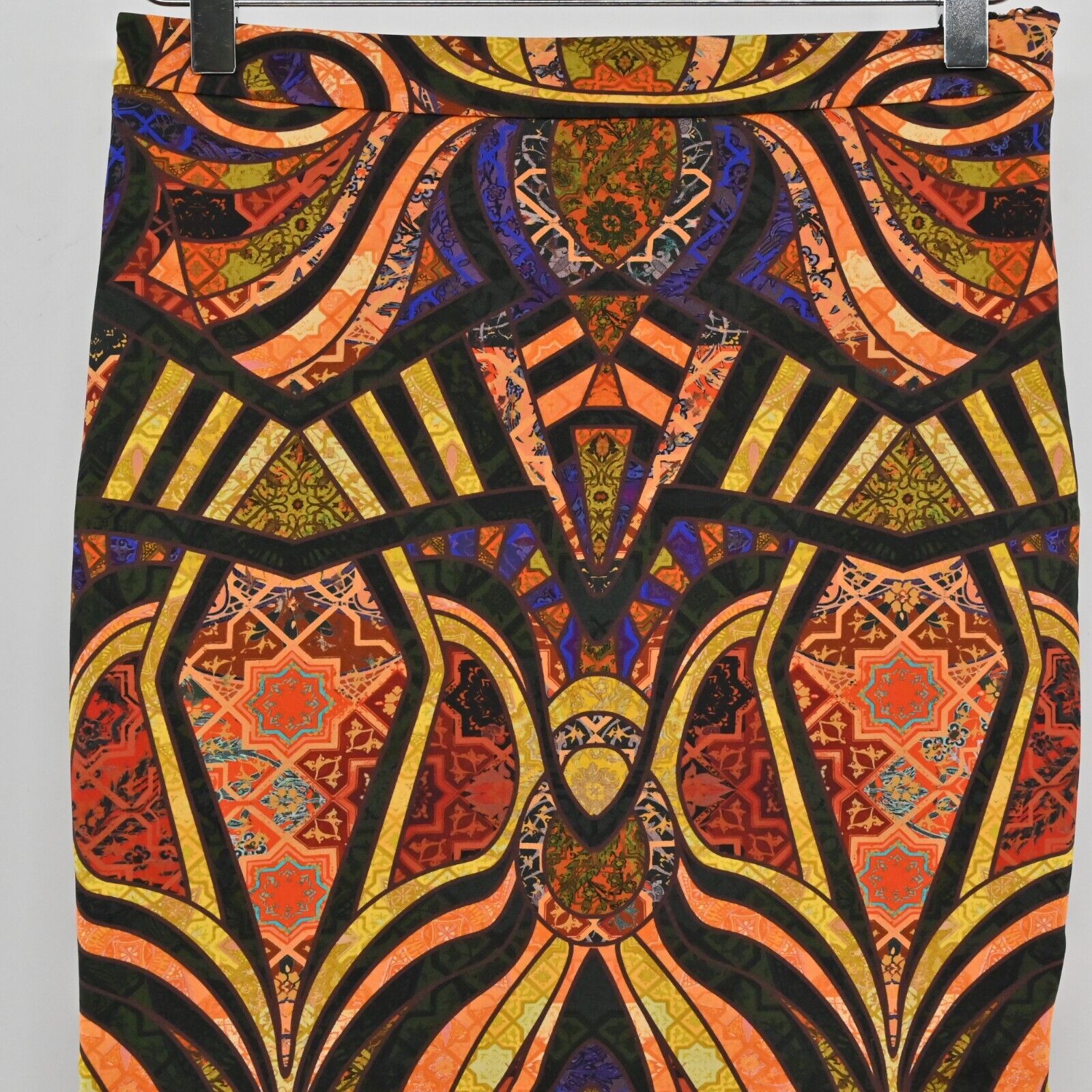 TORN BY RONNY KOBO Skirt Women's Size Small Orange Bohemian Boho Geometric Print Paris Trumpet Hem Pencil Concealed Side Zipper Closure Jersey Knit Stretch Retro Eclectic Office Career Party Cocktail
