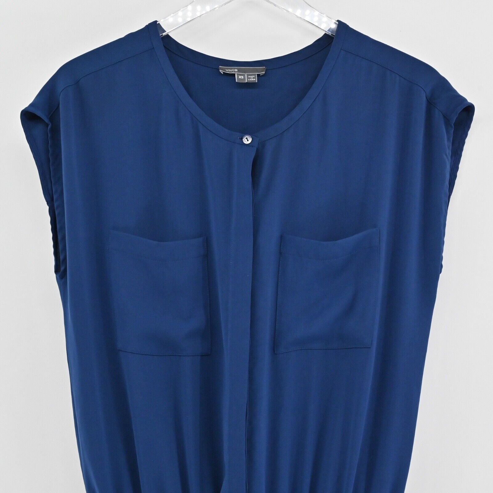 VINCE Dress Women's Size XS Cobalt Blue Crew Neck Dolman Cap Sleeve Drawstring Waist Shirt Tunic Style Breast Pockets Shirt Tail Hem Pullover Concealed Front Button Closure Casual Chic Beach Vacation