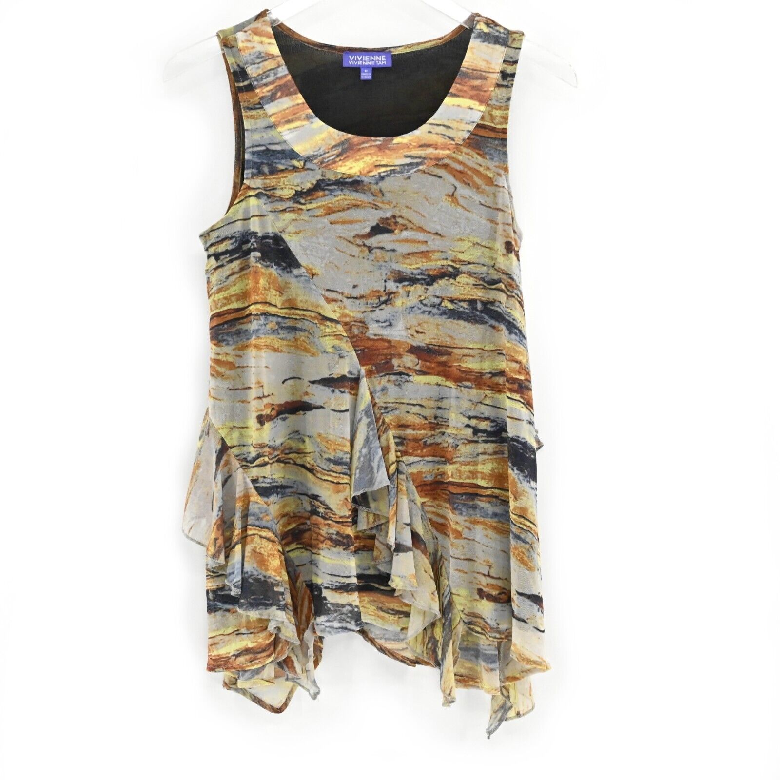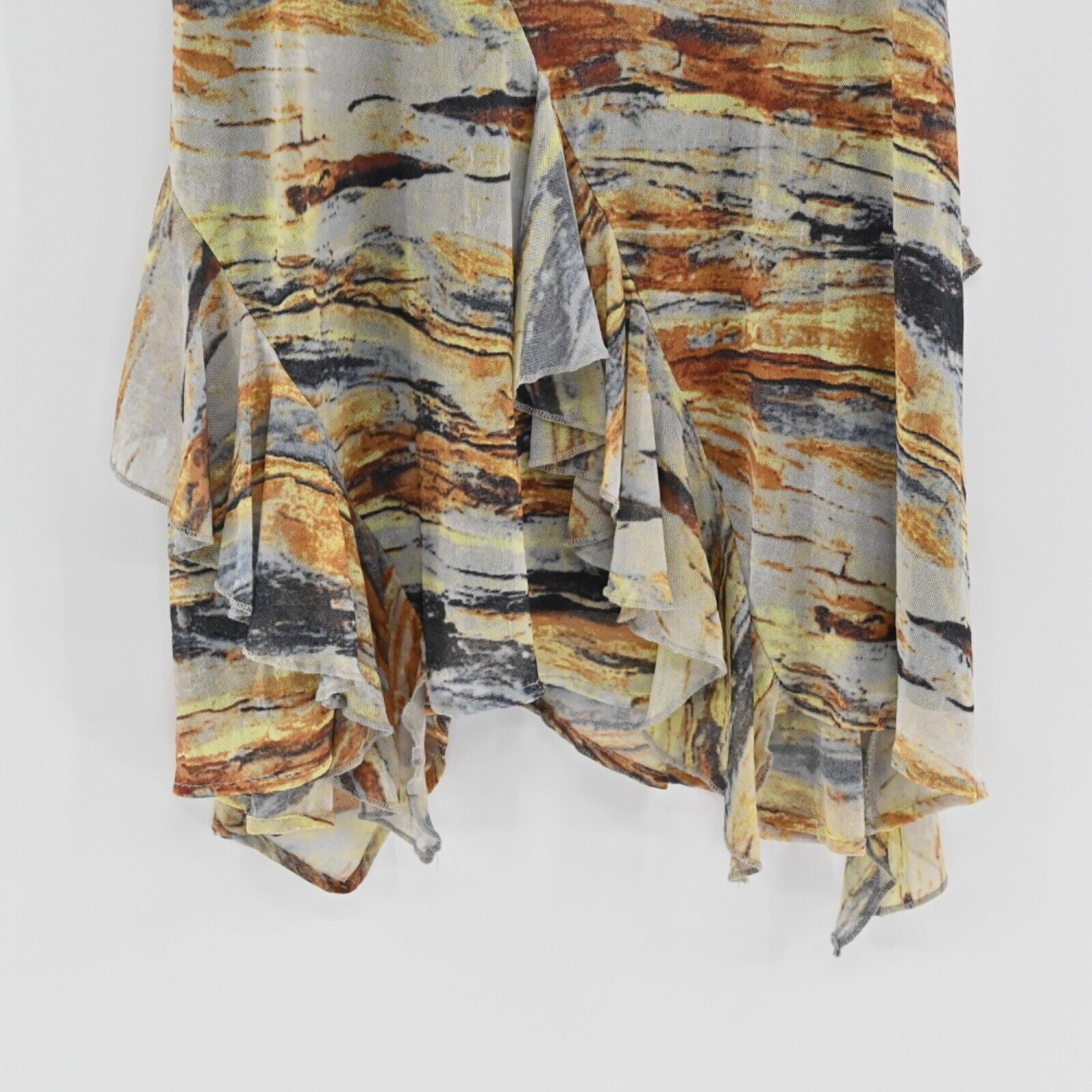 VIVIENNE TAM Top Womens Size M Sleeveless Mesh Blouse Marbled Draped Ruffle Boho