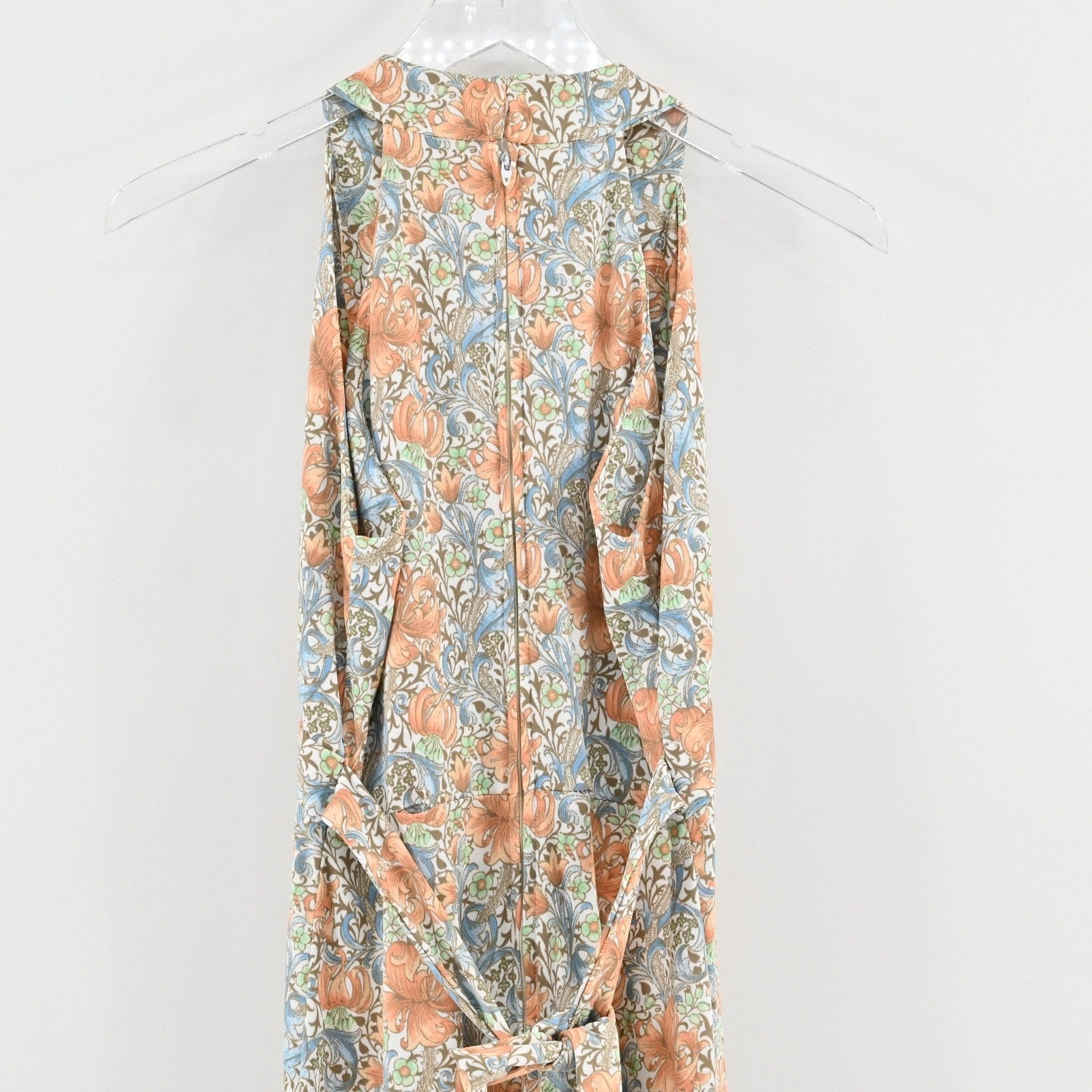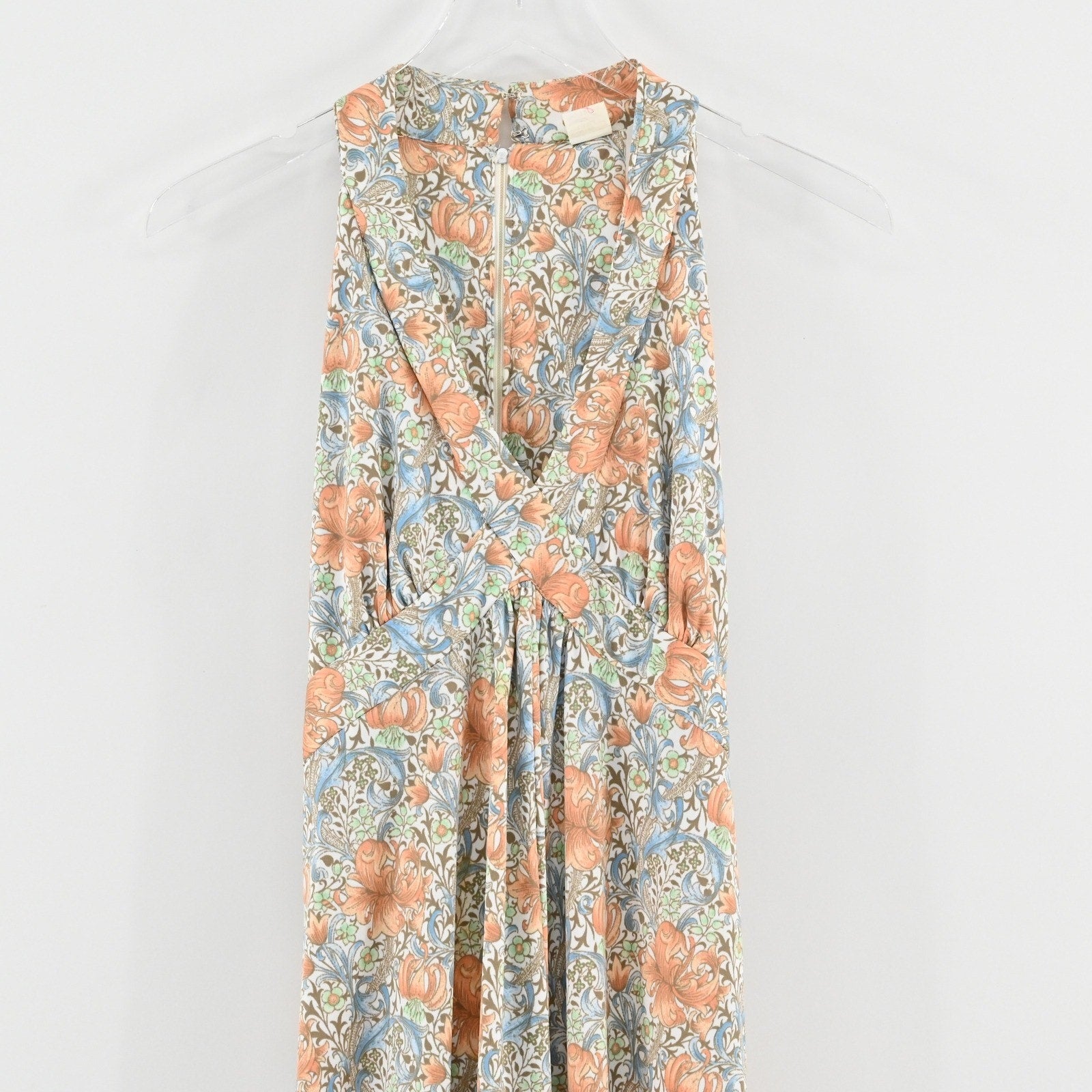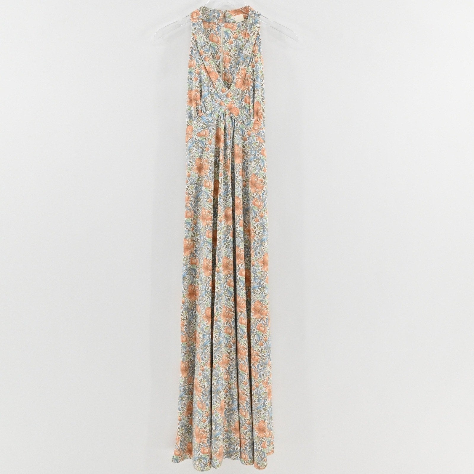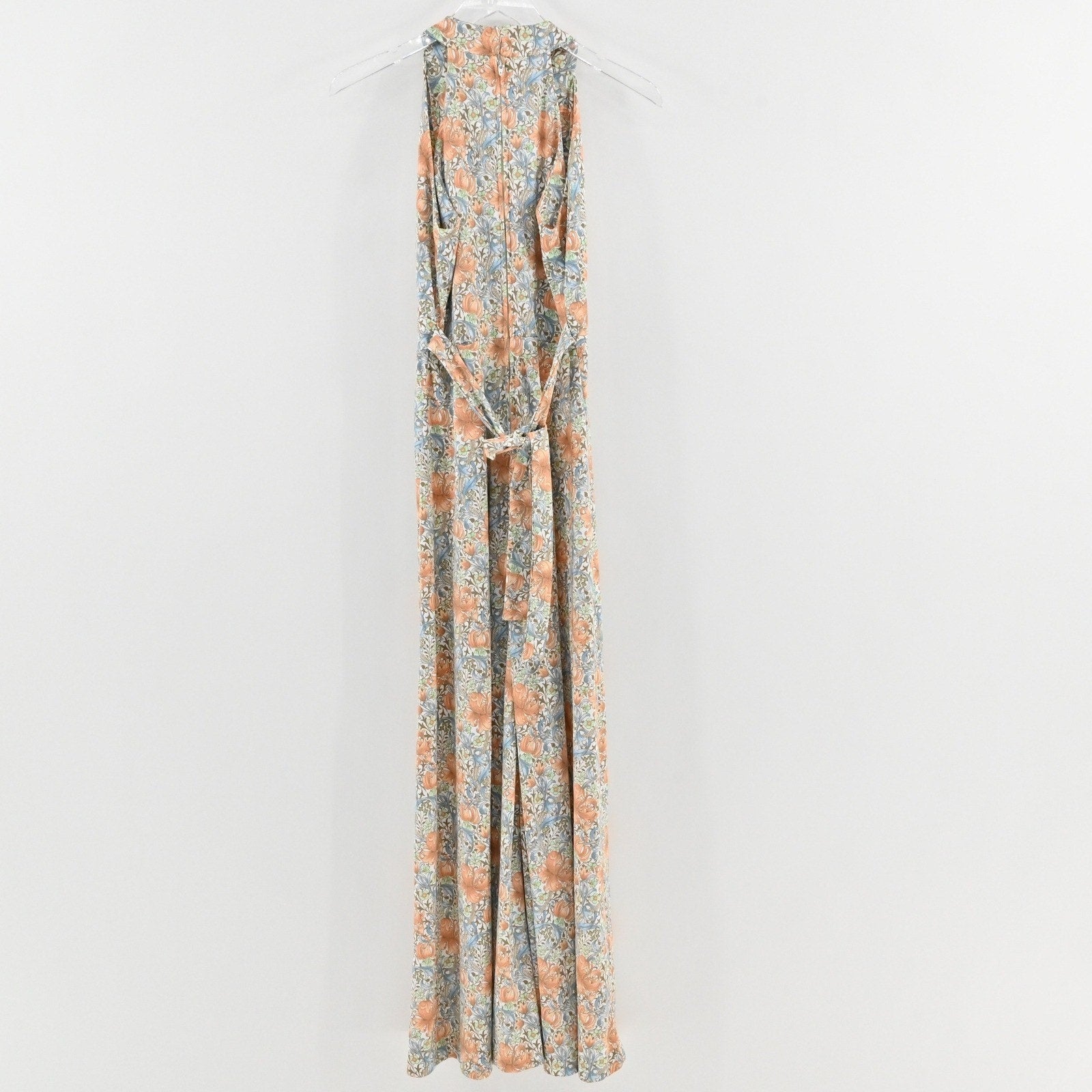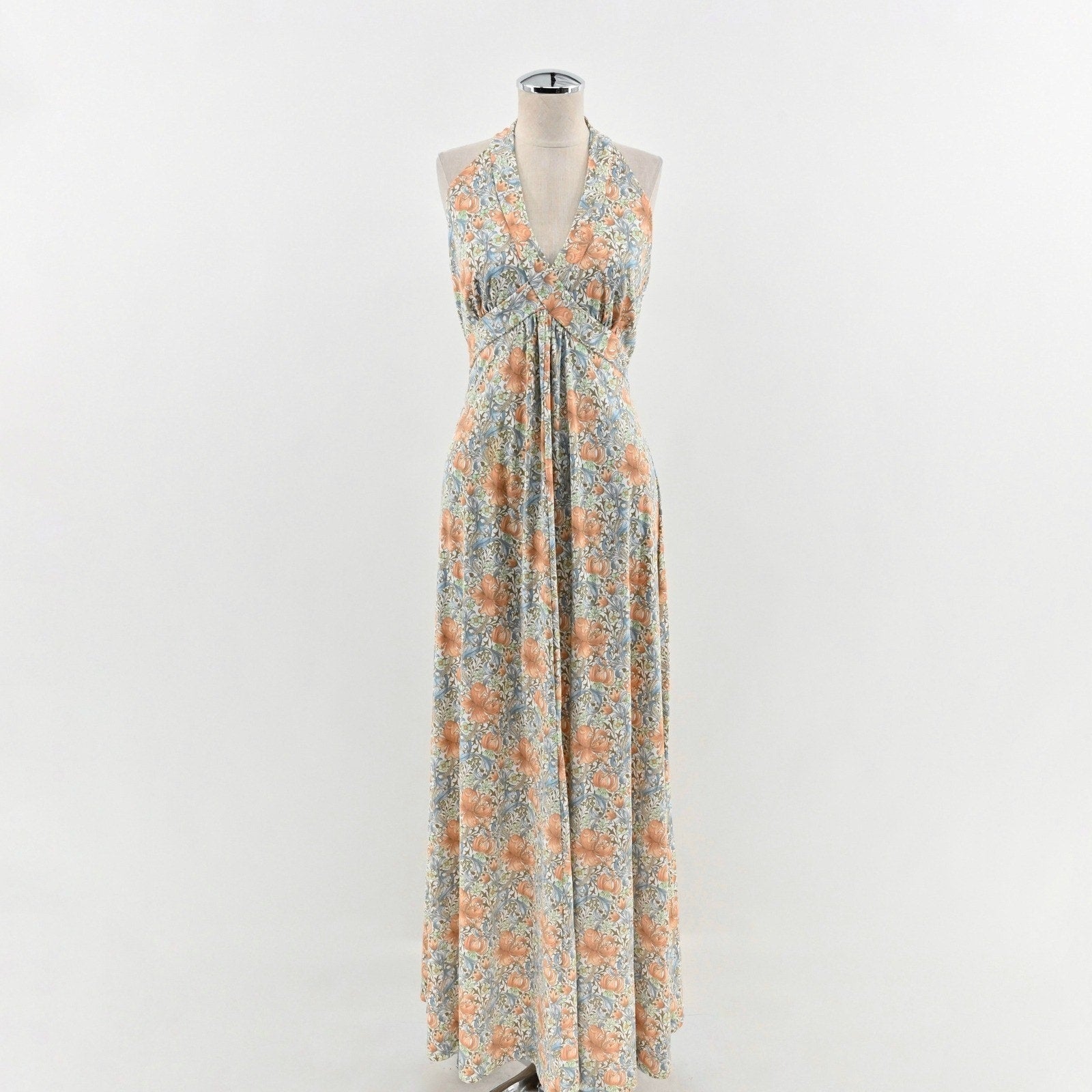 Vtg 70s Floral Halter Maxi Dress Size S Peach Blue Whimsical Bloomcore Feminine
