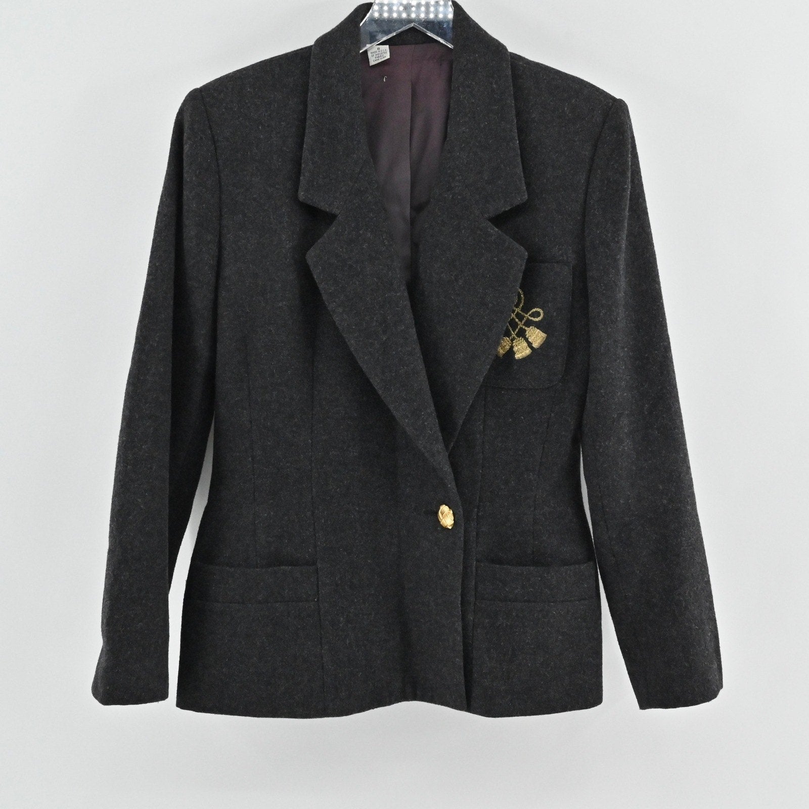 Vtg 80s Womens Wool Patch Blazer Size 8 Gray Gold Tassel Academia USA Jacket