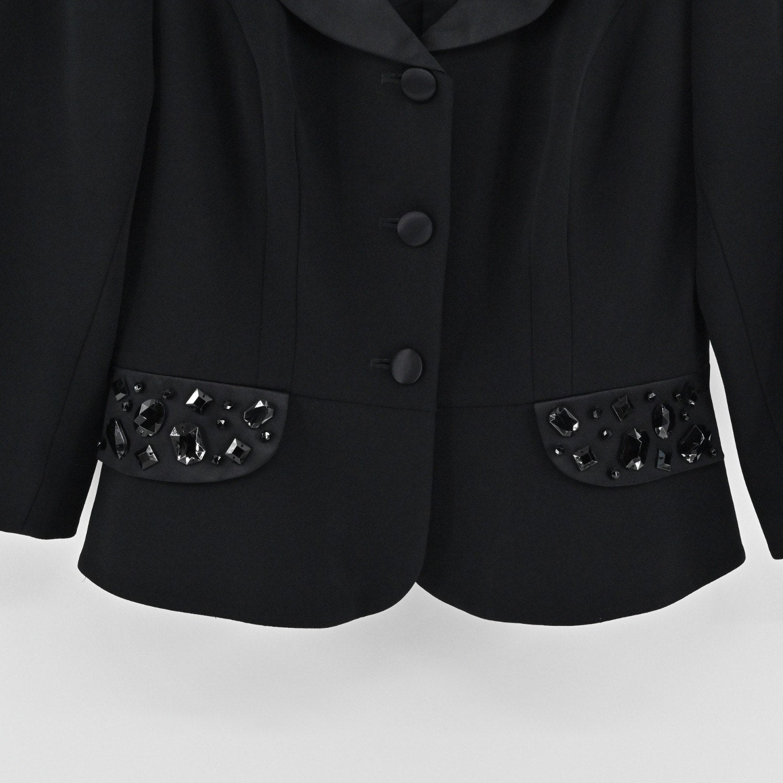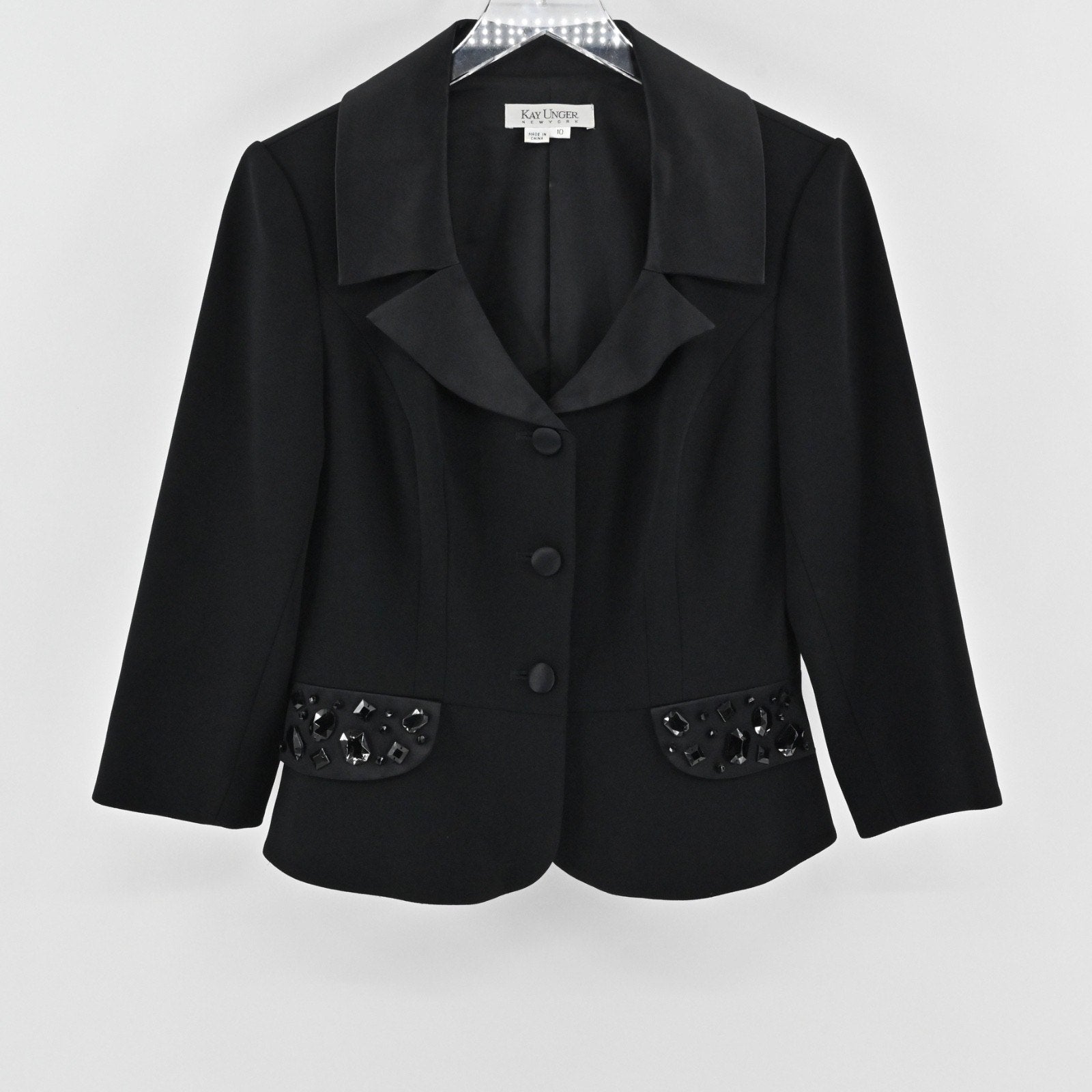 Vtg 90s Kay Unger Womens Embellished Jewel Silk Blazer Sz 10 Black Career Formal