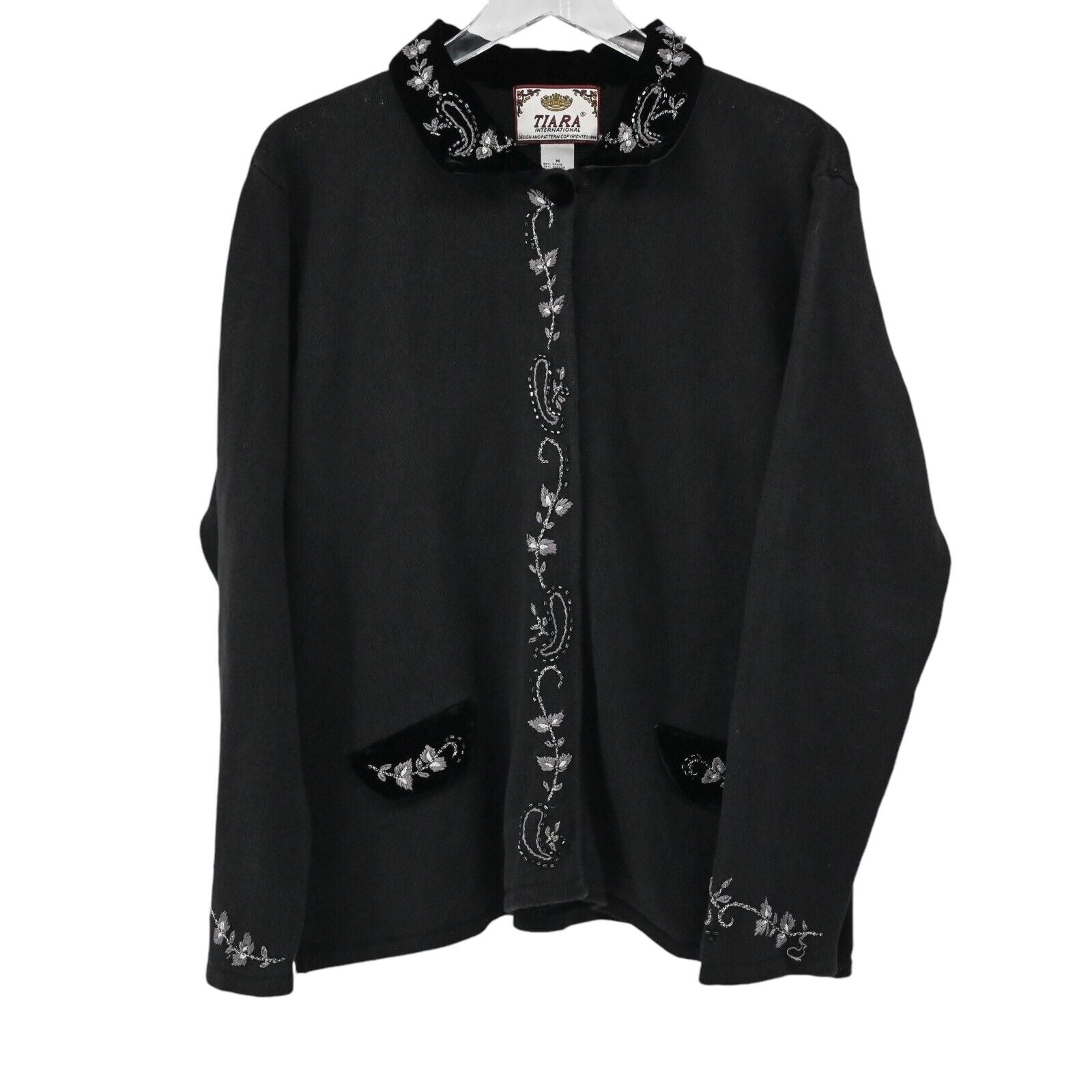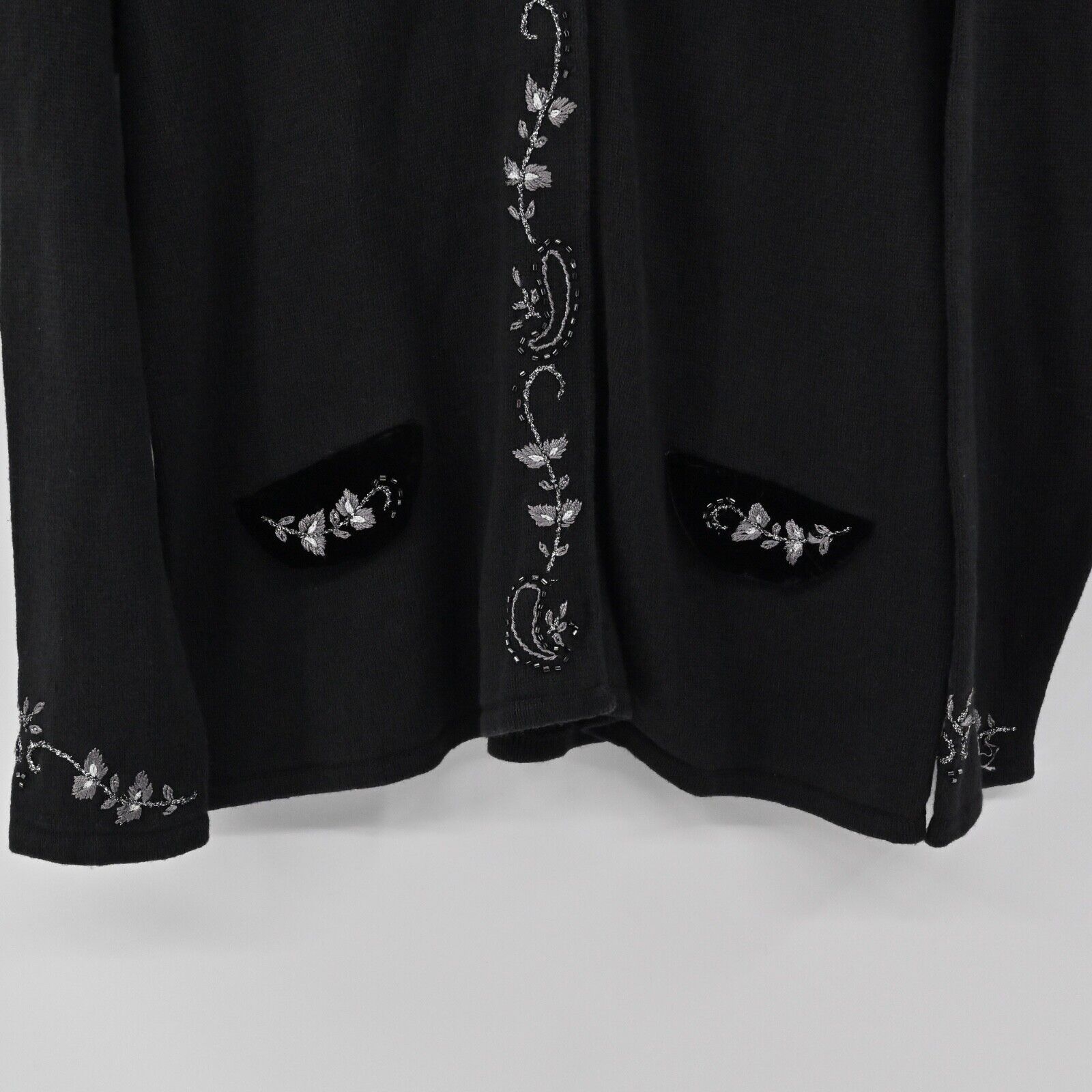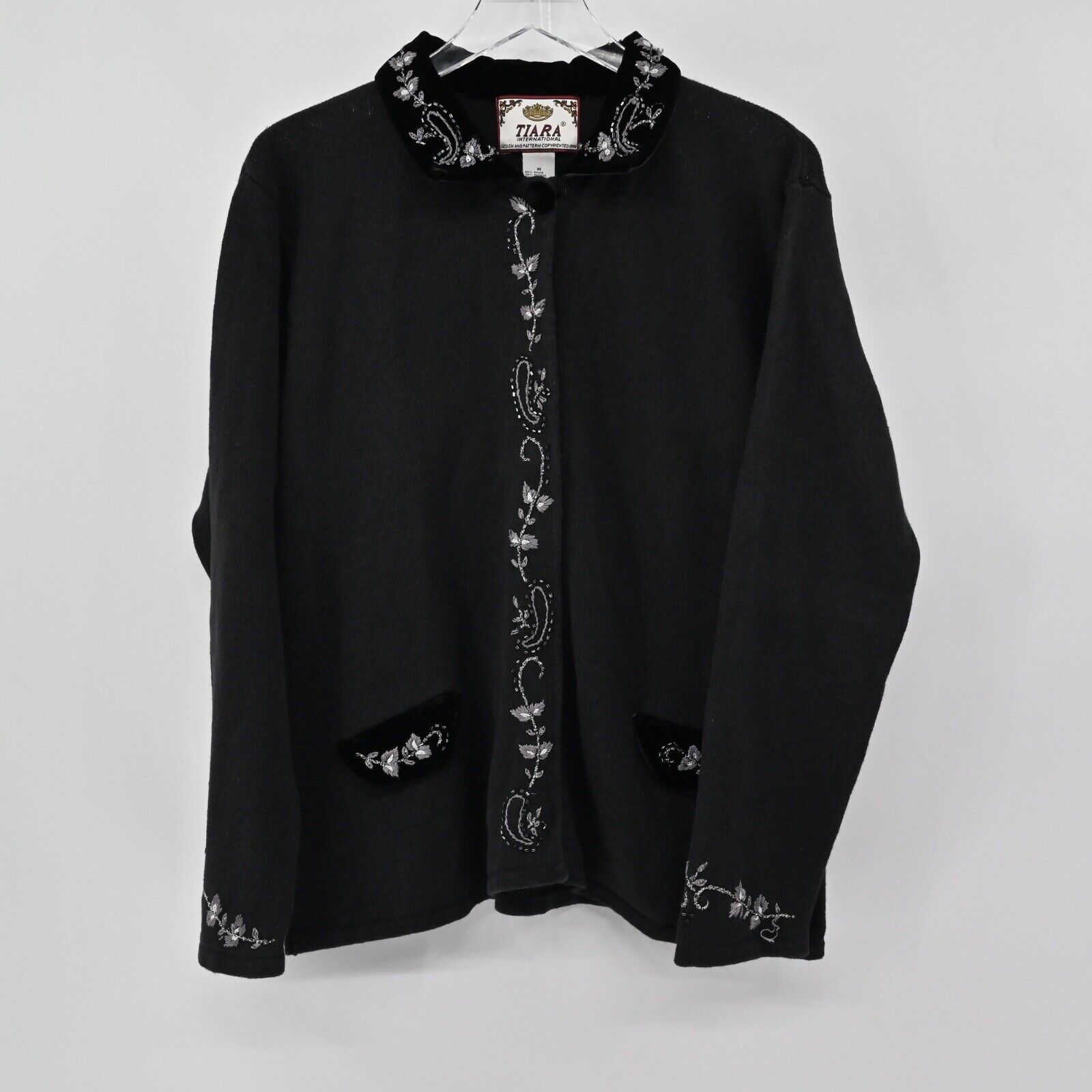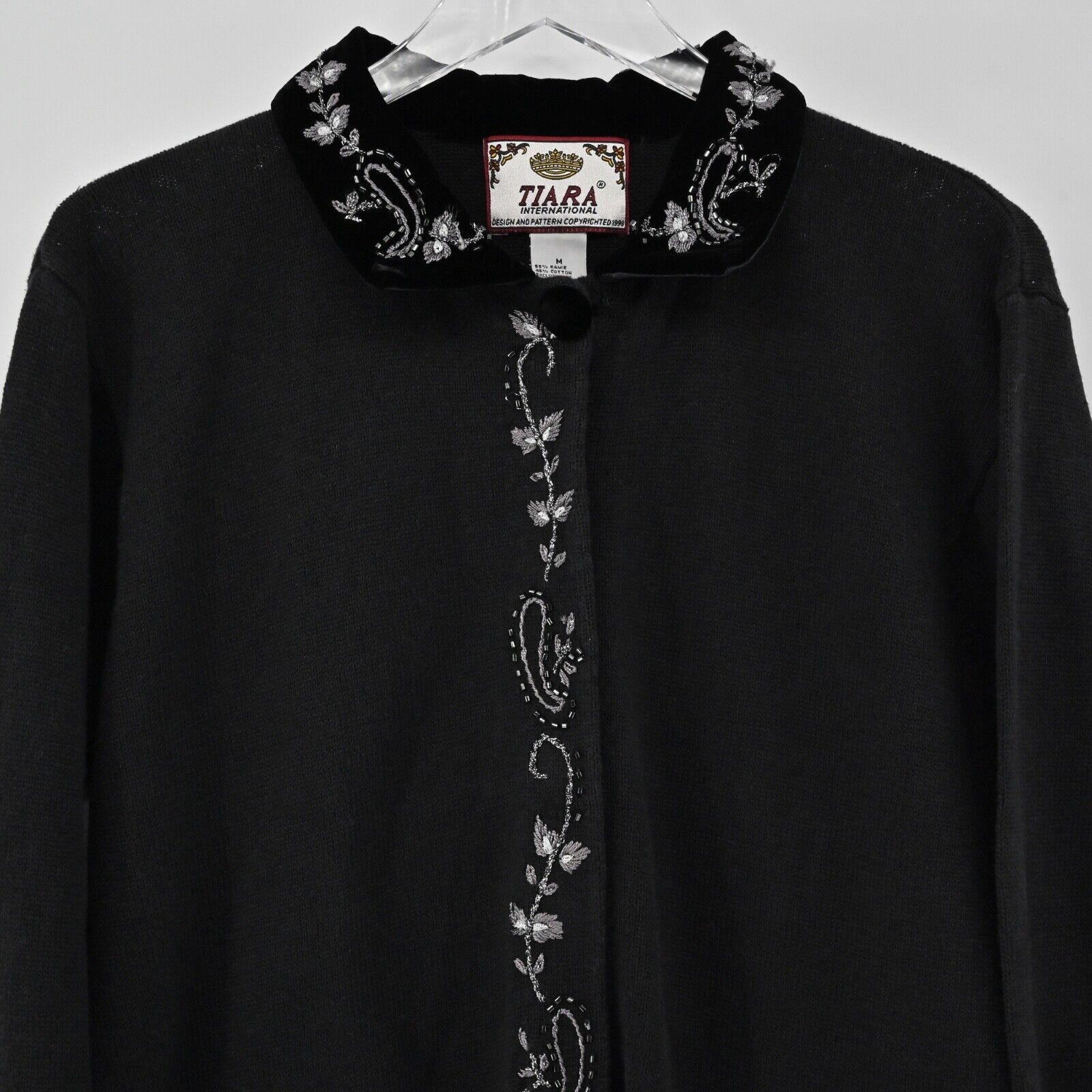 Vintage TIARA INTERNATIONAL Cardigan Women’s Size Medium Black Cotton Blend Silver Metallic Embroidered Beaded Paisley Pattern Velvet Collar & Faux Front Pockets Concealed Button & Snap Closure 90’s 1990’s Retro Whimsigoth Bohemian Boho Glam Chic