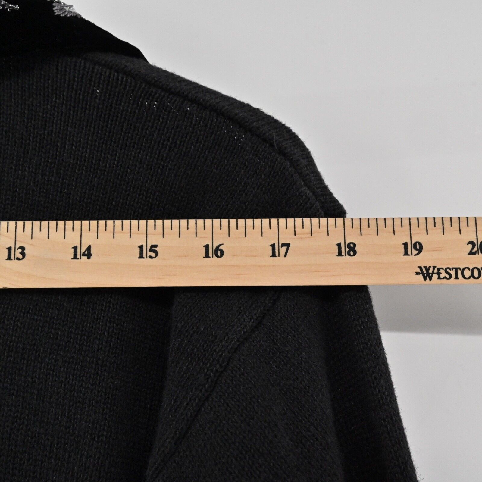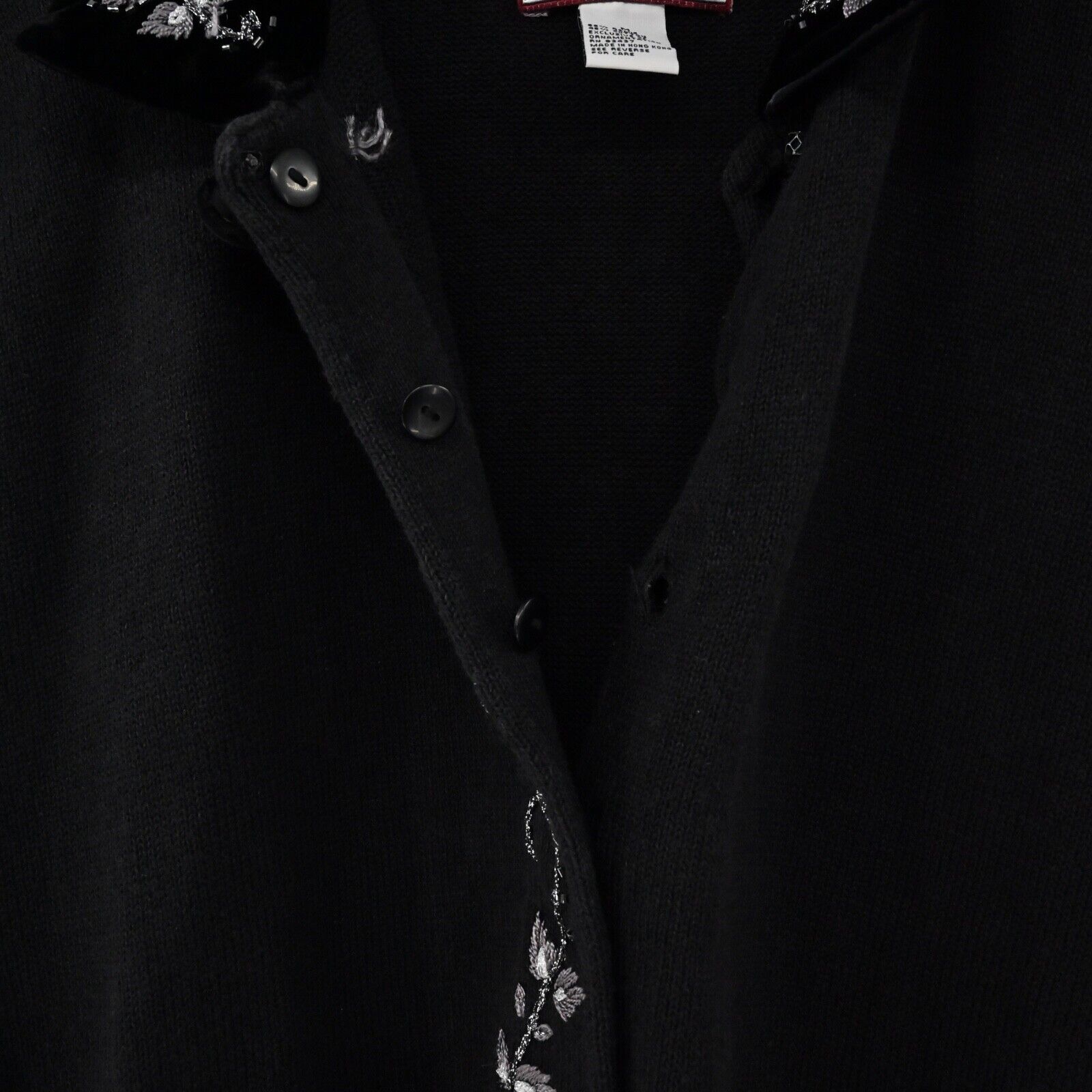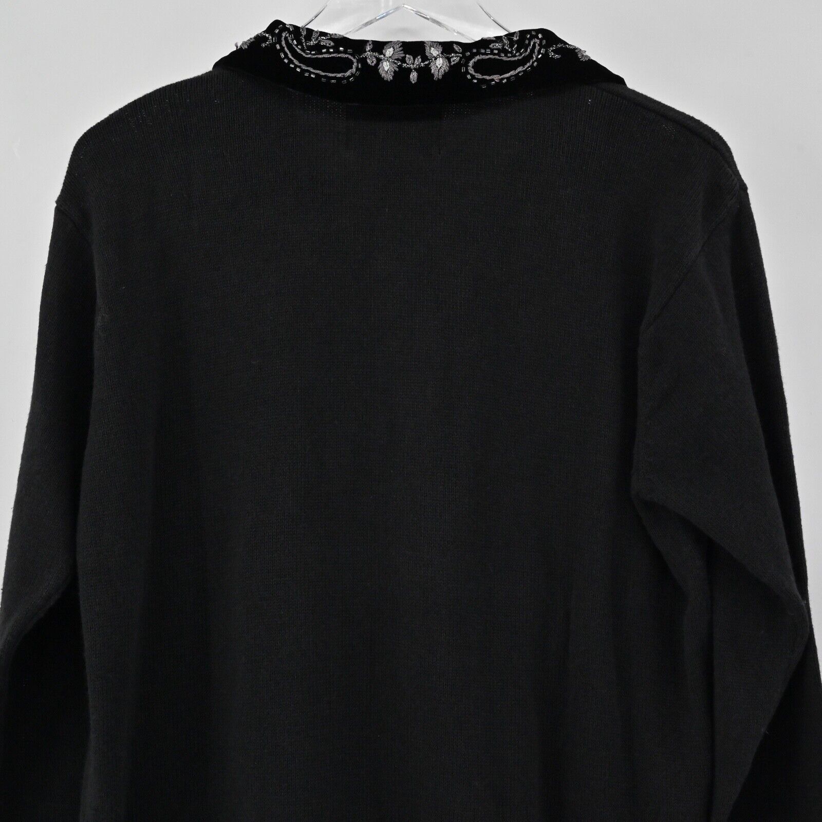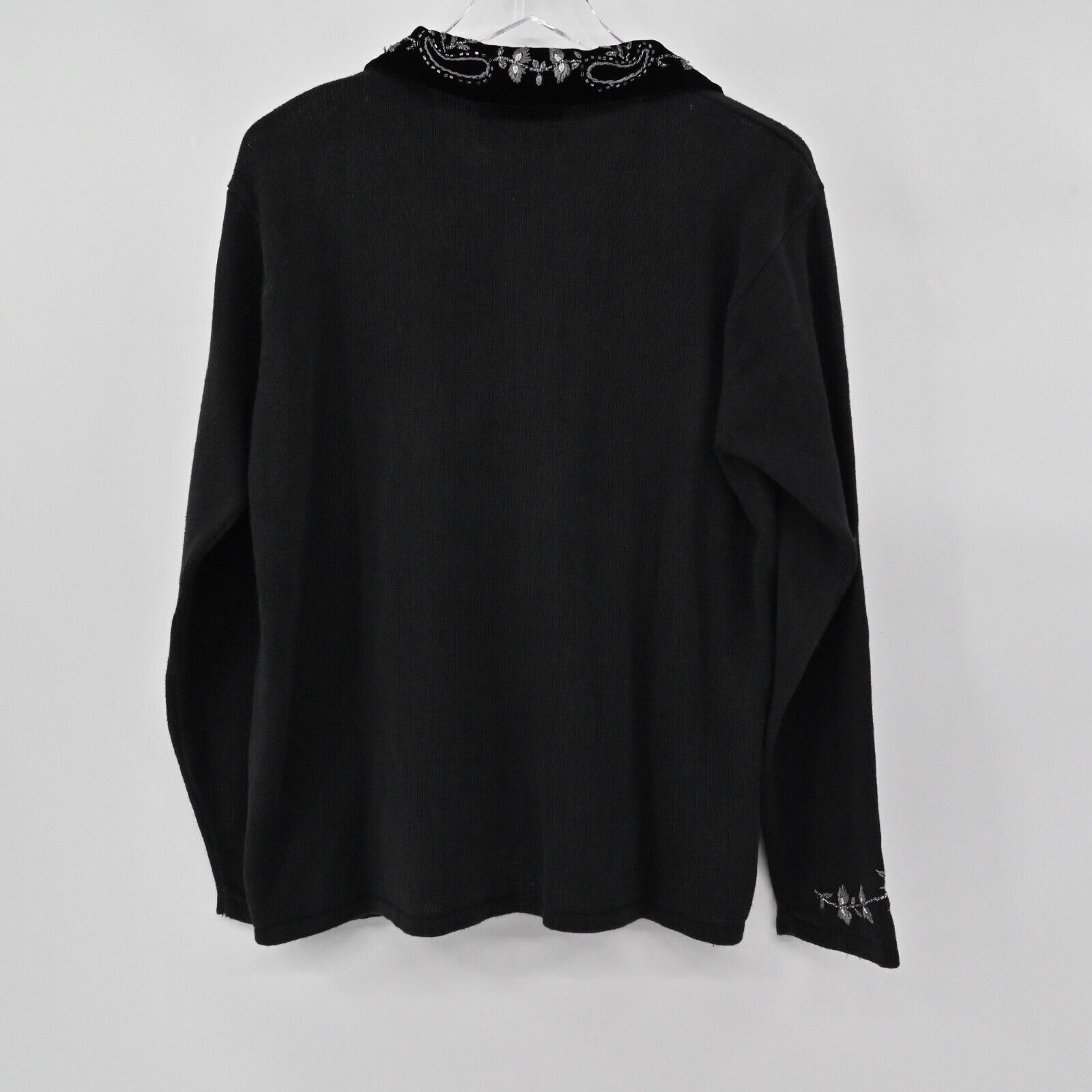 Vintage TIARA INTERNATIONAL Cardigan Women’s Size Medium Black Cotton Blend Silver Metallic Embroidered Beaded Paisley Pattern Velvet Collar & Faux Front Pockets Concealed Button & Snap Closure 90’s 1990’s Retro Whimsigoth Bohemian Boho Glam Chic