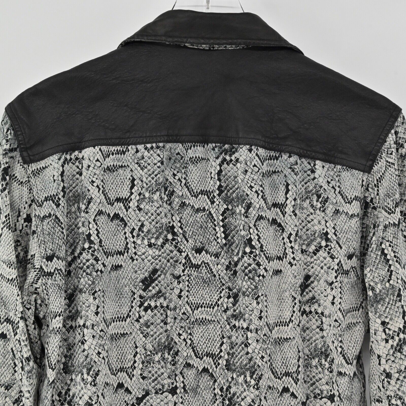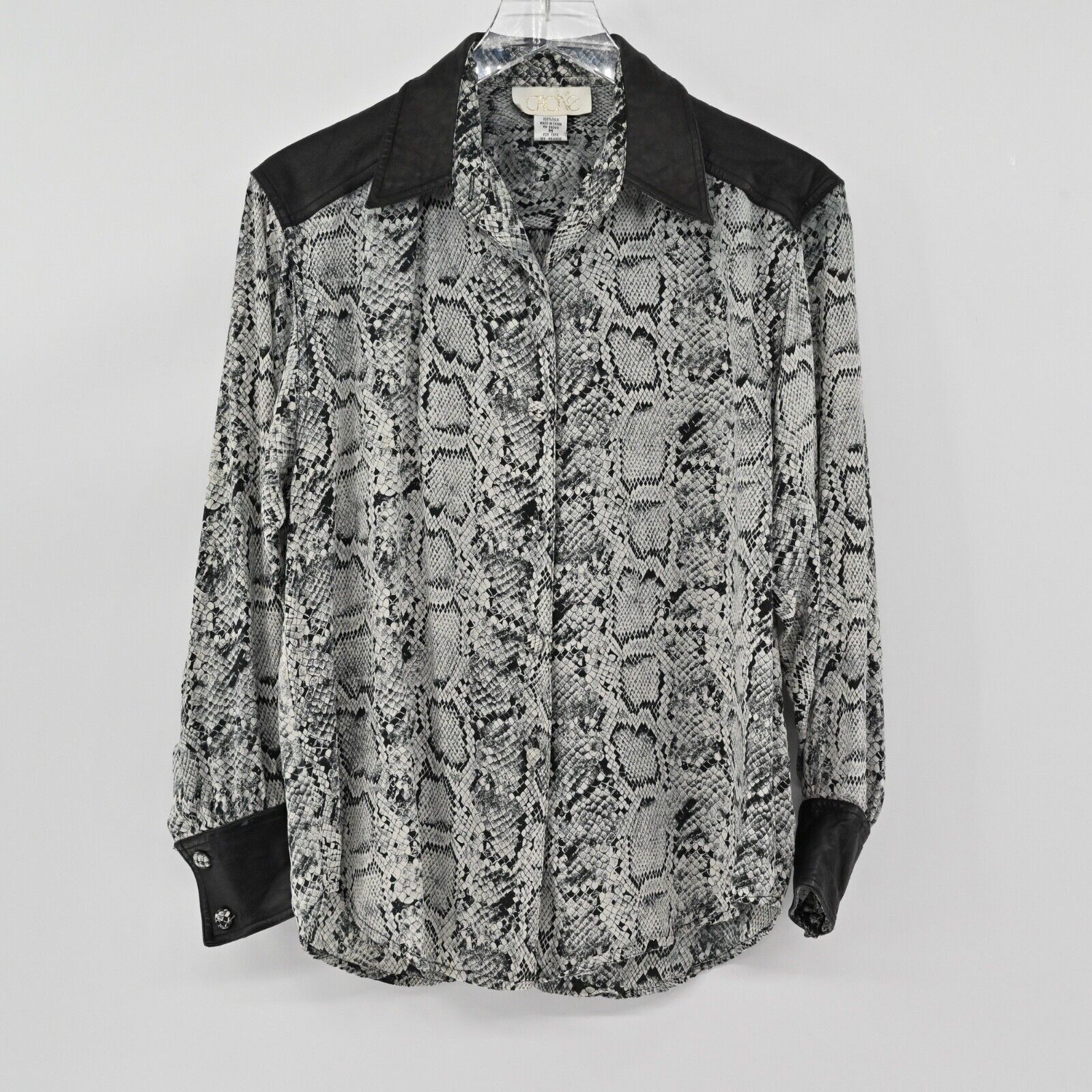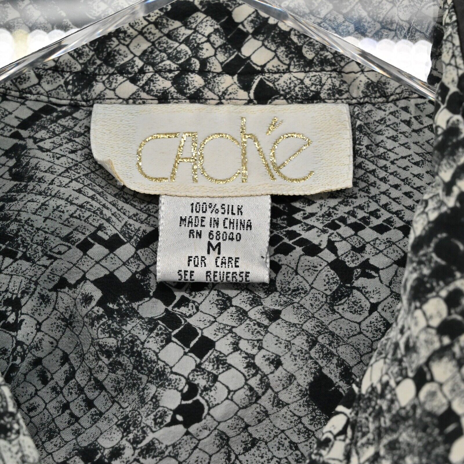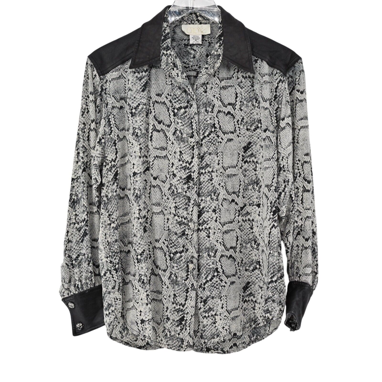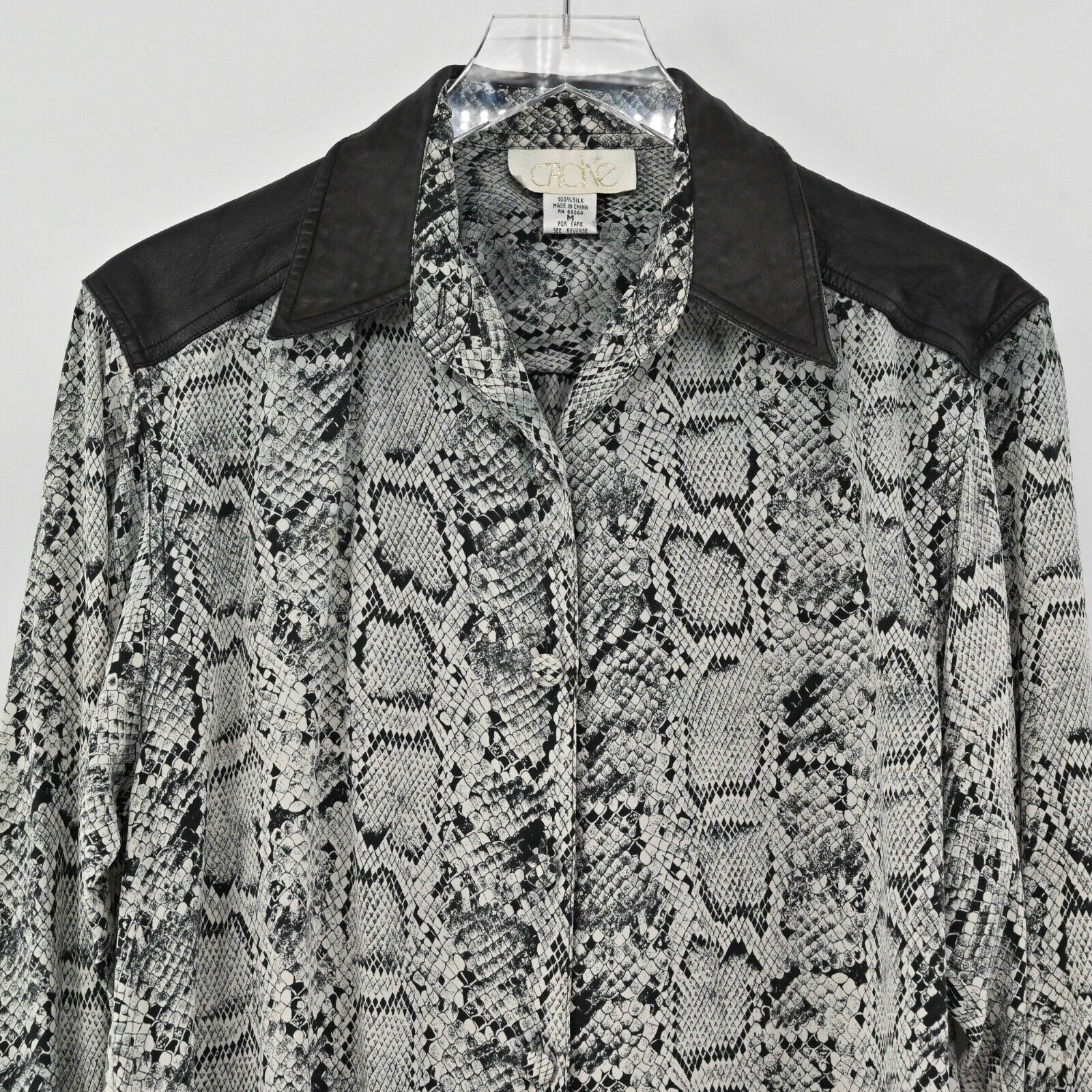 Vtg CACHE Top Womens Sz M Black Snakeskin Print Silk Faux Leather Button Up 90s