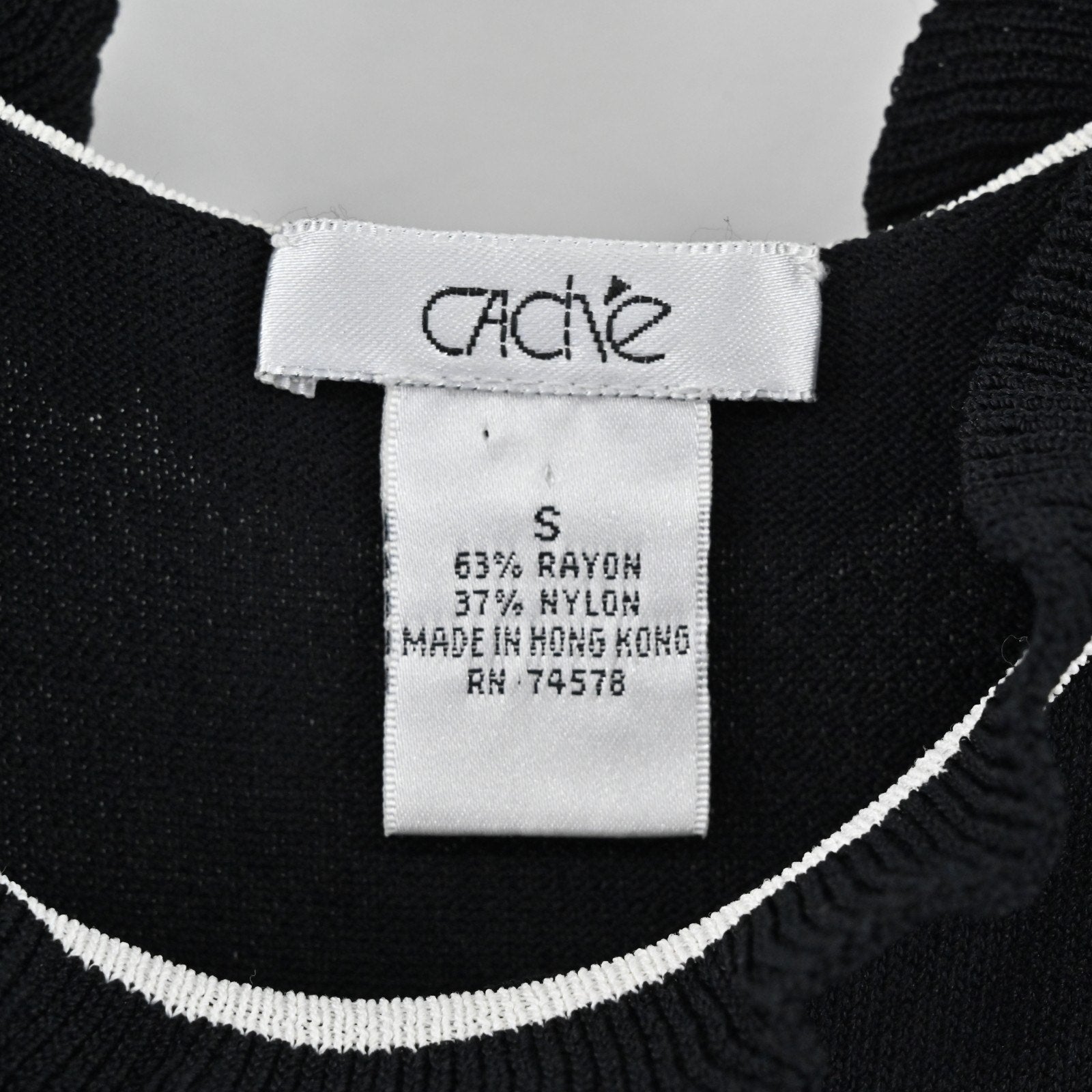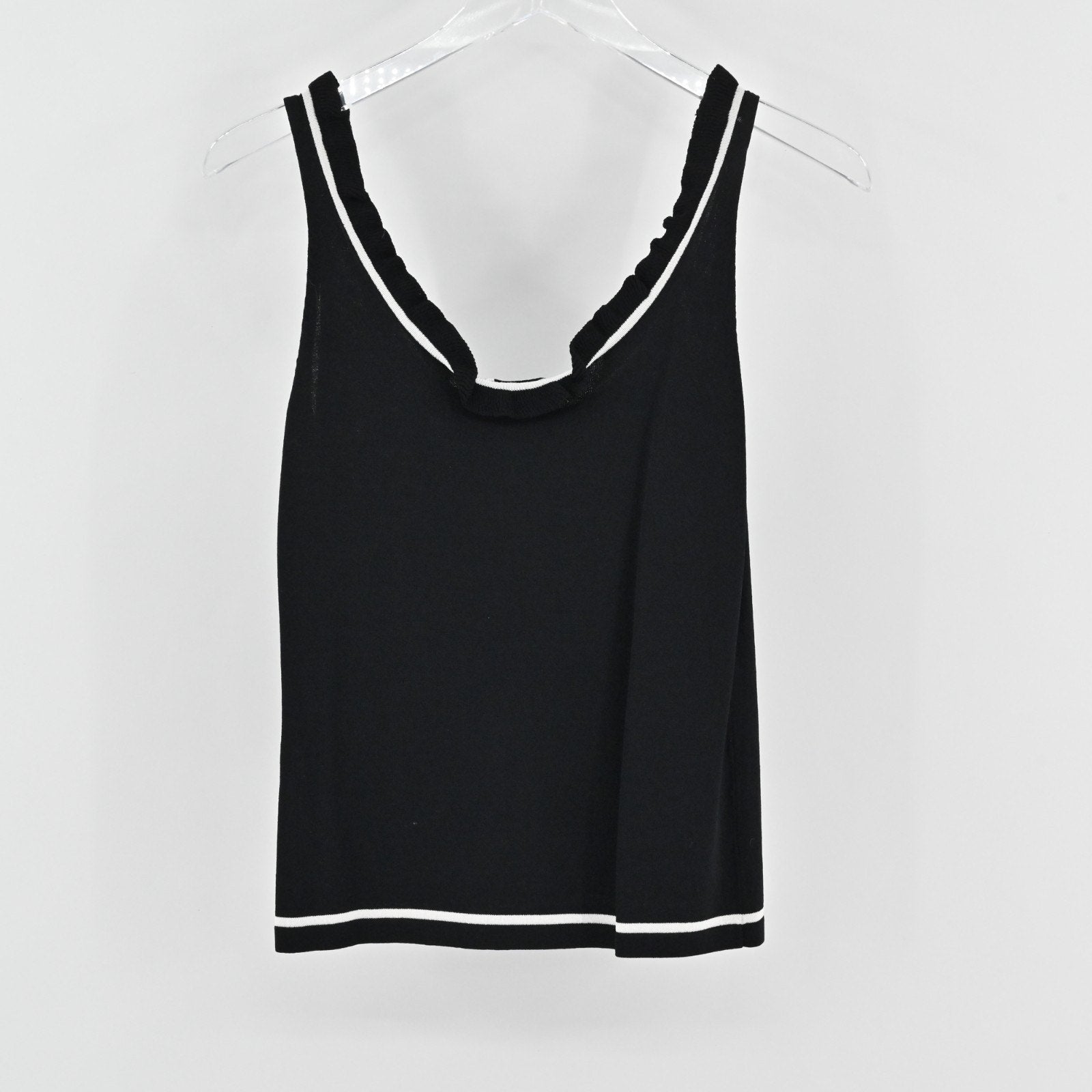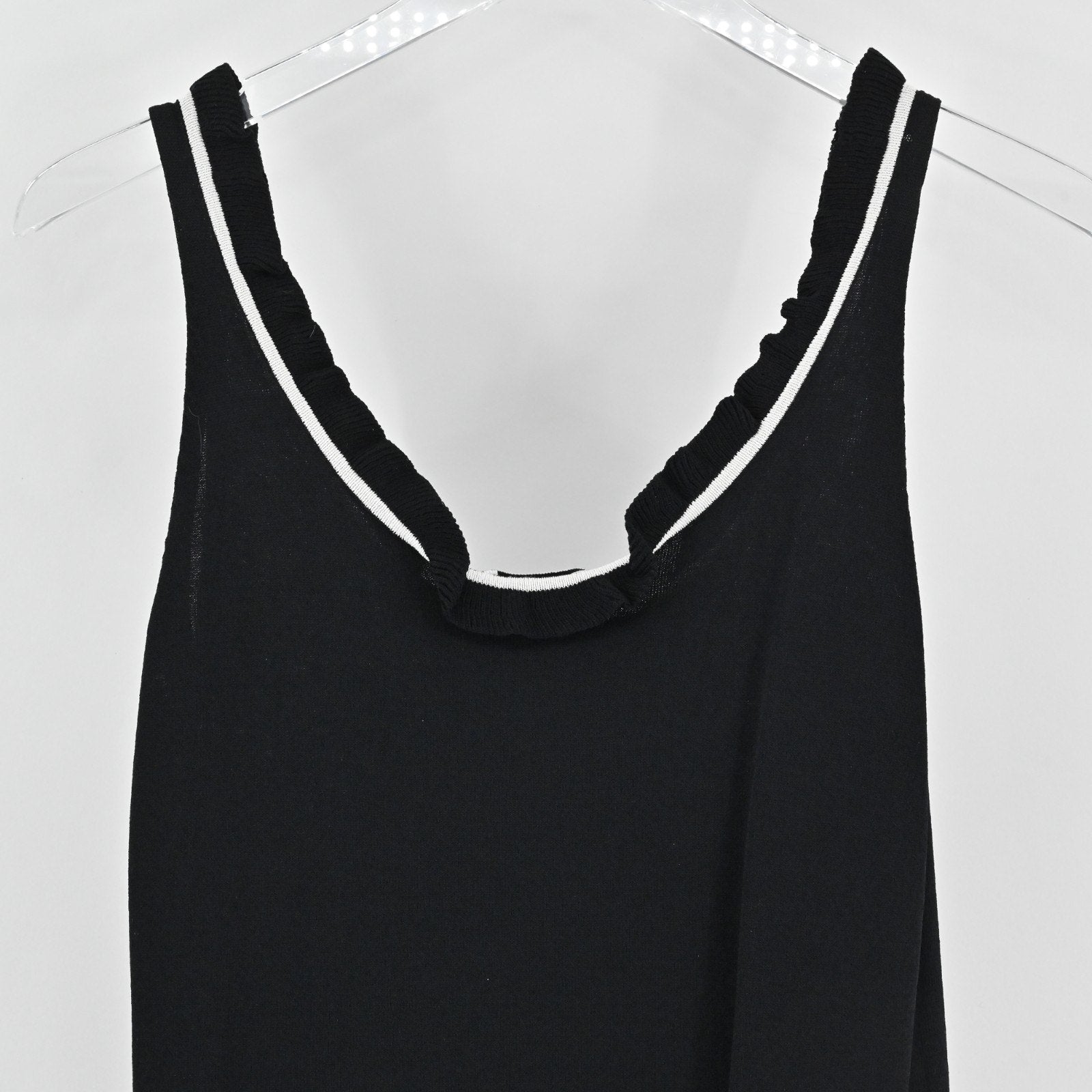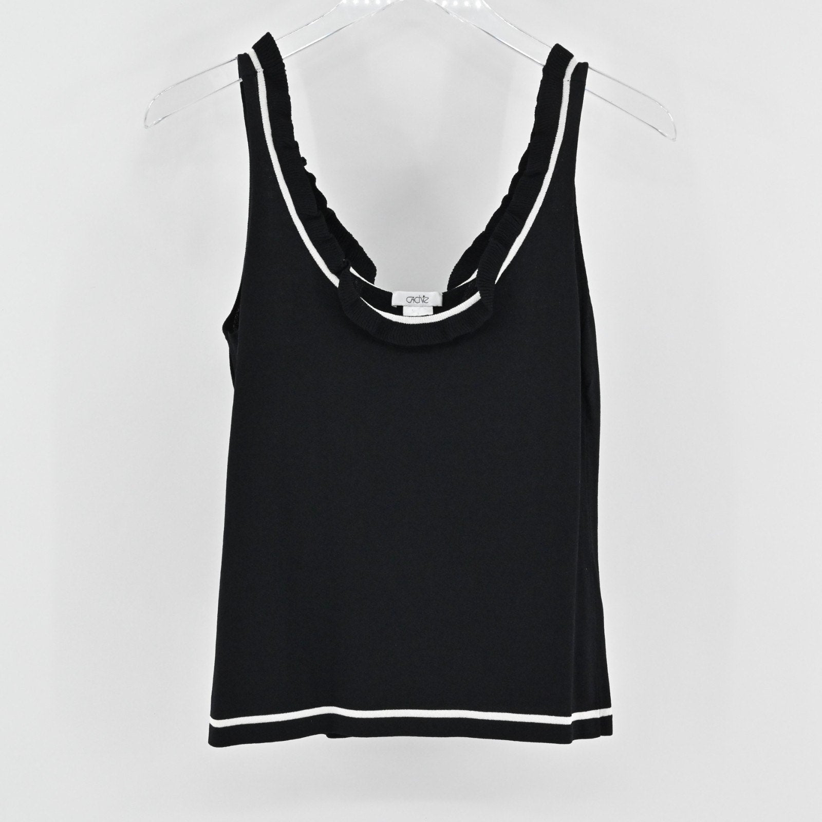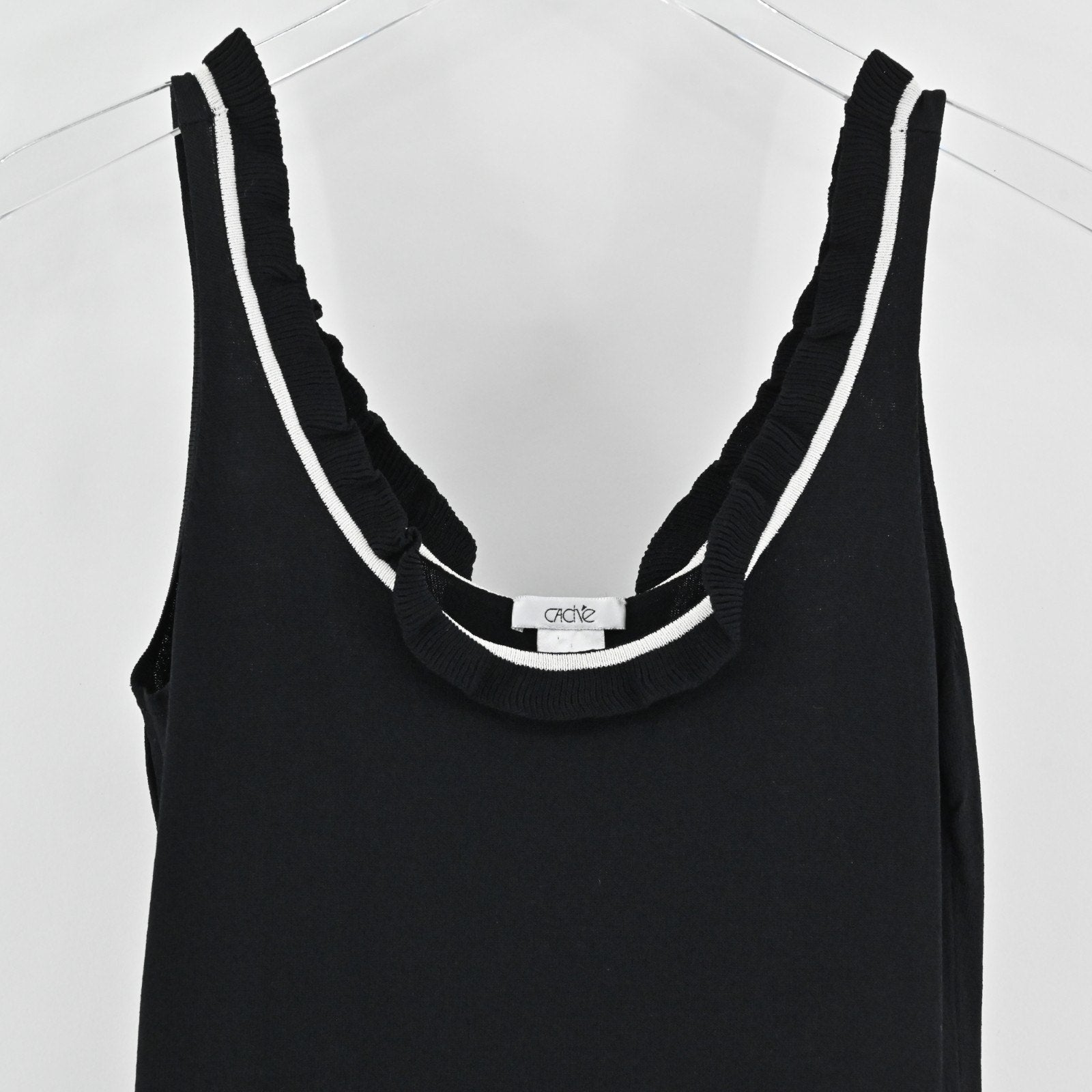 Vtg Cache Womens Knit Black Sleeveless Top Size S Ruffle Neck White Trim Blouse