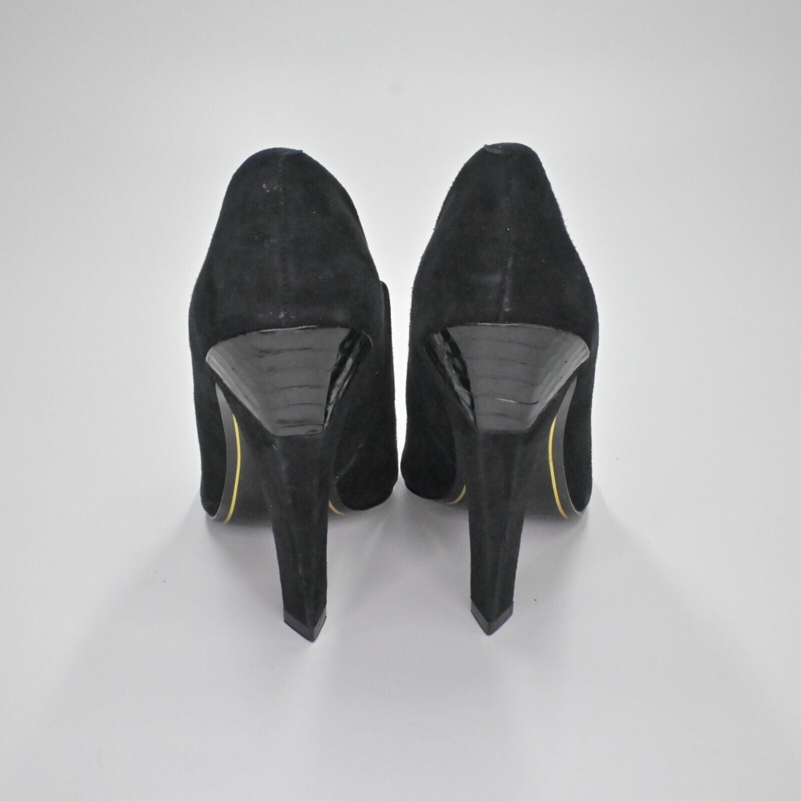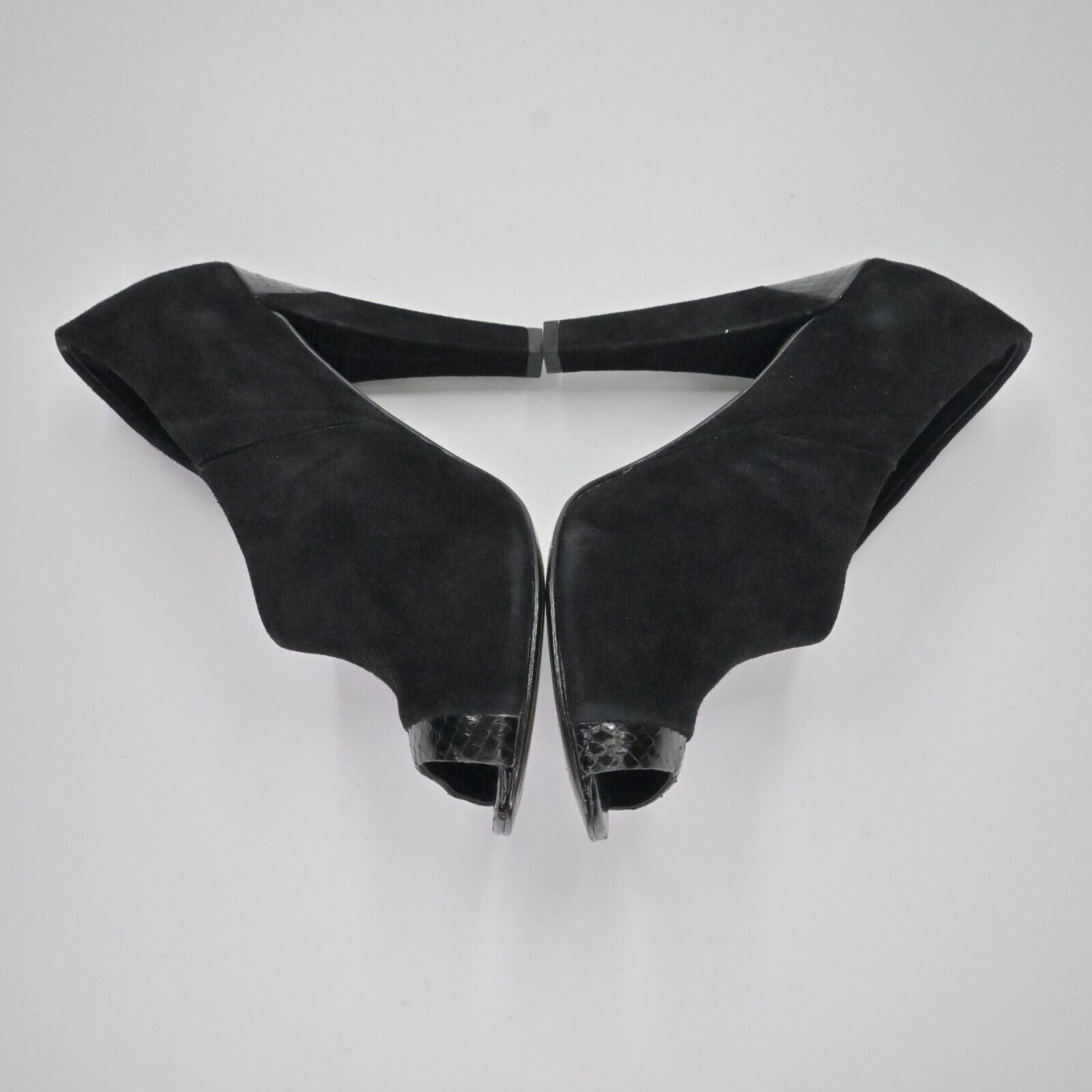 Vintage CHARLES JOURDAN Heels Women's Size 8 Black Suede Snakeskin Embossed Leather Peep Toe Ultra High Block Heel Low Top Slip On Leather Sole 00’s Y2K Early 2000’s Retro Grunge Gothic
