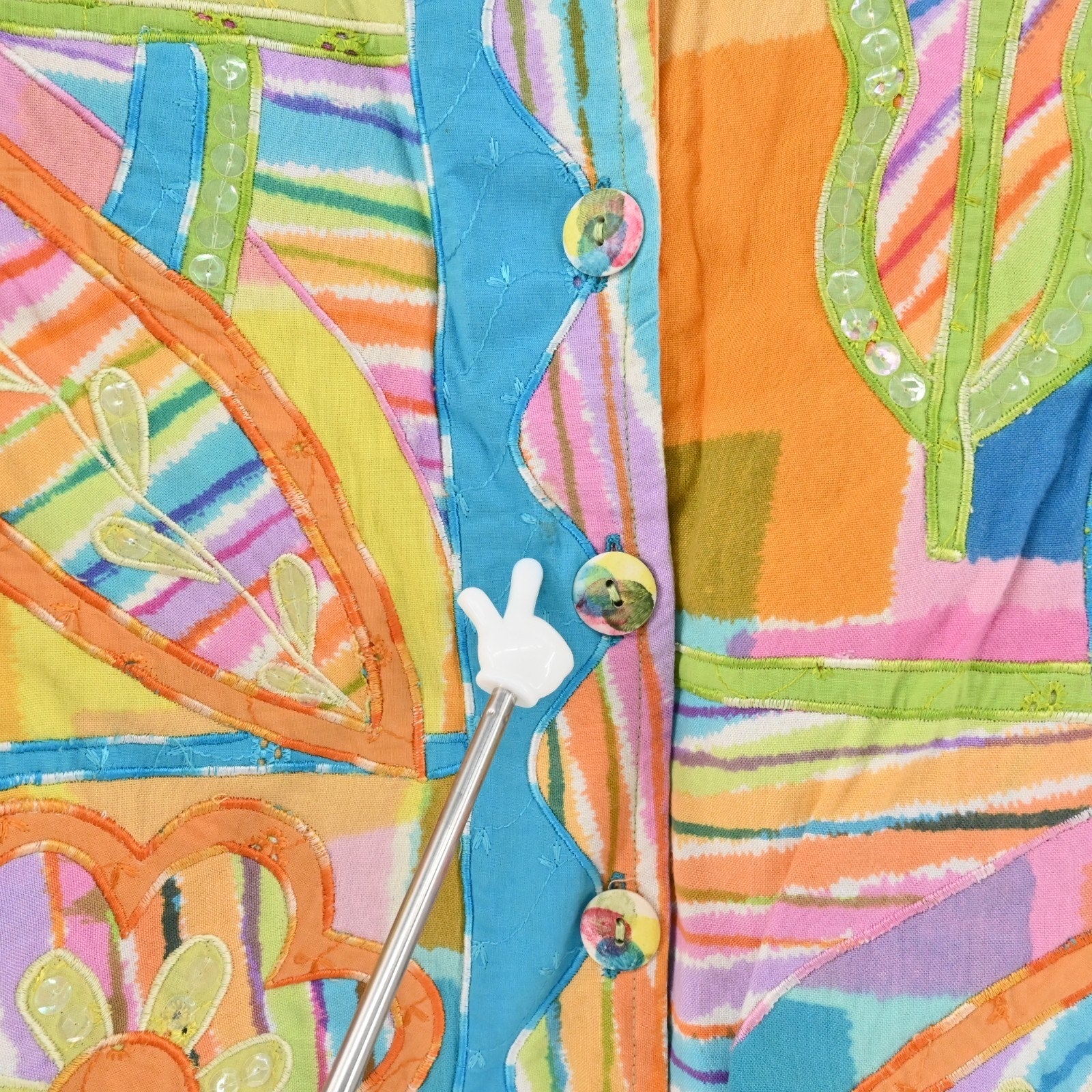 Style Profile: Art to Wear Colorful Patchwork Jacket Boho Artsy Festival Statement Piece Embellished Floral Embroidery Bright Multicolor Button Front Long Sleeve Vintage Inspired Lightweight Unique Design Artistic Wearable Art Teacher Vibrant Retro Style Layering Piece Spring Fashion Bold Look