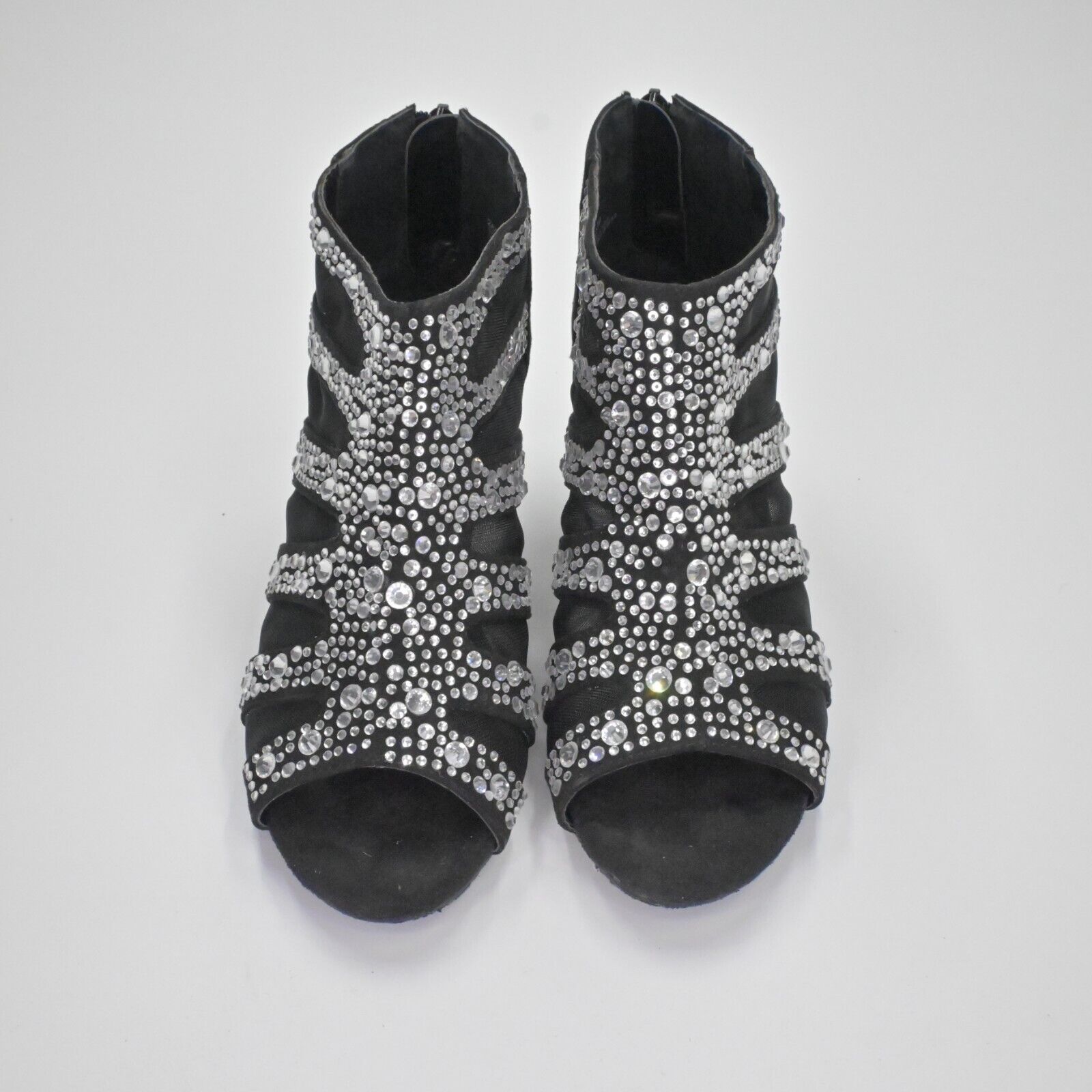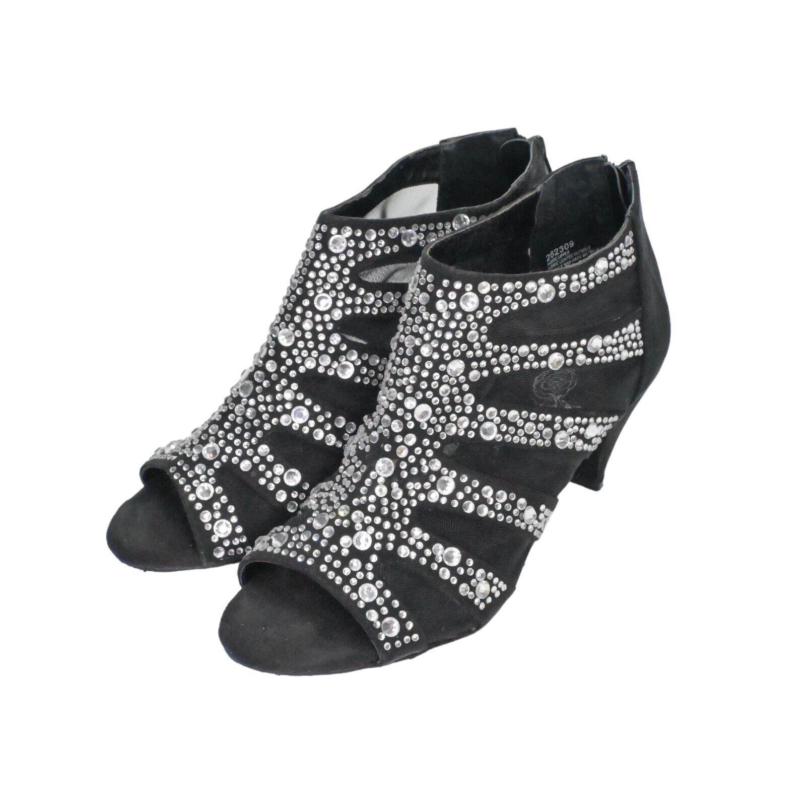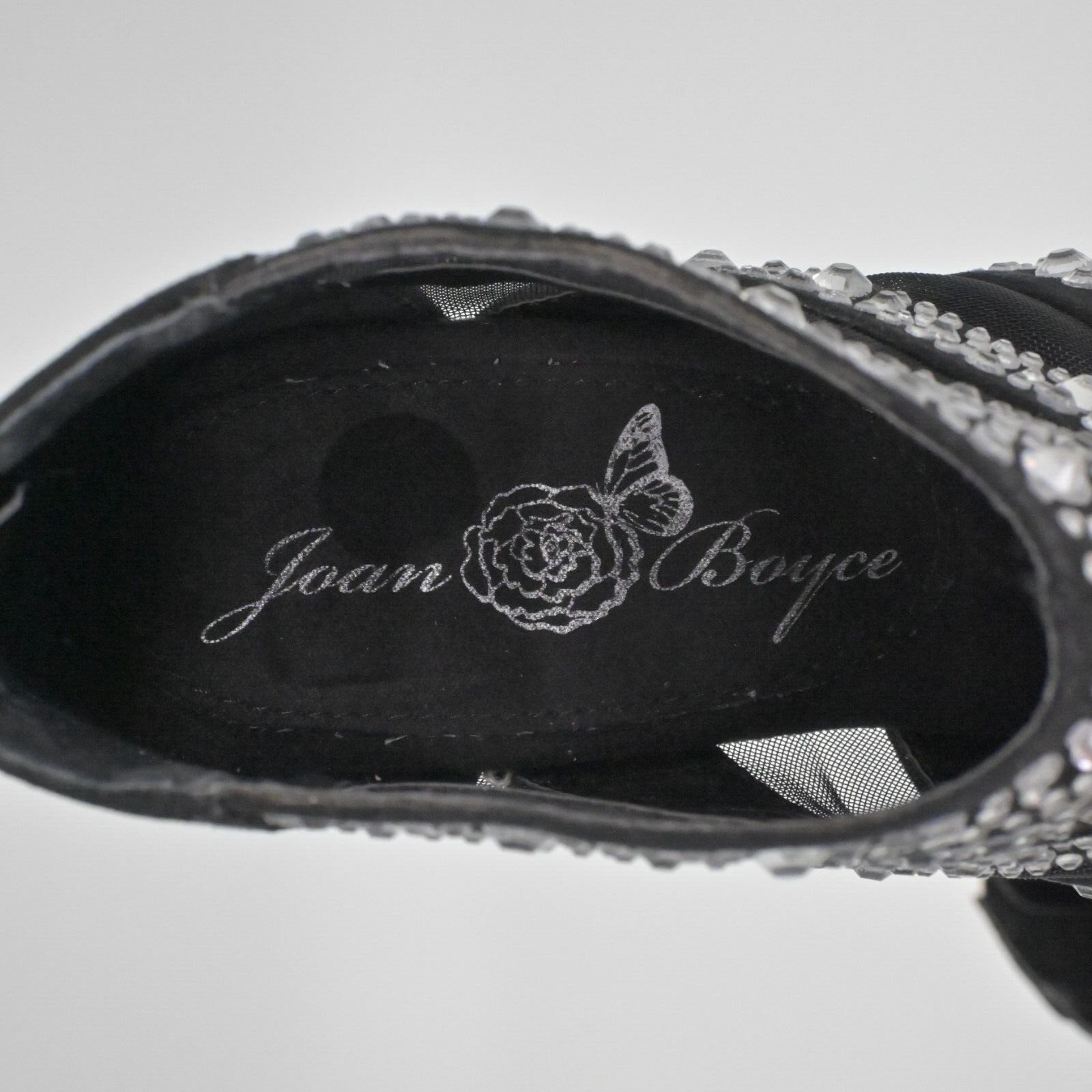 Vtg JOAN BOYCE Heels Womens Sz 7.5 Black Faux Suede Mesh Rhinestone Peep Toe Y2K