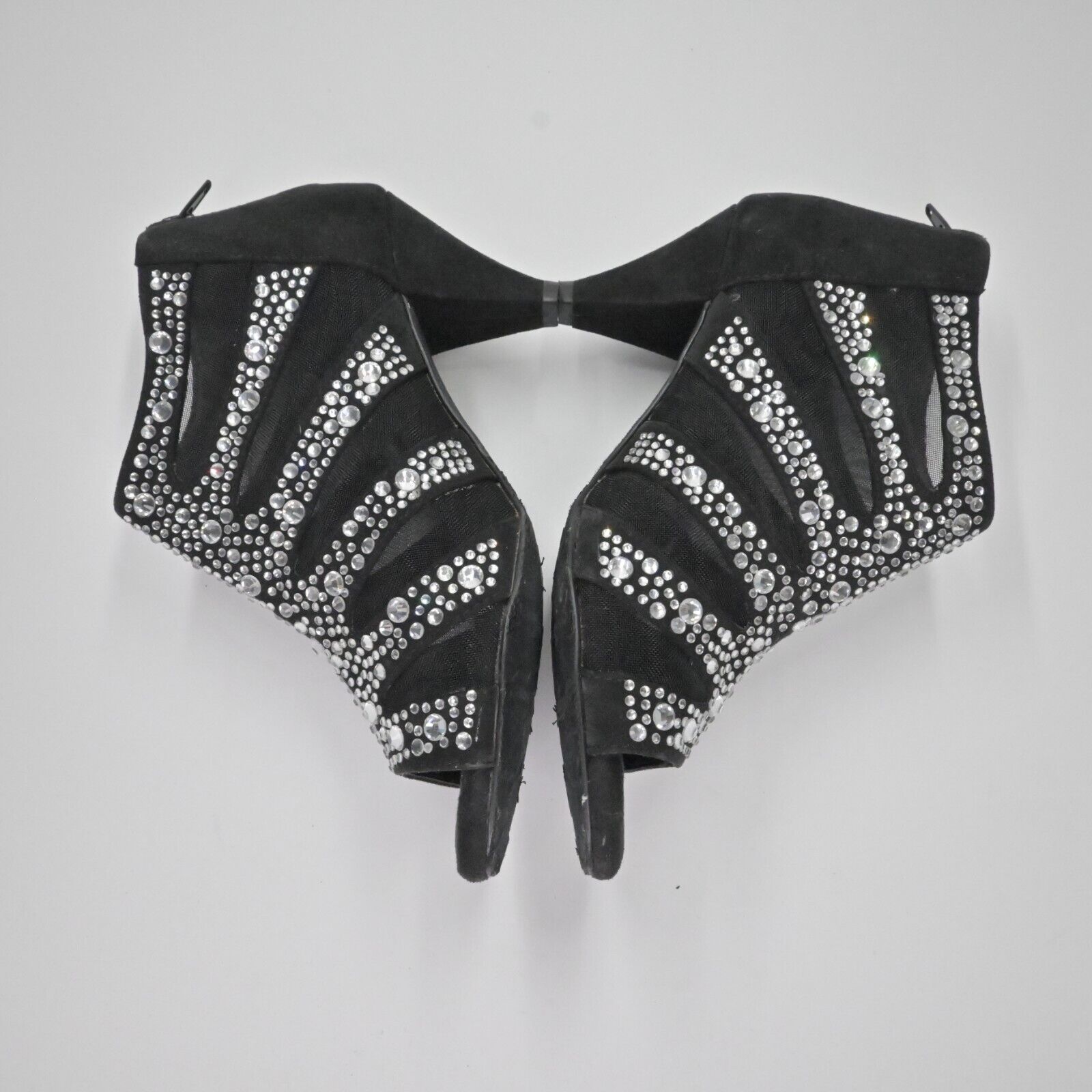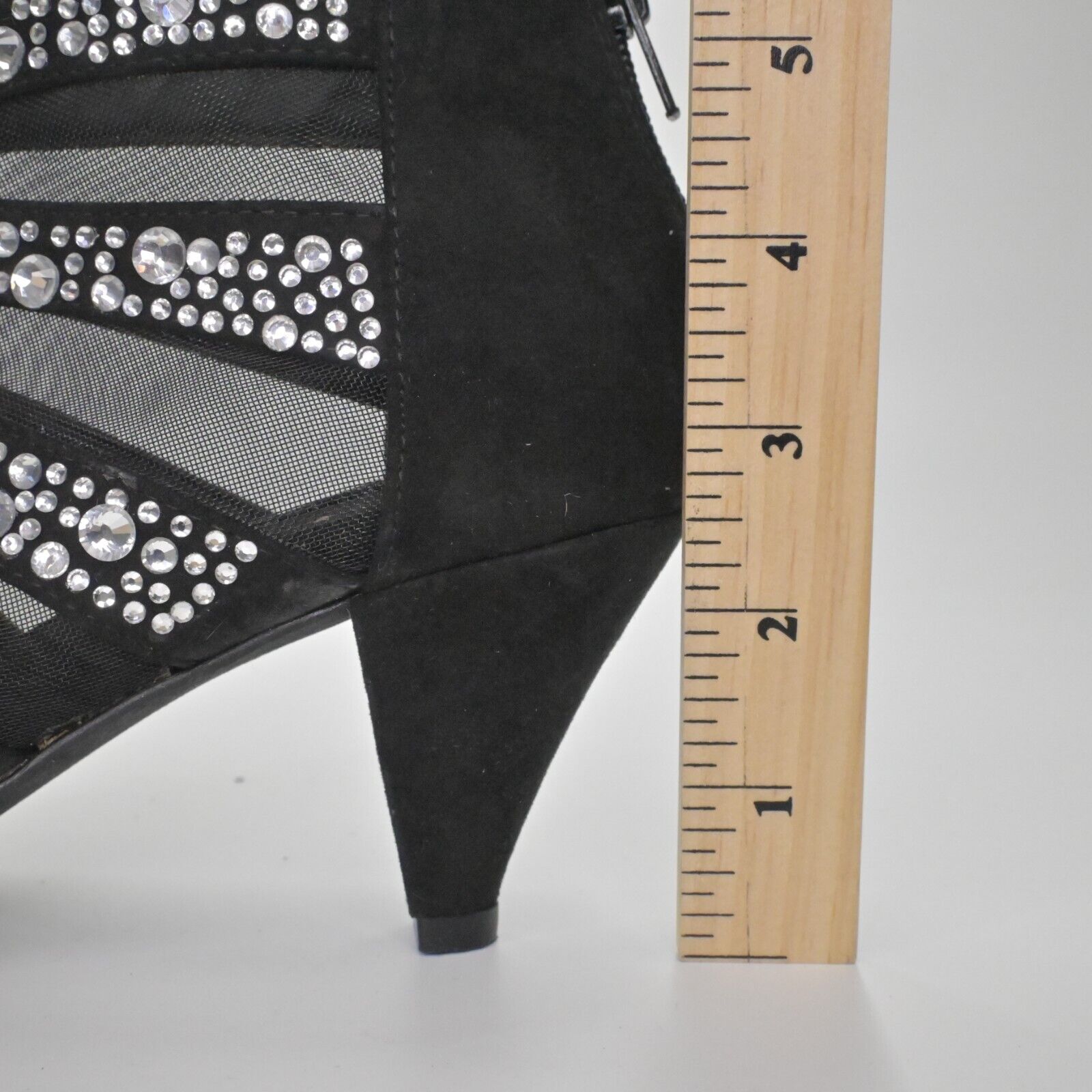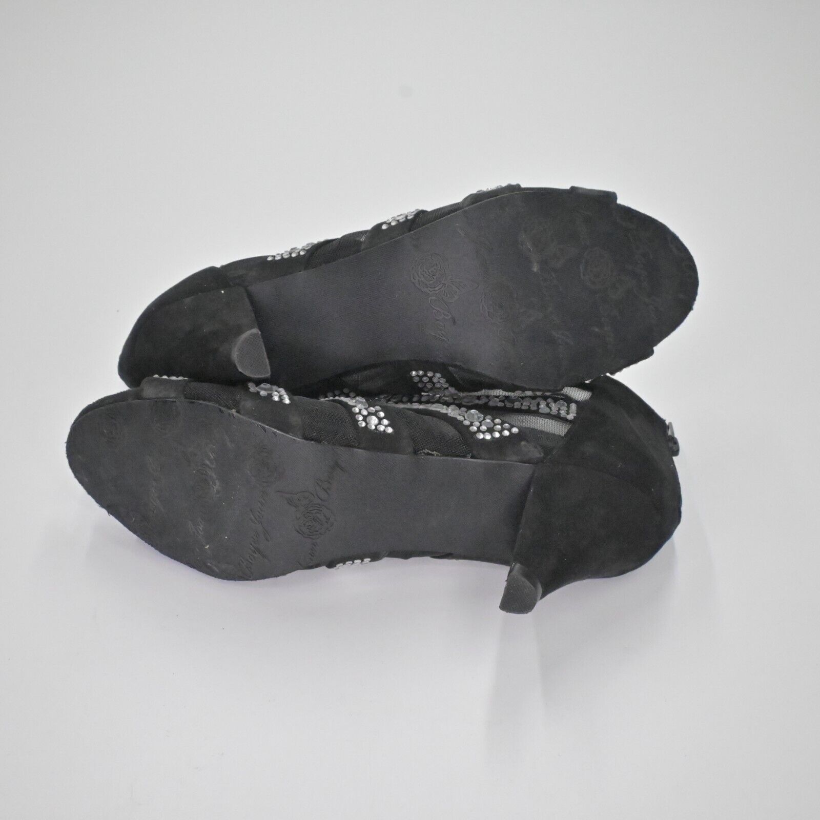 Vintage JOAN BOYCE Heels Women's Size 7.5 Black Faux Suede Mesh Panel Rhinestone Peep Toe Cone Heel Back Zip Closure Rubber Sole 00’s Y2K Early 2000’s Retro Glam