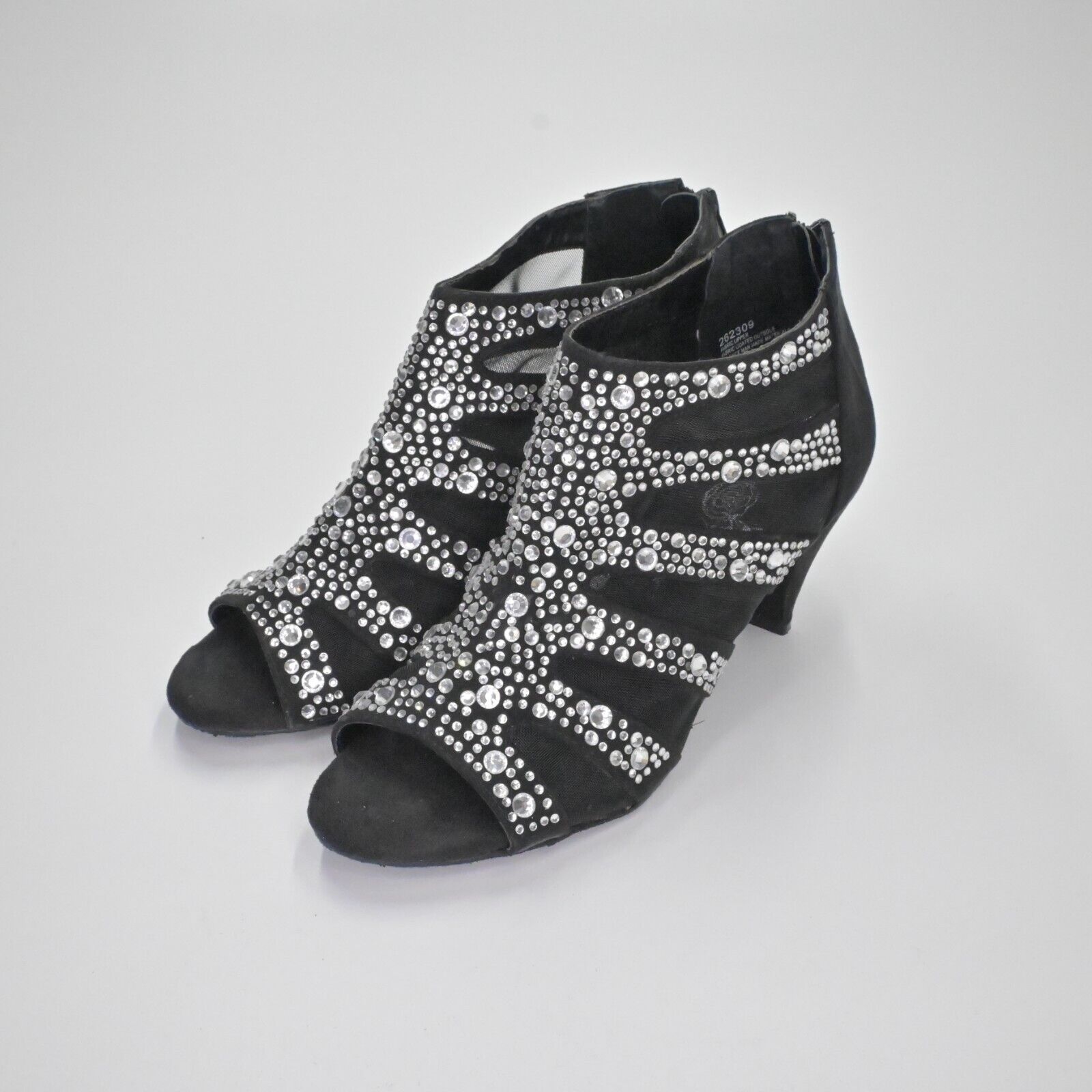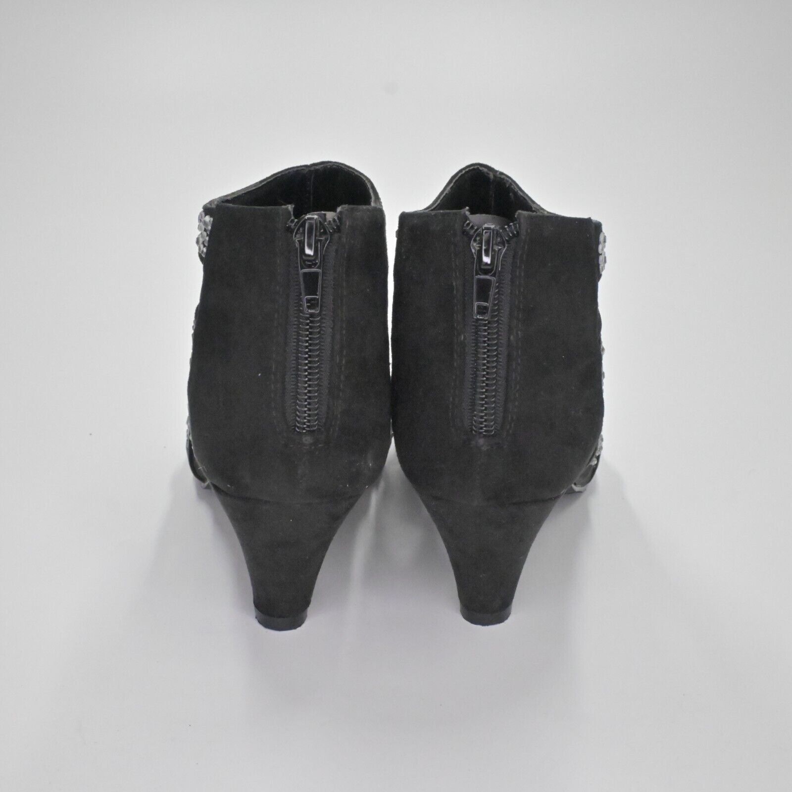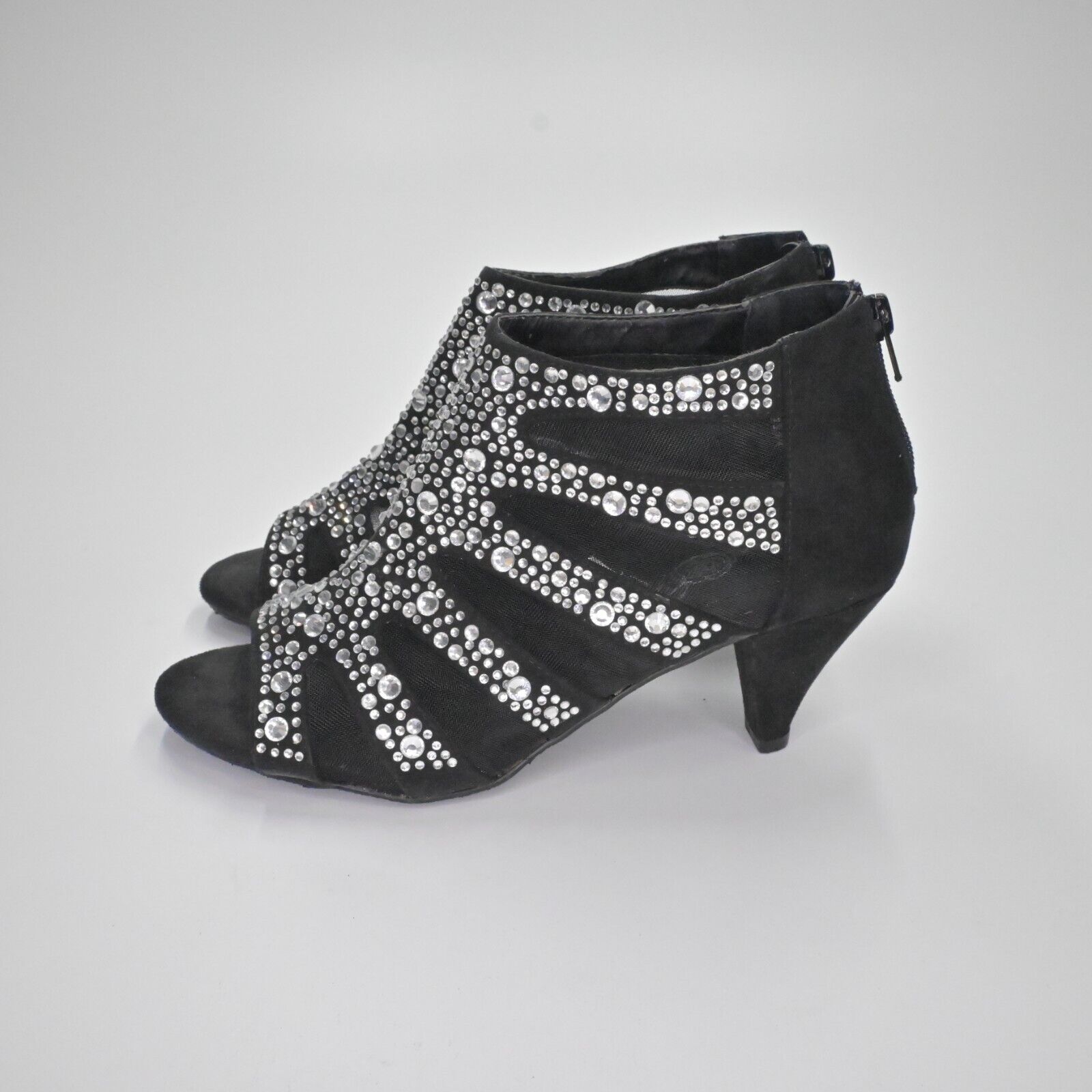 Vintage JOAN BOYCE Heels Women's Size 7.5 Black Faux Suede Mesh Panel Rhinestone Peep Toe Cone Heel Back Zip Closure Rubber Sole 00’s Y2K Early 2000’s Retro Glam