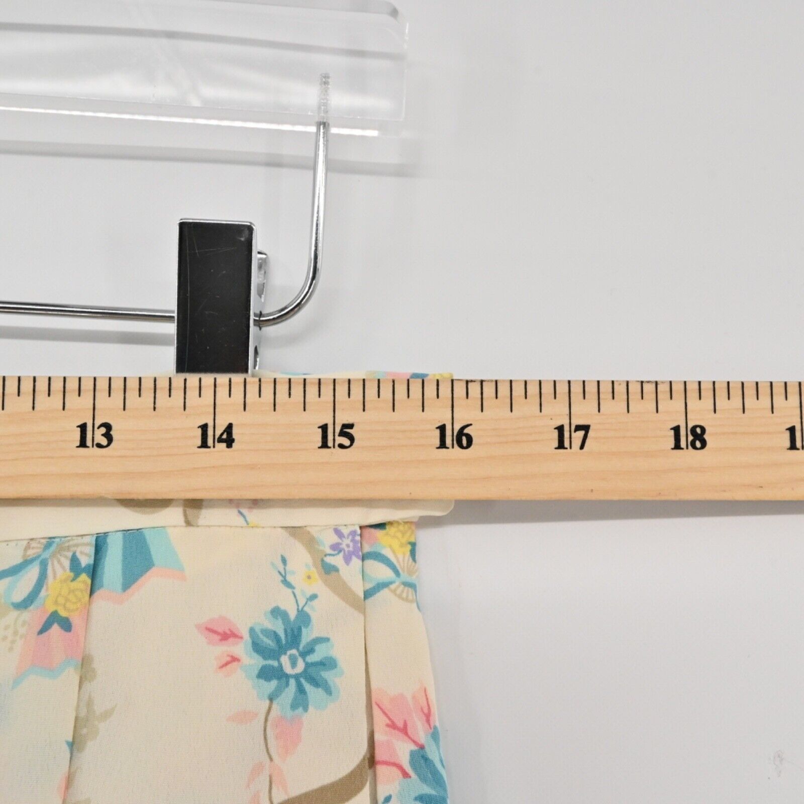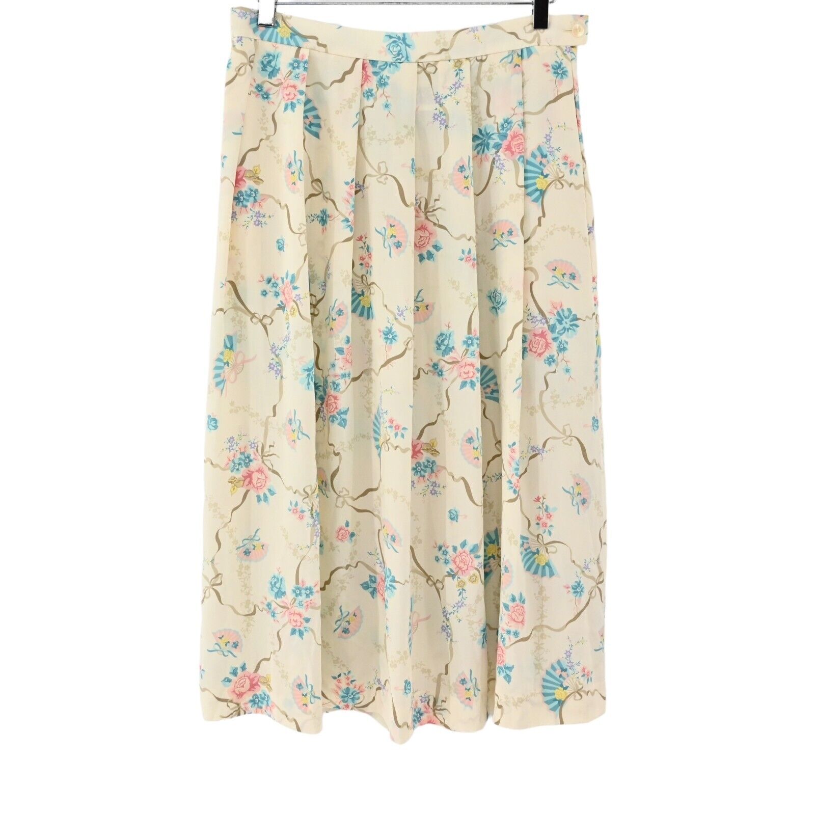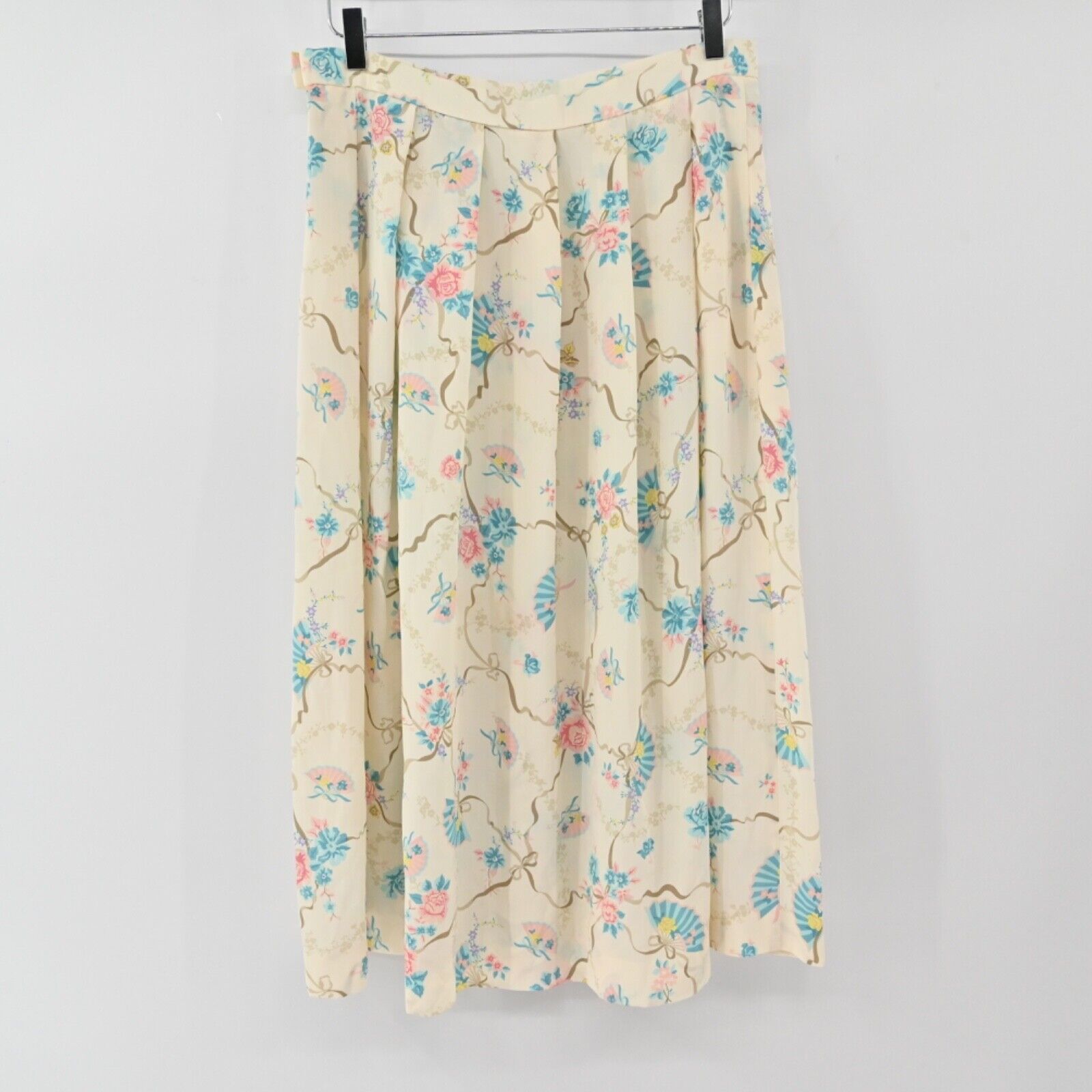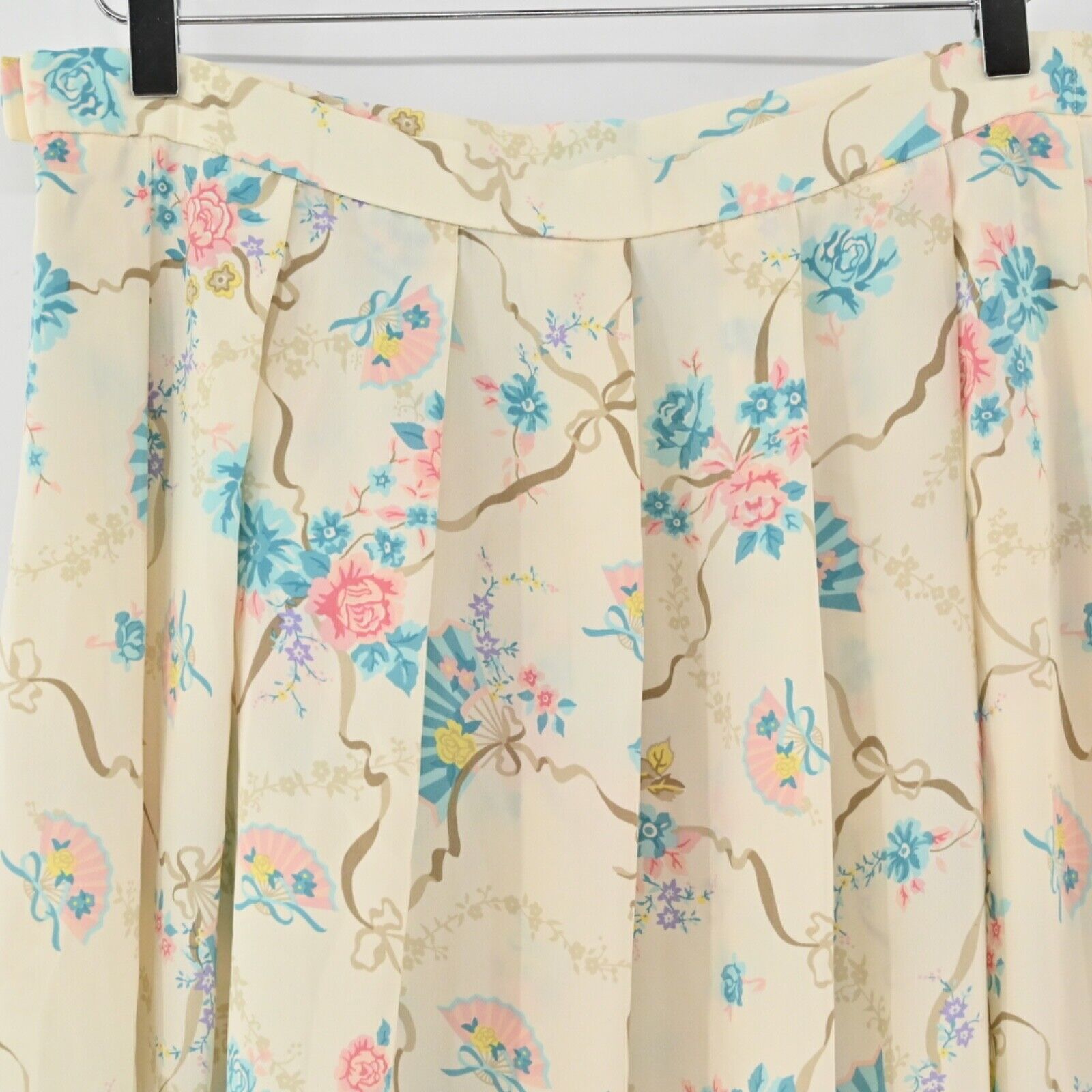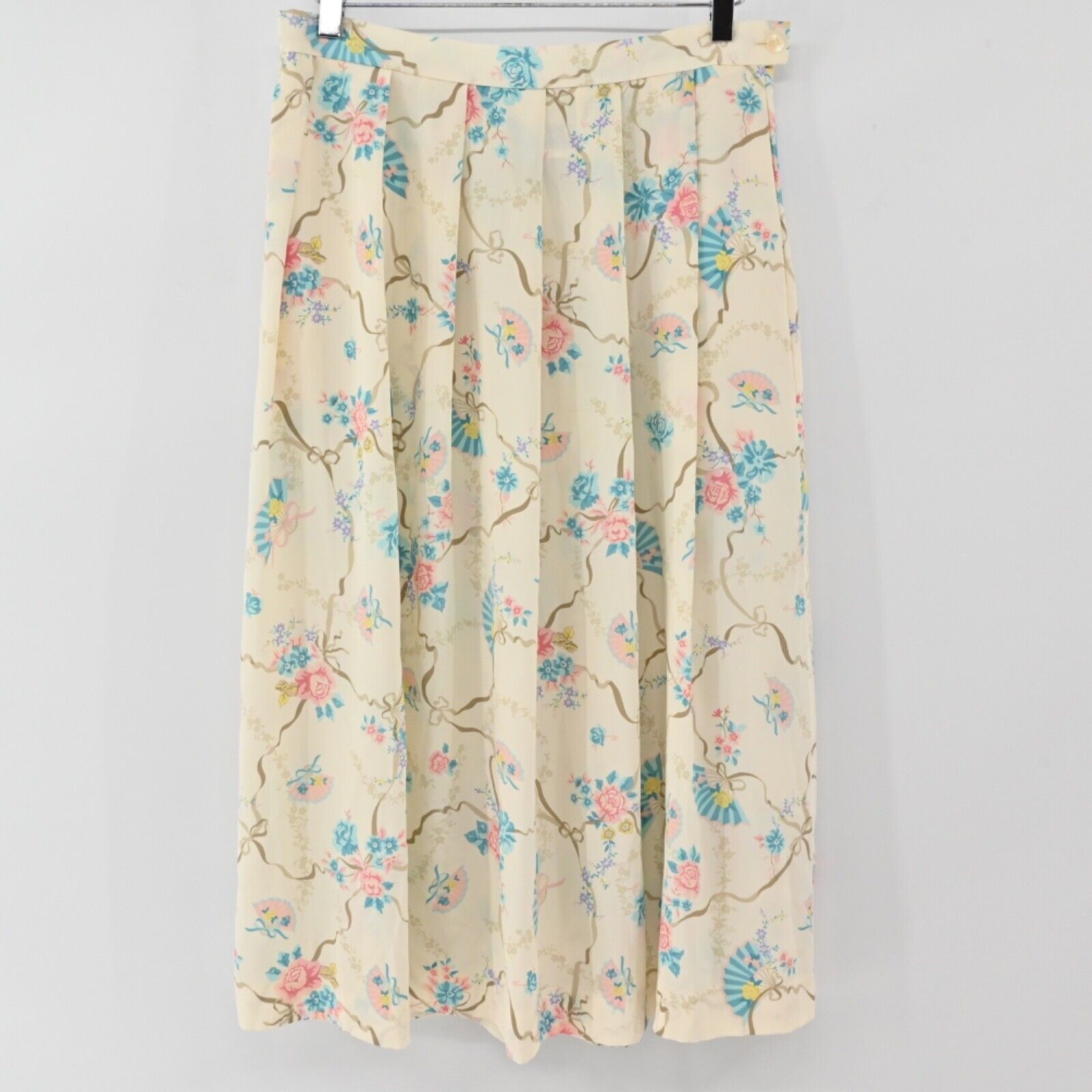 Vintage KORET CAREER Skirt Women's Size Small Ivory With Multicolor Floral, Fans, & Ribbon Bows Print Pleated Midi Button Closure 80’s 1980’s Retro Office Coquette Preppy