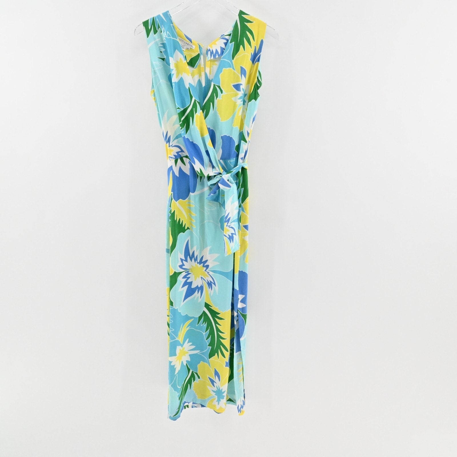 Vtg Maggy London Silk Maxi Dress Size 10 Floral Tropical Print Blue Sleeveless