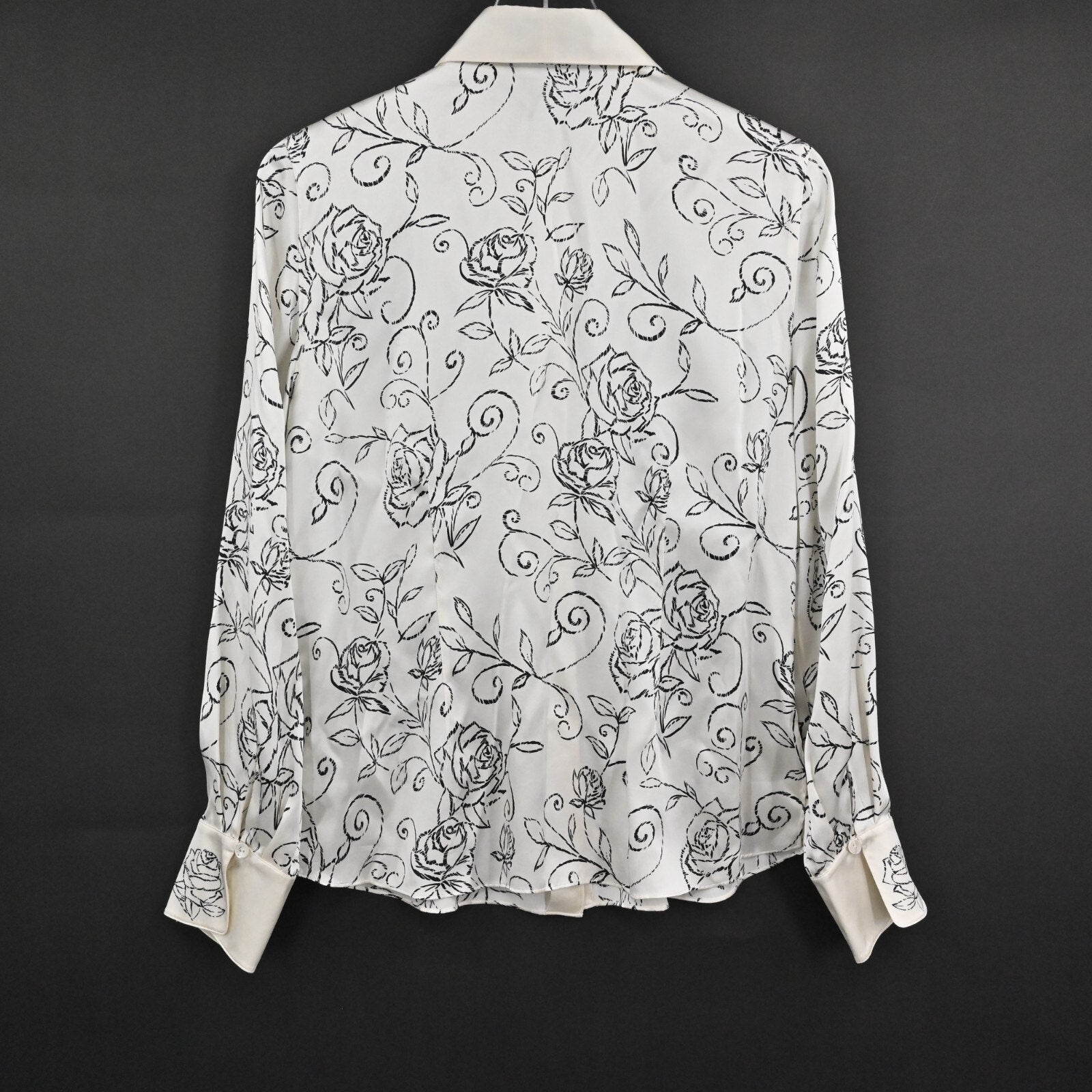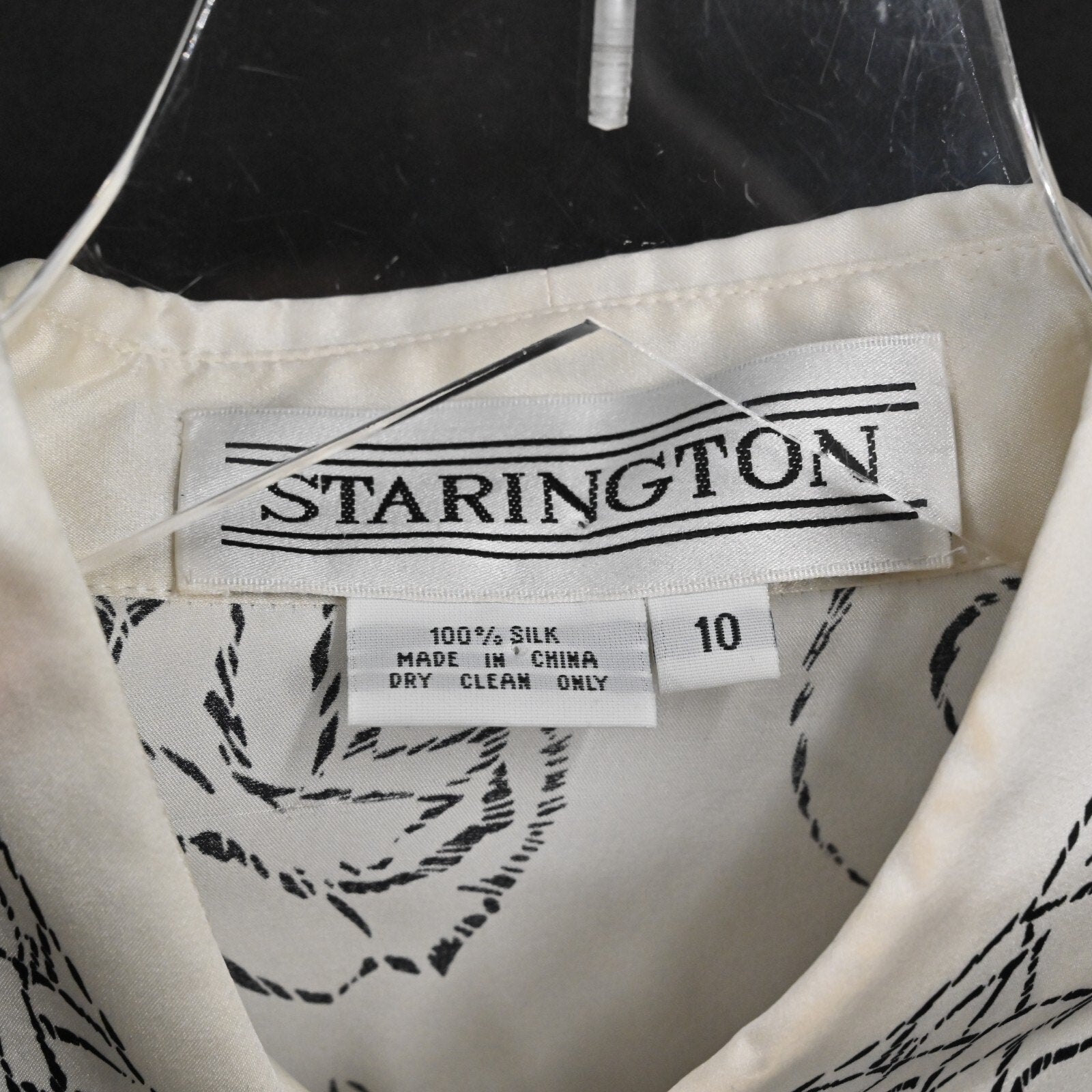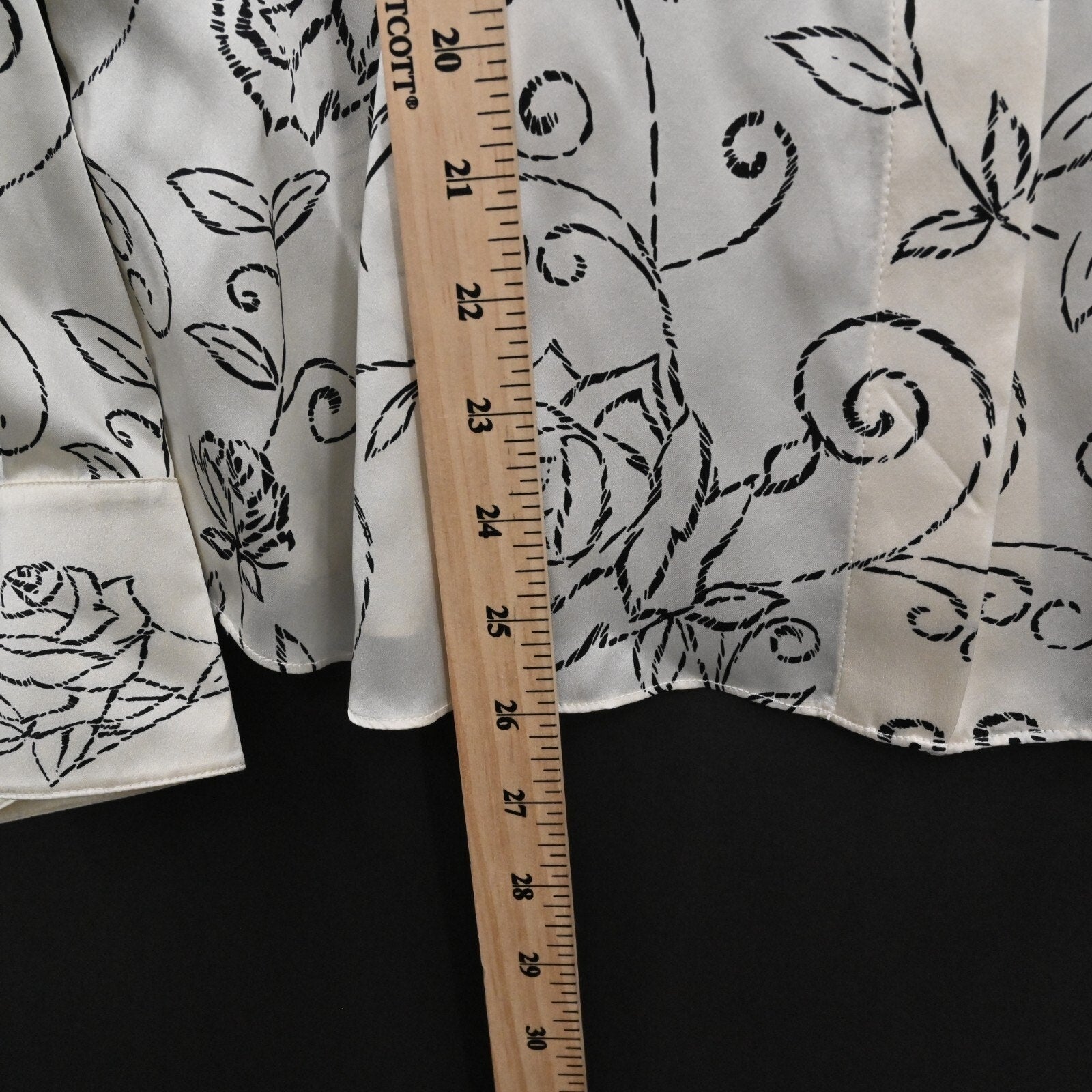 Vtg Womens Floral Silk Top Size 10 Satin Black Ivory Print Blouse STARINGTON 80s