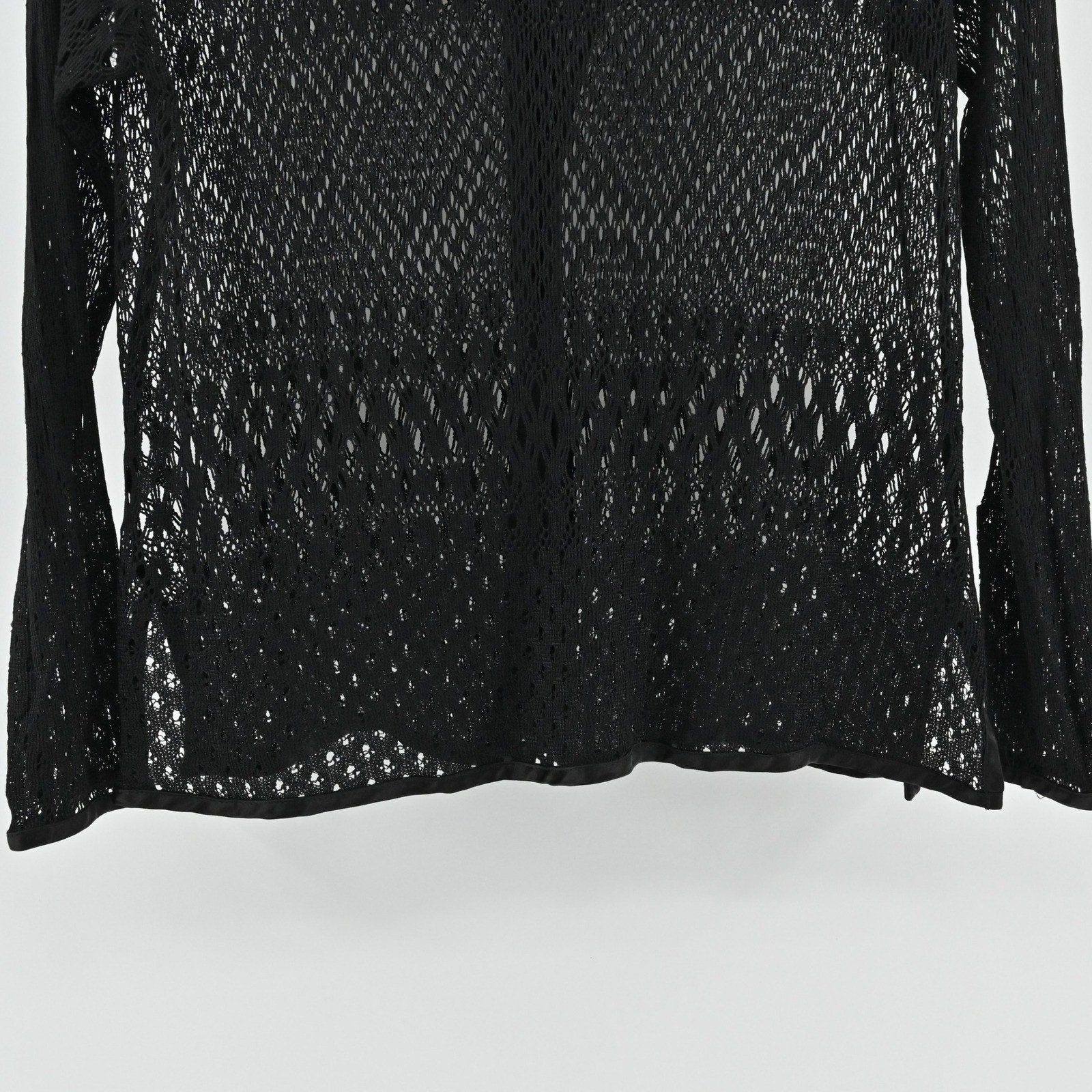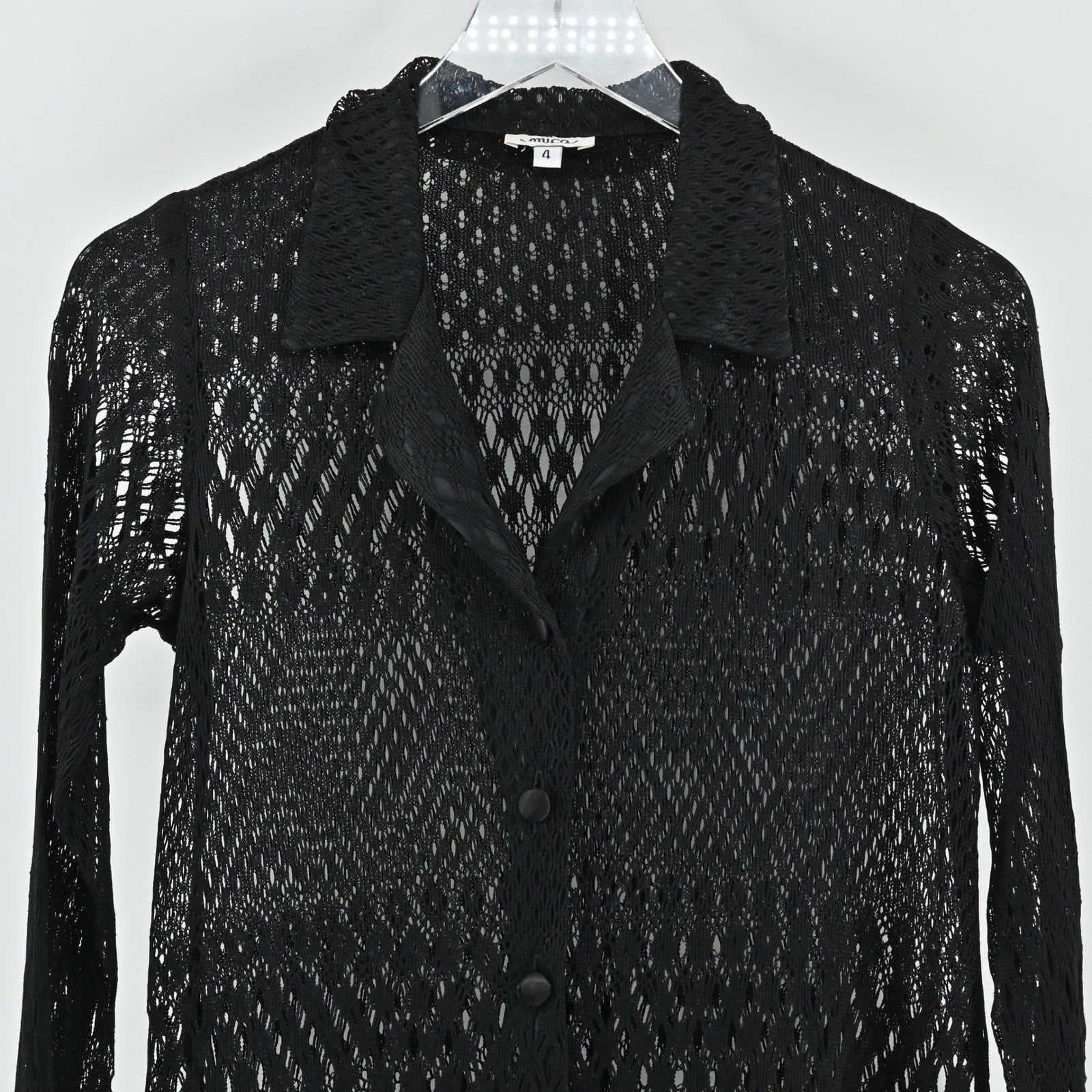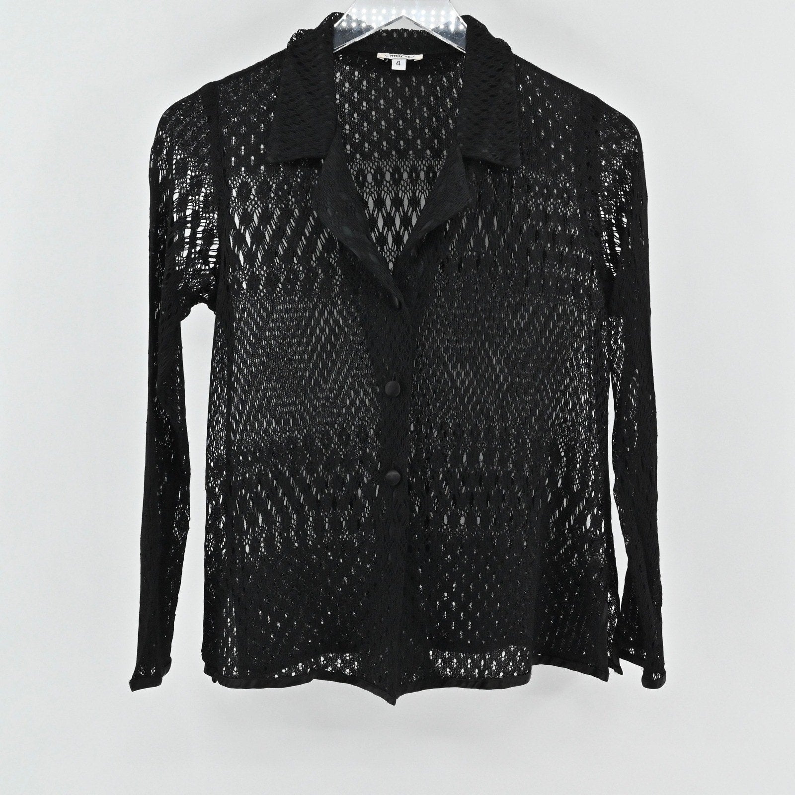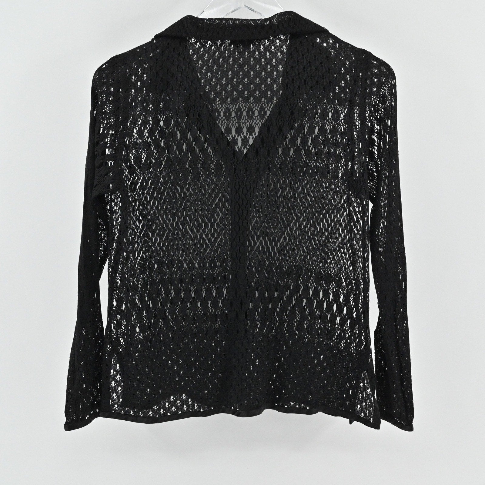 Vtg Y2k Mica Womens Black Knit Crochet Top Size 4 Sheer Mesh Button Long Sleeve