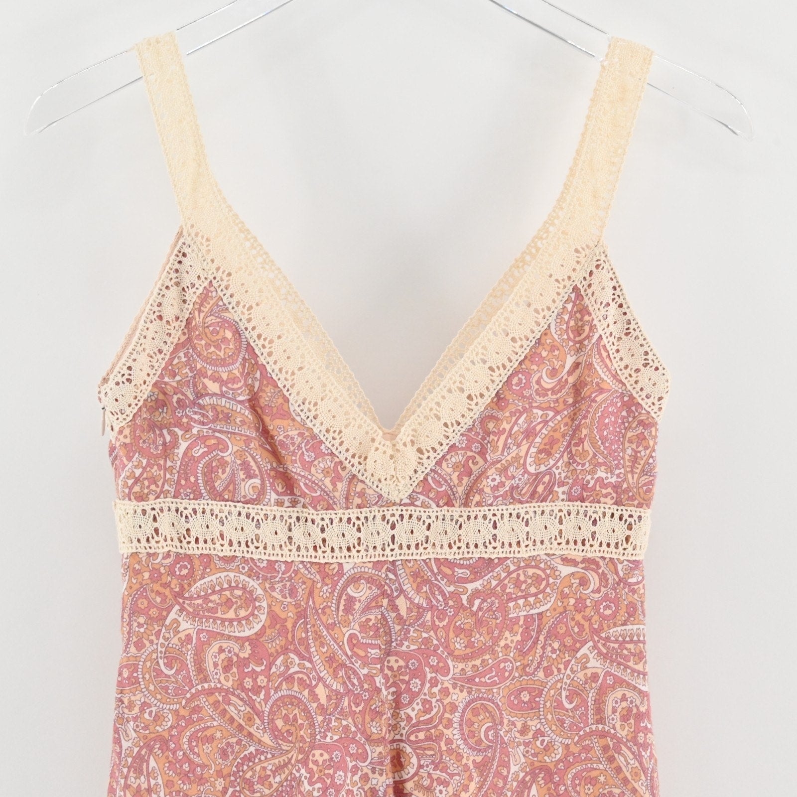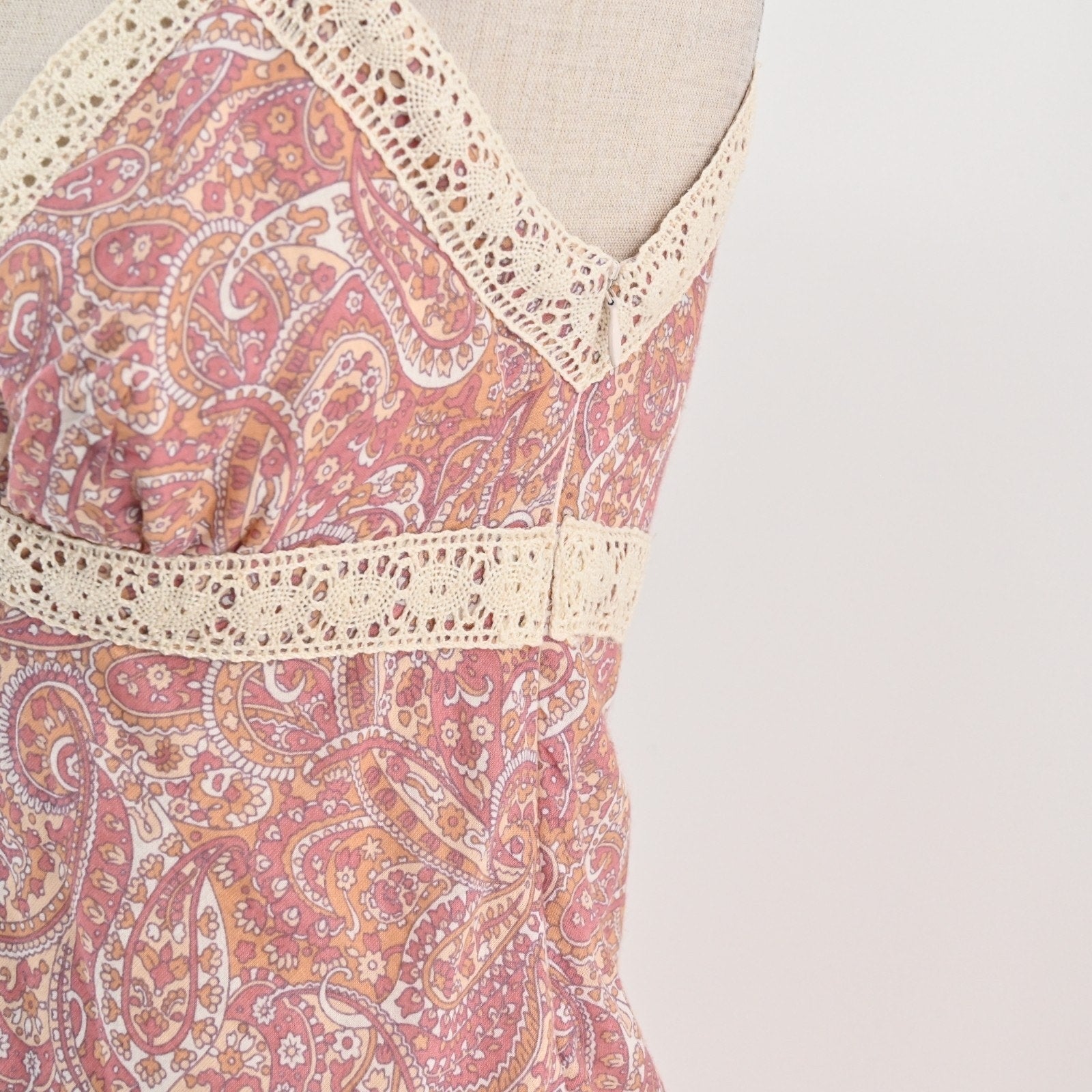Vtg Y2k Paisley Babydoll Dress Size 4 Petite Crochet Pink Sleeveless Mini VNeck
