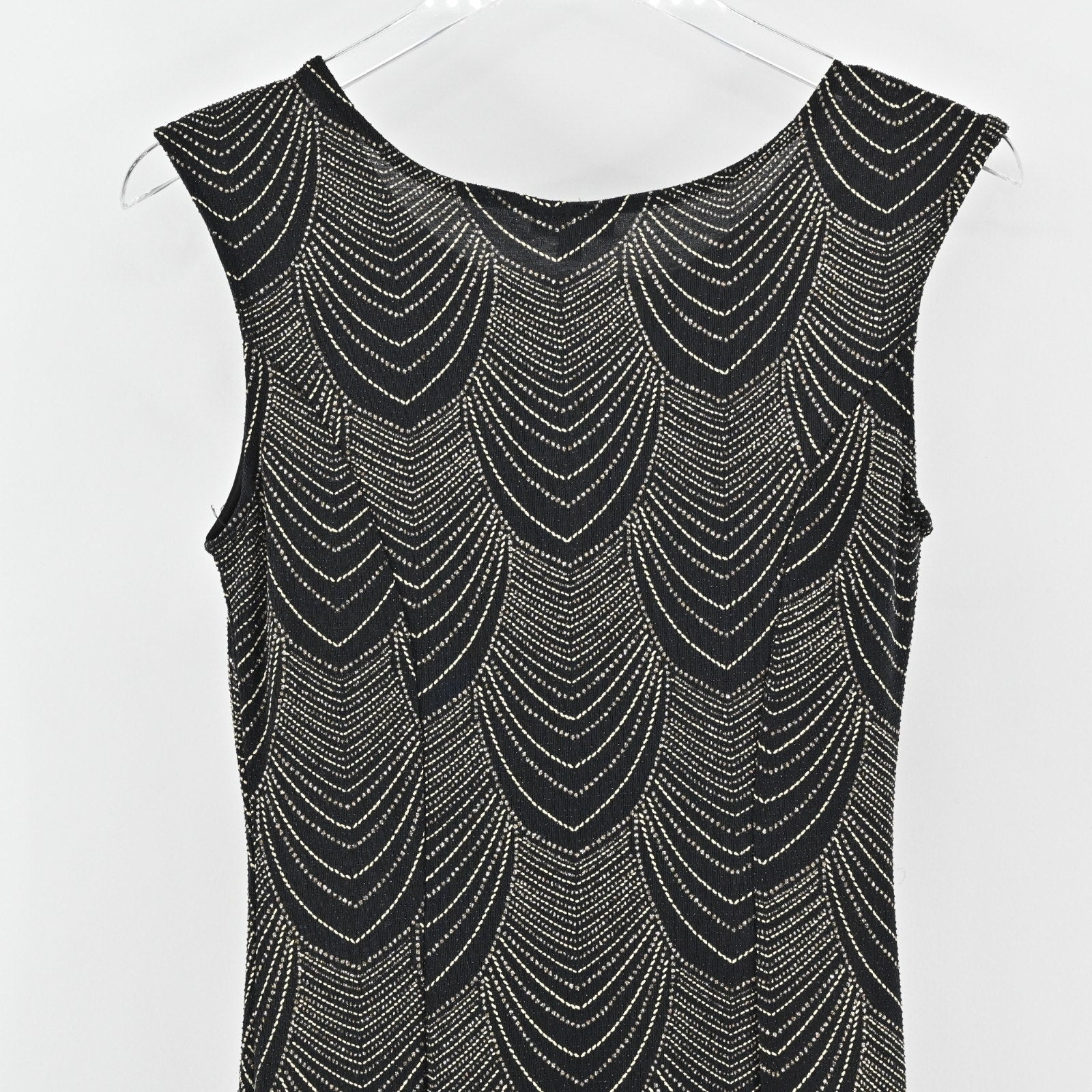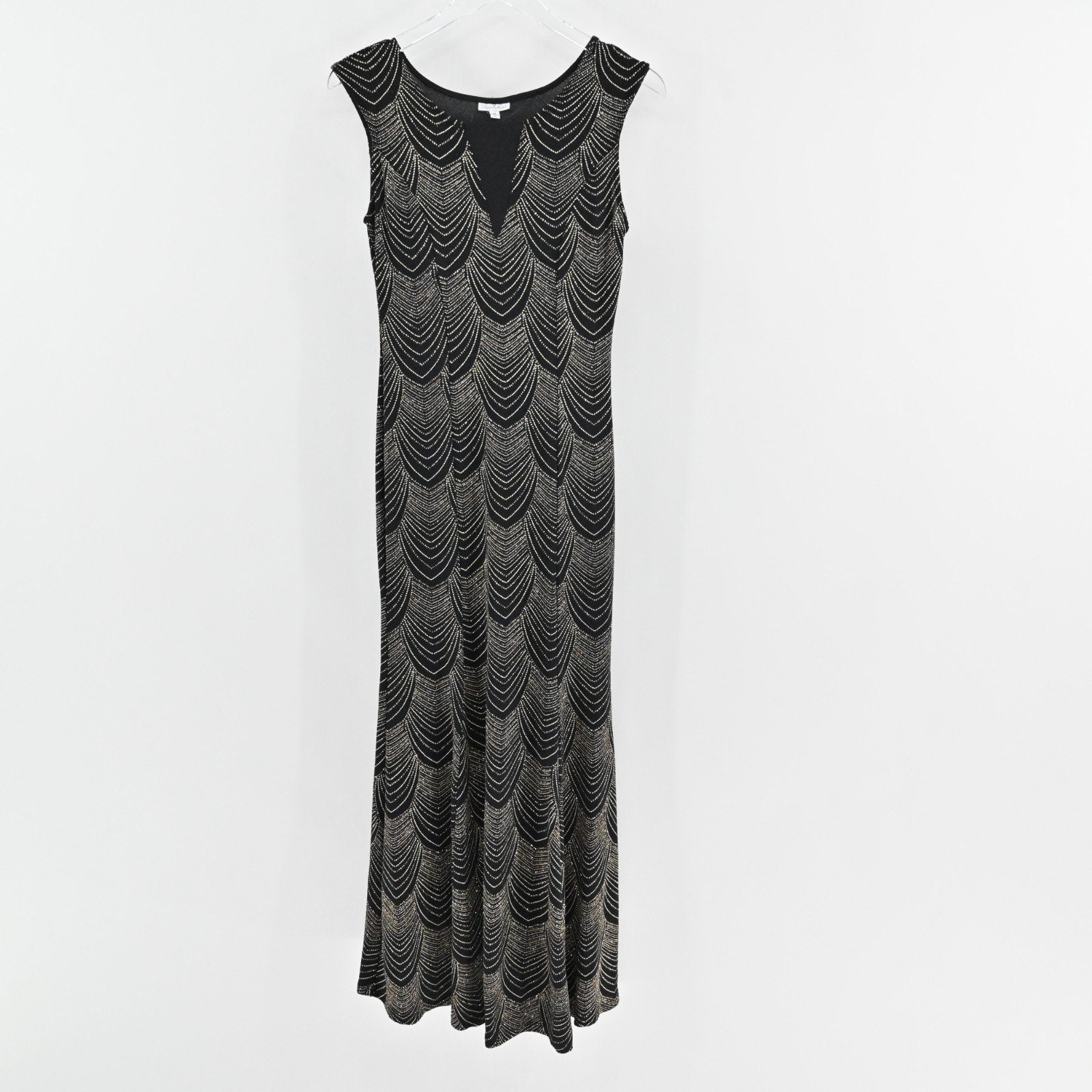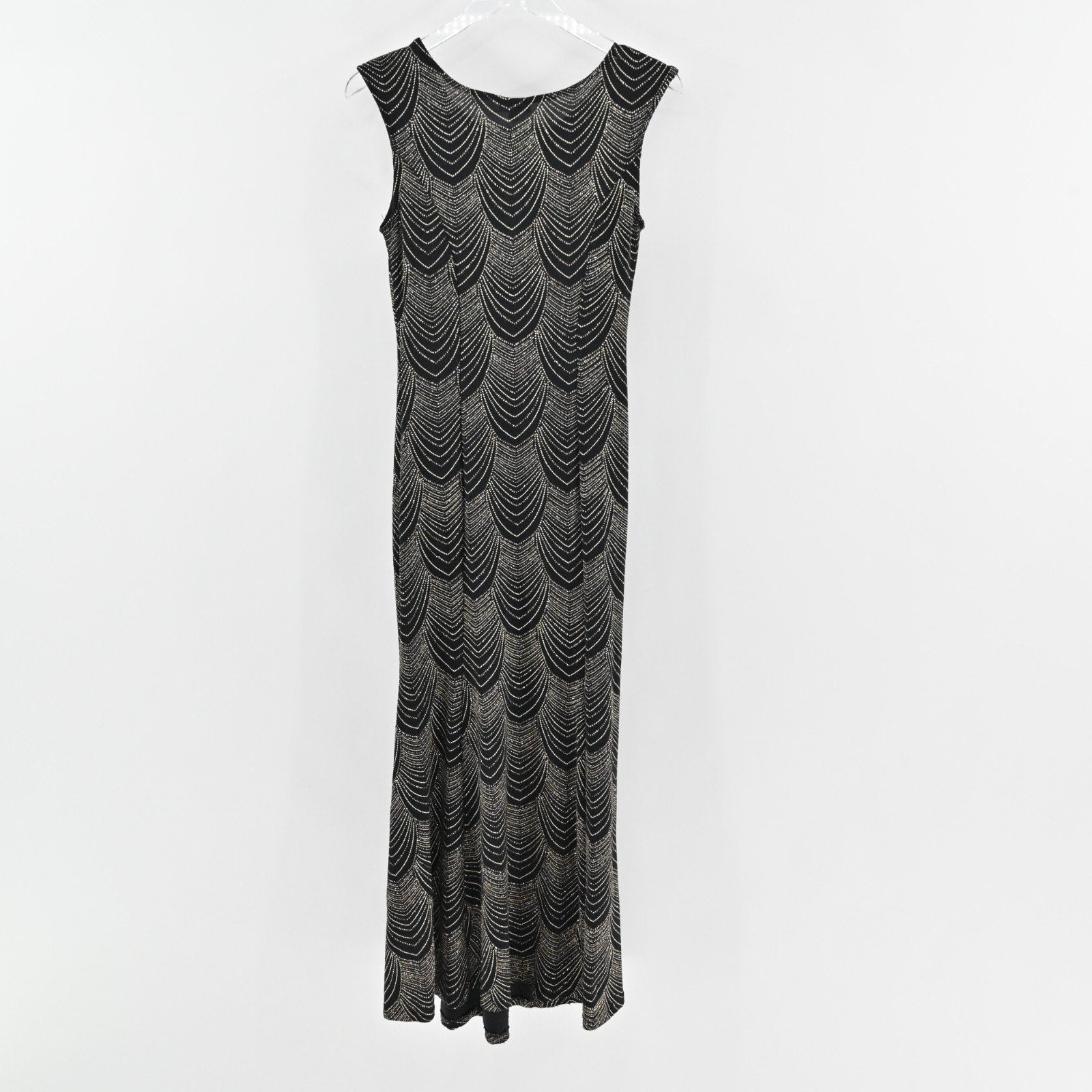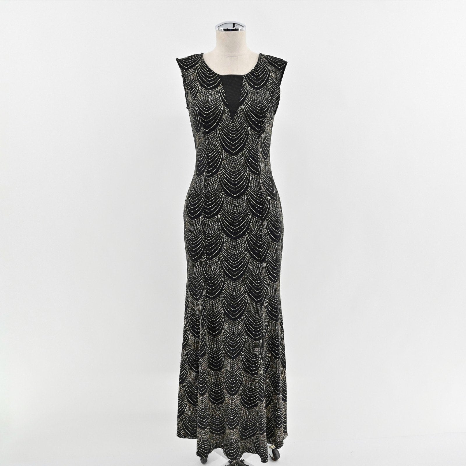 Style Profile: Vintage Lightweight Party Event Cocktail Black Tie Glitter Print Resort Sleek Elegant Classic Chic Shiny Statement Art Deco Inspired Vintage Glam Floor Length Formal Evening Dress Sleeveless Gown Metallic Thread Detail Scallop Pattern Black And Gold Keyhole Neckline Body Skimming Silhouette Roaring Twenties Great Gatsby Style Elegant Statement Piece Special Occasion Fashion