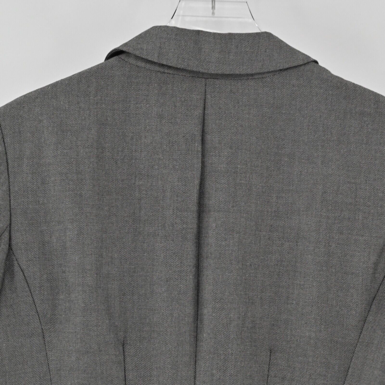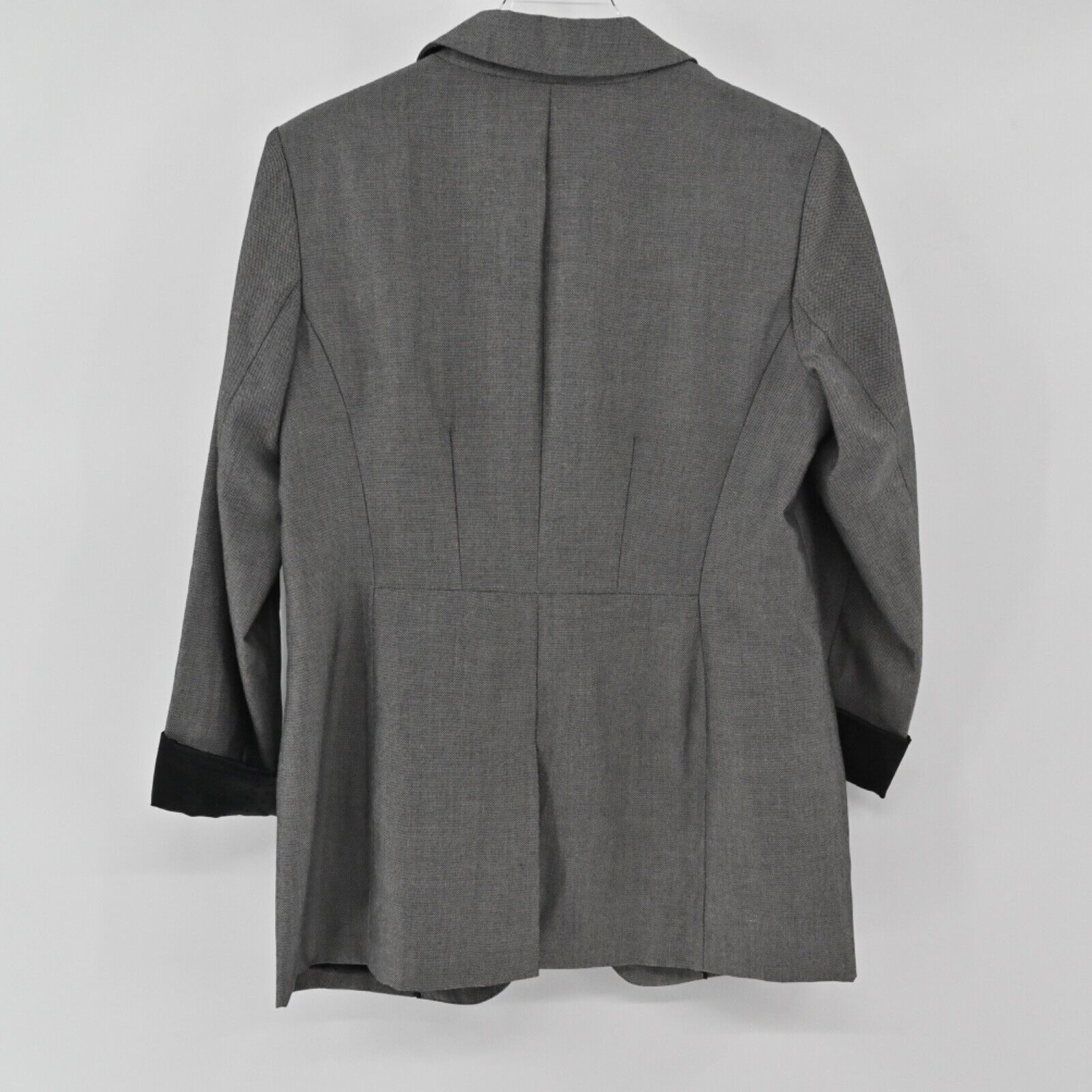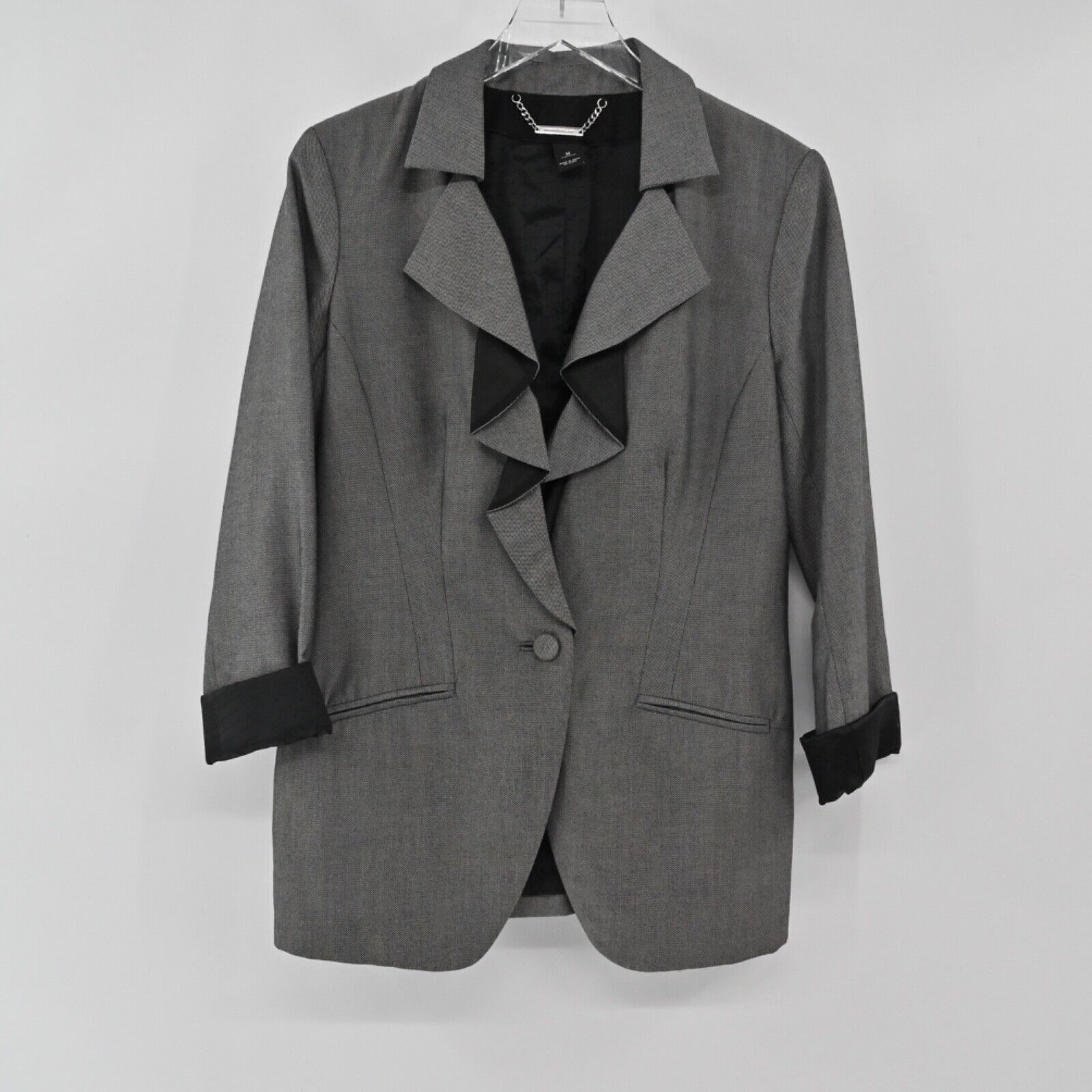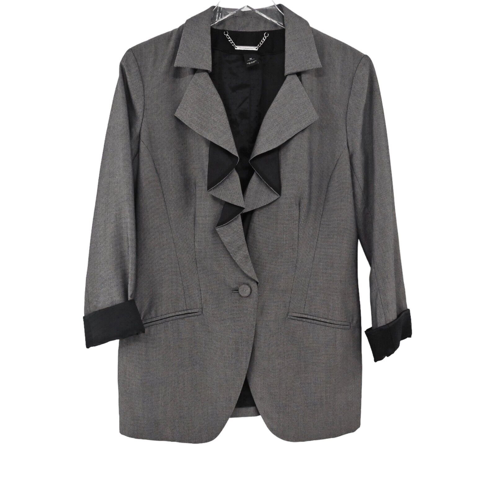 WHITE HOUSE BLACK MARKET Blazer Women's Size Medium Gray & Black Ruffle Front Cuffed 3/4 Sleeves Slash Front Pockets Single-Breasted 1 Button Closure Fully Lined Retro Office Career Preppy